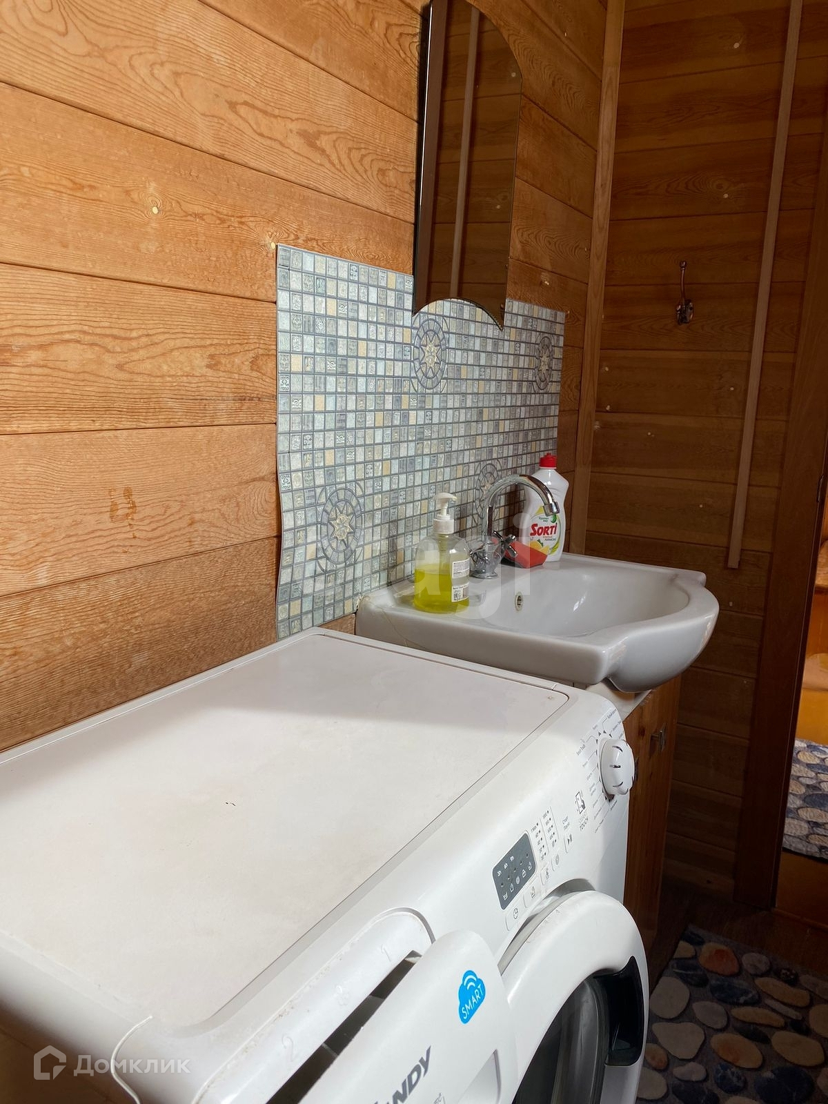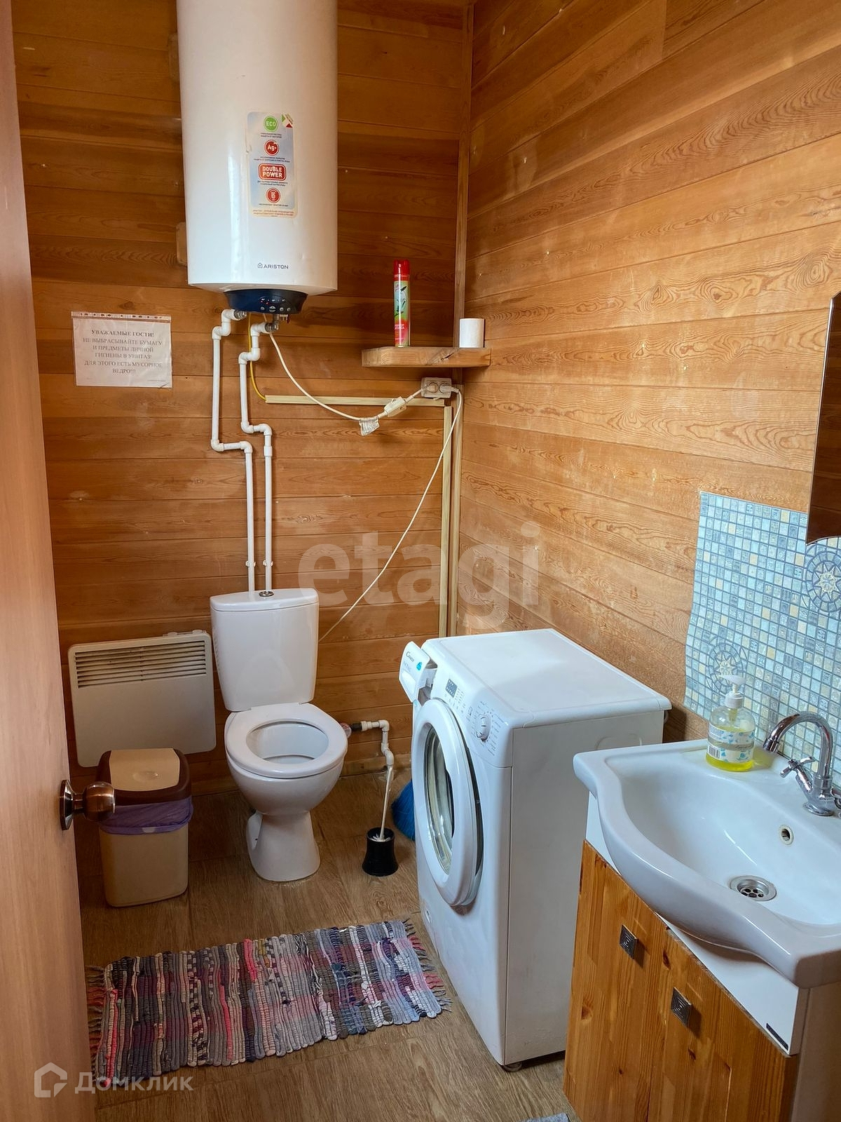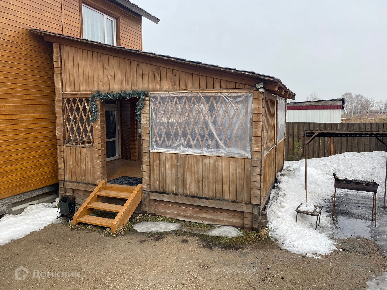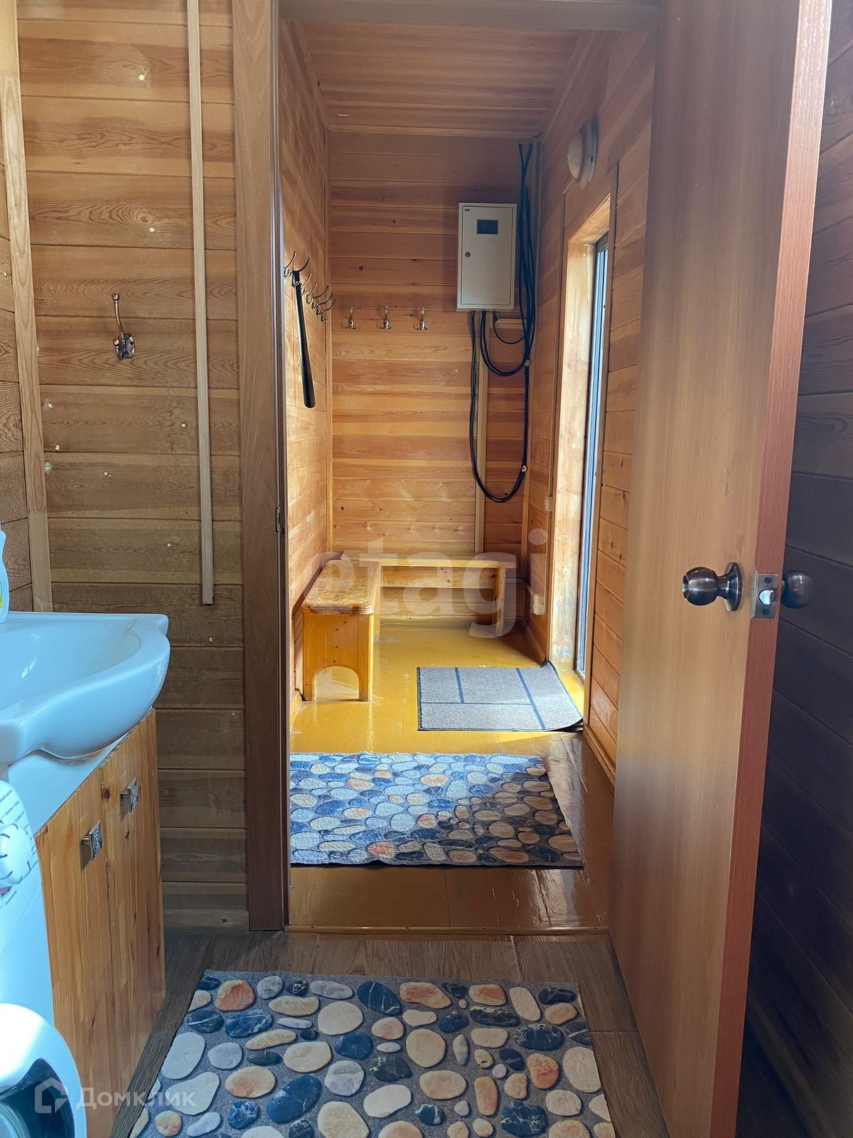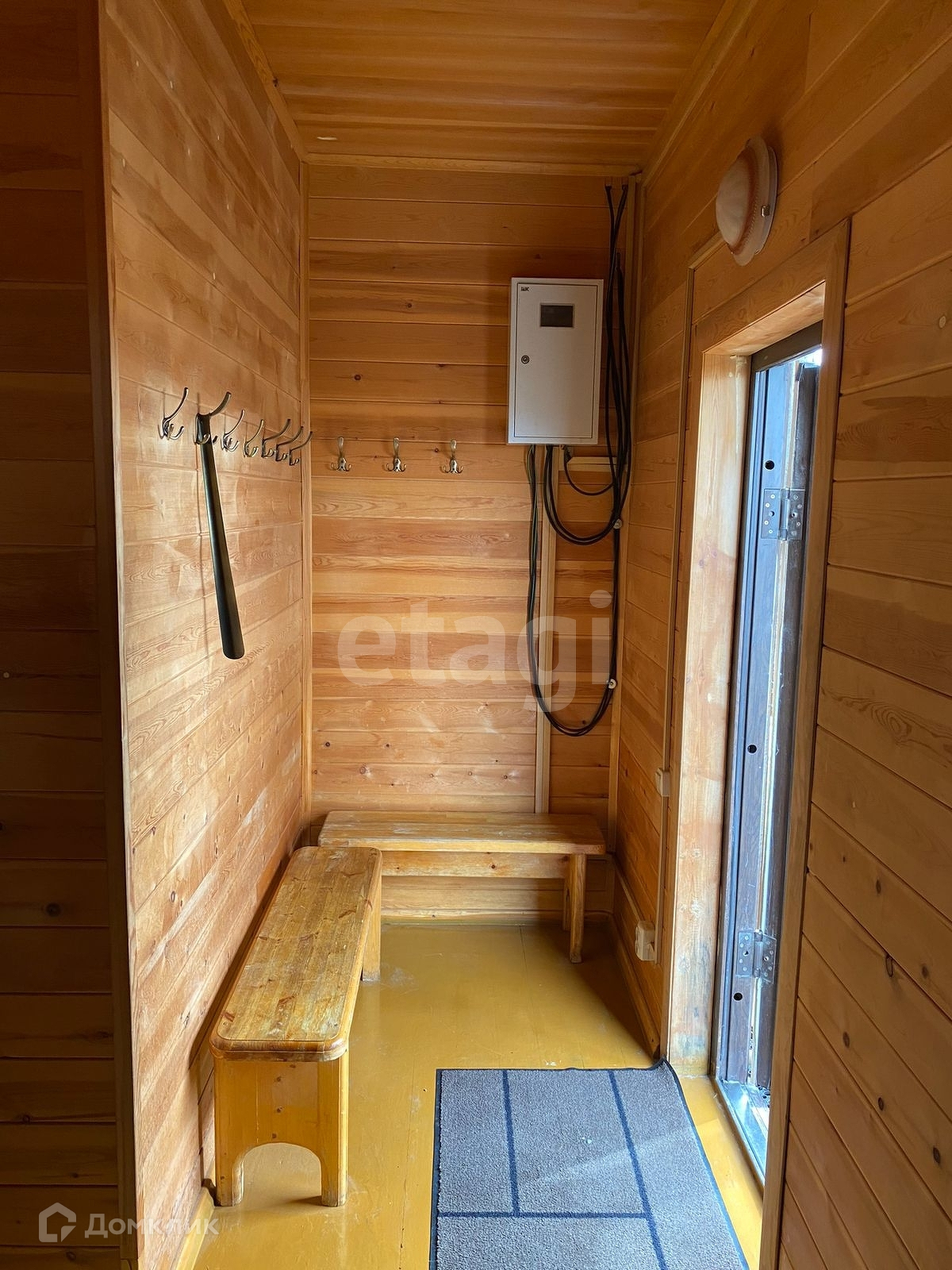 На первом этаже гостиная, санузел, душевая и баня; на втором этаже две спальни и холл с большим диваном. Есть небольшой дворик с беседкой и зоной для мангала.