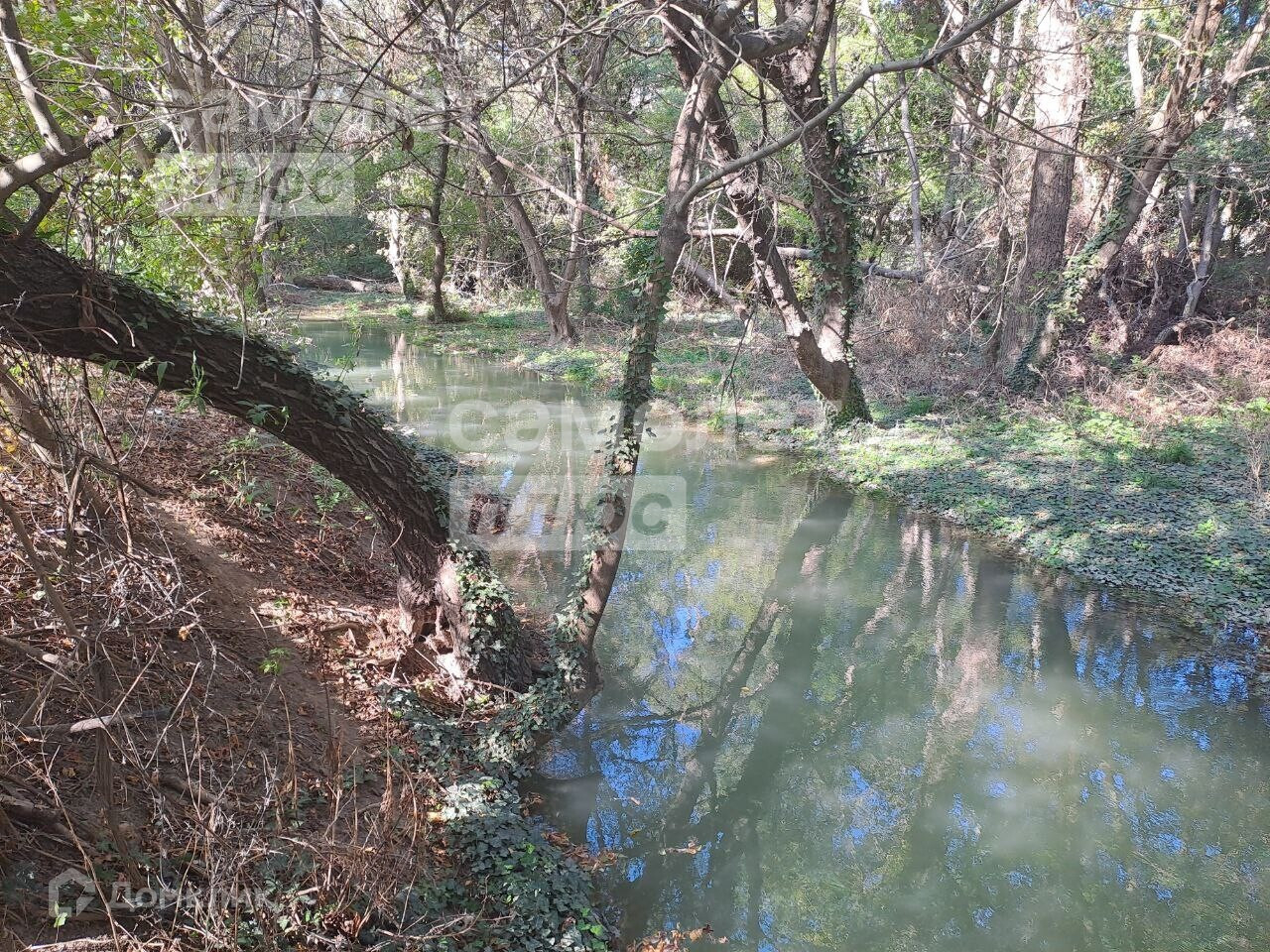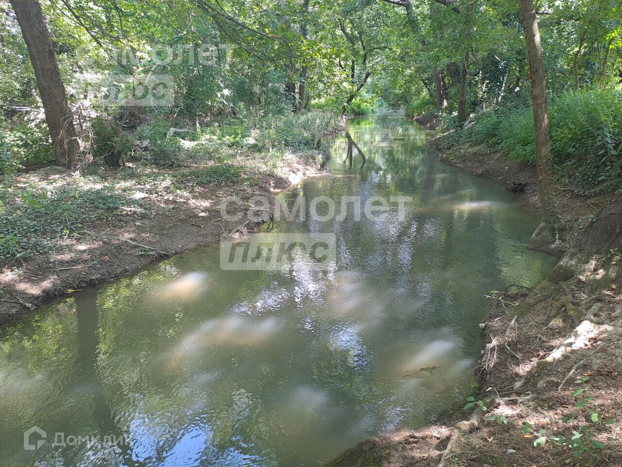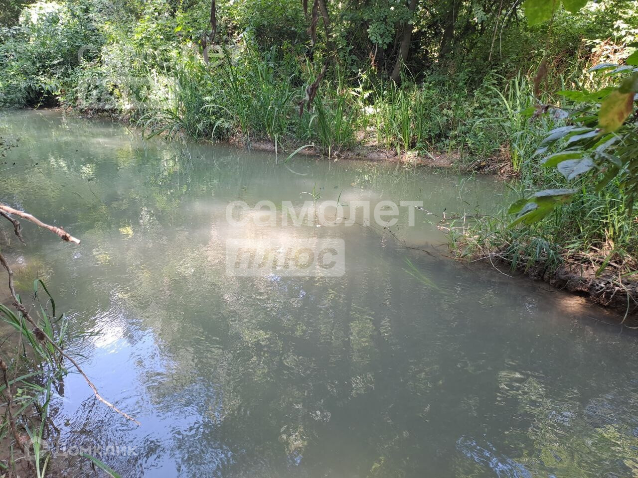Участок ровный, правильной формы, плодородная земля, рядом выход к речке, берега защищены от разливов в паводковый период. Много плодовых деревьев. Требуется расчистка участка.