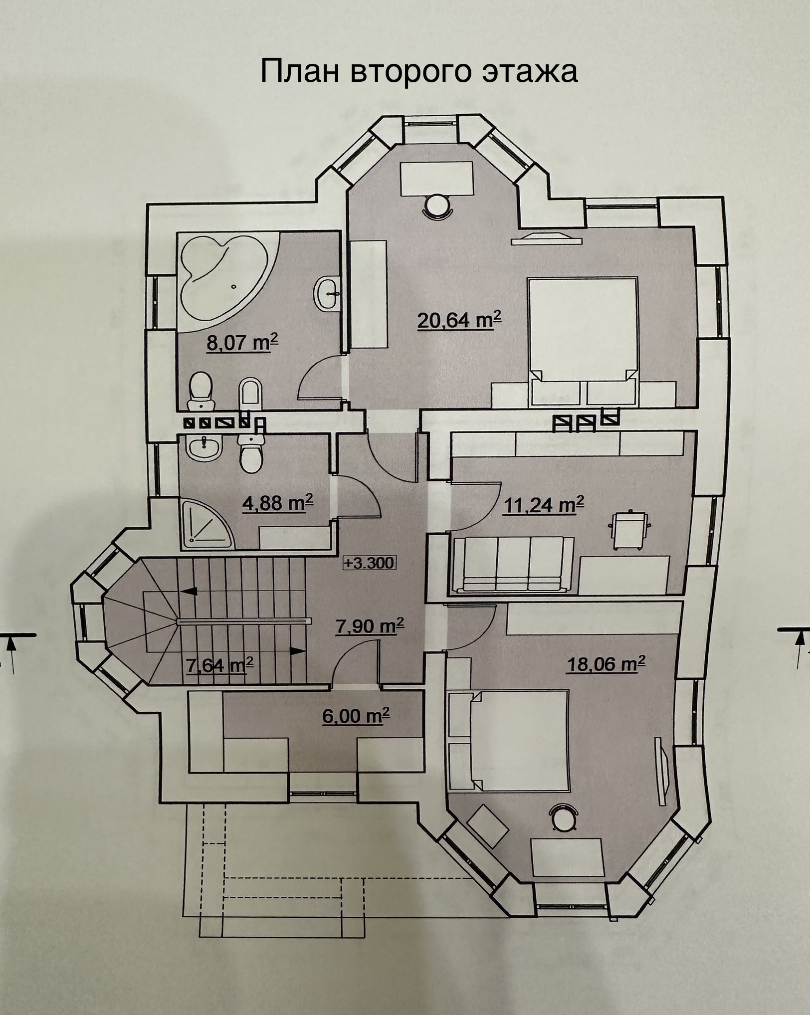 На втором этаже: лестничный марш, две спальни, офис (так же можно использовать под спальню), две ванные комнаты.