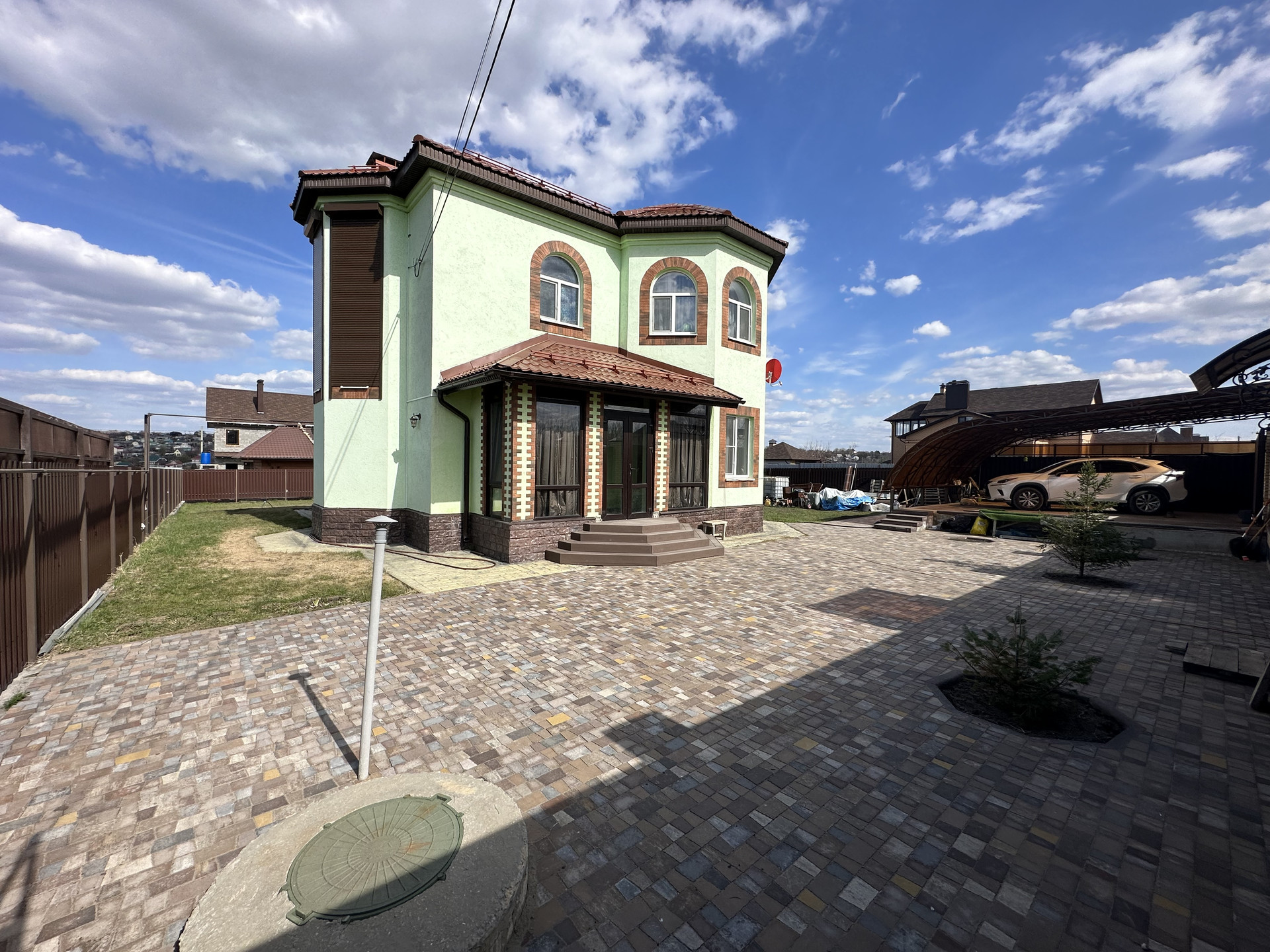 Площадка перед домом замощена плиткой. Крытая парковка на две машины, замощена плиткой, ворота 4 * 2,55 м, с эл.разводными, раздвижные.