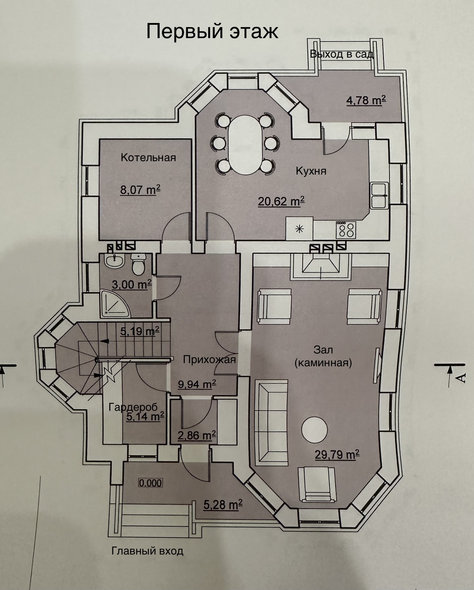 В доме, на первом этаже: зал-каминная, кухня, полноценное котельное помещение, туалетная комната, прихожая и гардеробная, лестничный марш на второй этаж расположен в арке.