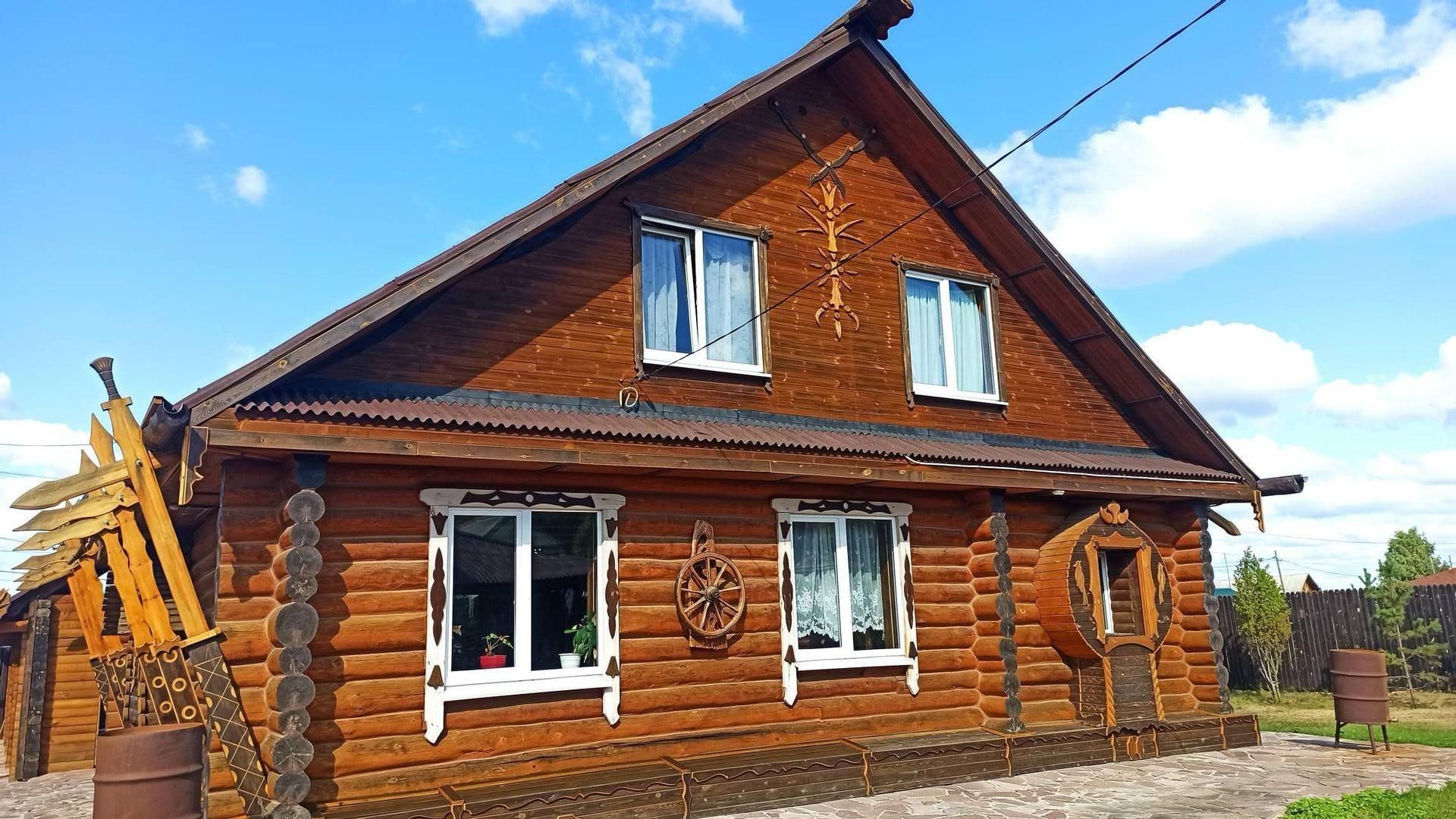 Продается уникальный загородный коттедж  созданный в русском стиле. Площадь дома 186 м² на участке 15 соток. Своя скважина с чистейшей водой, газовое отопление, септик. На участке построена все что нужно для приятного и полноценного отдыха за городом- прекрасная баня с террасой, беседка, место для барбекю, качели и детская площадка для детей, взрослые садовые деревья и кустарники. Все малые архитектурные формы выполнены в единой стилистике древнерусской усадьбы. Единственный в своем роде терем создан из оцилиндрованного бревна, коттедж полностью обставлен авторской мебелью, кухней а так же комфортабельная ванная комната .  Спутниковое ТВ и интернет.Большой навес позволяет поставить 2 больших автомобиля.  Участок с домом  расположен в центре благоустроенного поселка Сарапулка.  К Вашим услугам городская инфраструктура поселка, асфальтовая дорога, супермаркеты, аптеки, рынок и прочие блага цивилизации буквально в нескольких минутах ходьбы от соснового леса с грибами и ягодами. Дорога до Екатеринбурга занимает 30 минут по новому шоссе.
