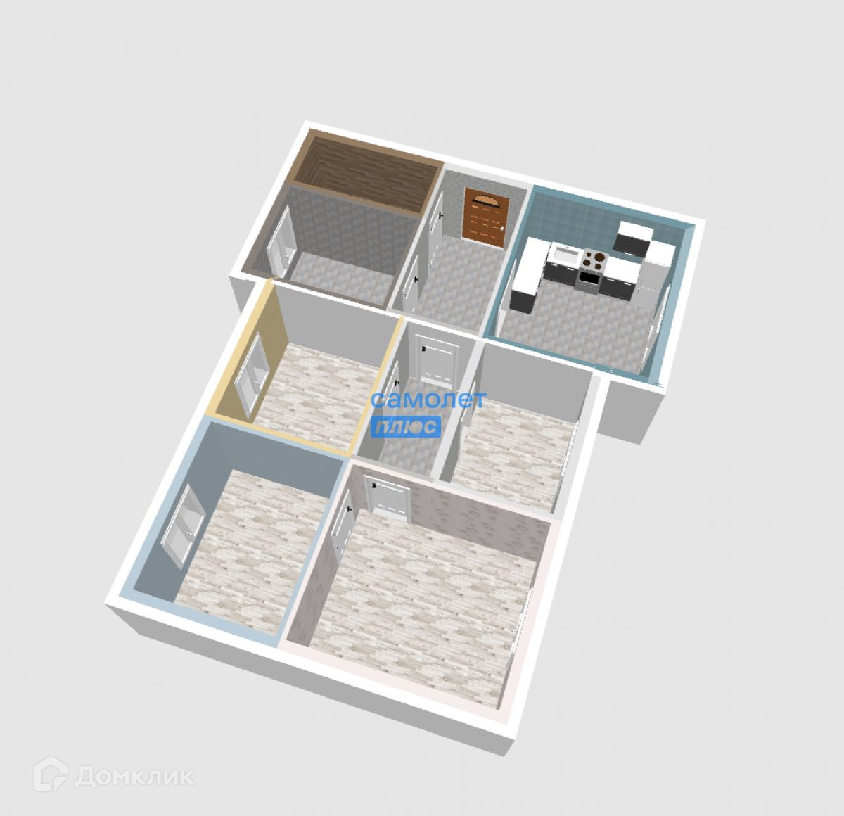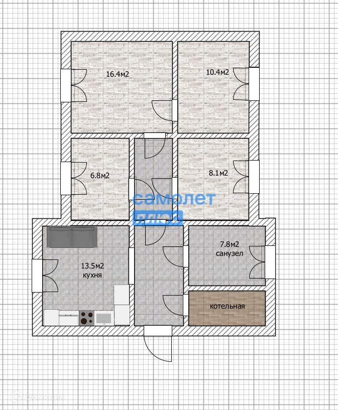 Состоит из 4 жилых комнат, большой кухни, совмещенного просторного санузла, котельной и коридора.