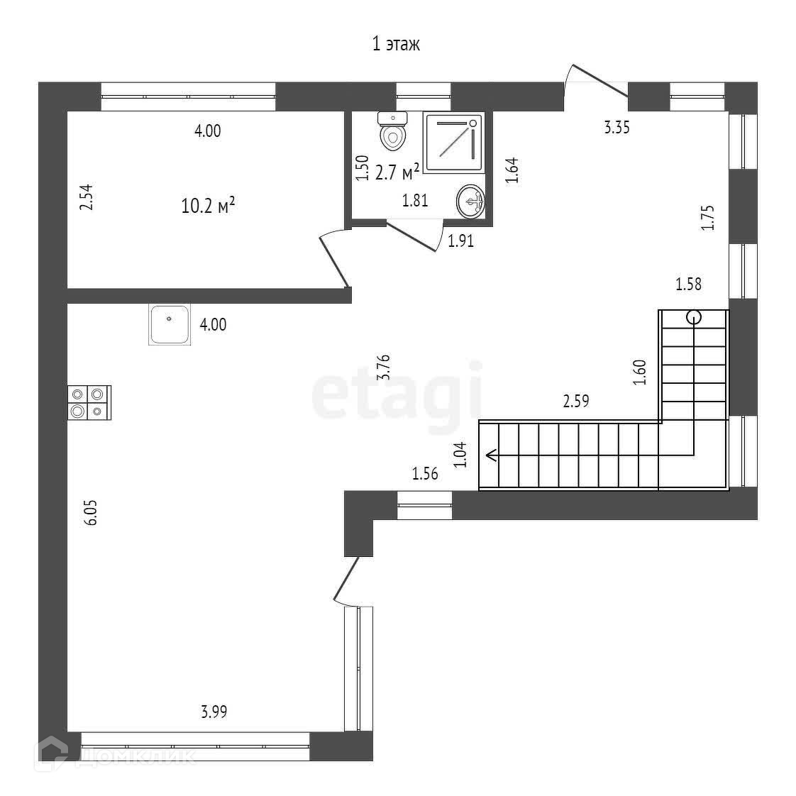 На 1 этаже расположены: кухня-гостинная, прихожая, санузел.