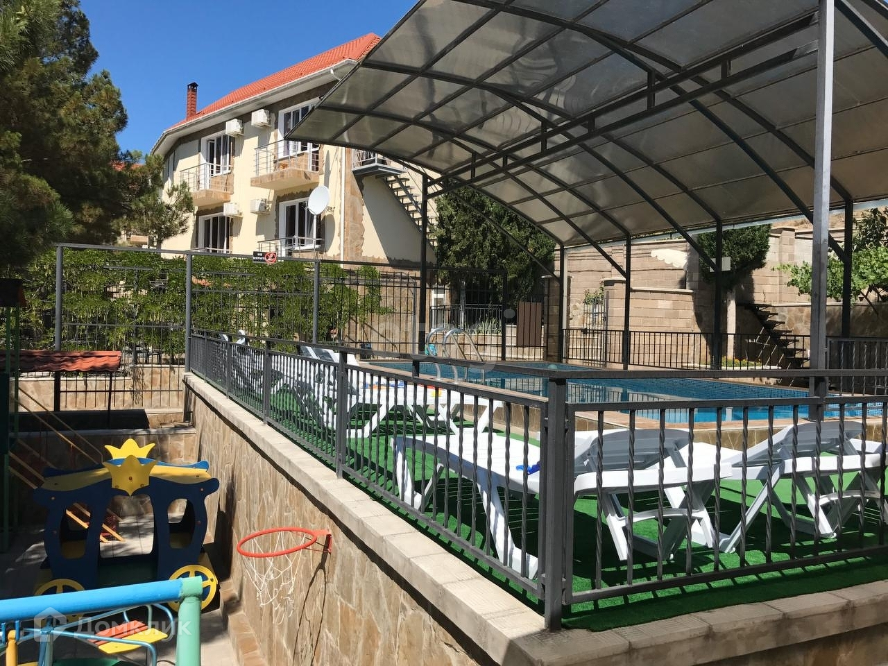 На территории также есть паркинг для личного авто и отдыхающих, кафе на 80 посадочных мест, бассейн, детская площадка, сауна и зона барбекю. Отель огражден по периметру и оборудован видеонаблюдением. В персиковом саду на территории растут 30 деревьев, а также инжир, гранат и клубничные грядки.