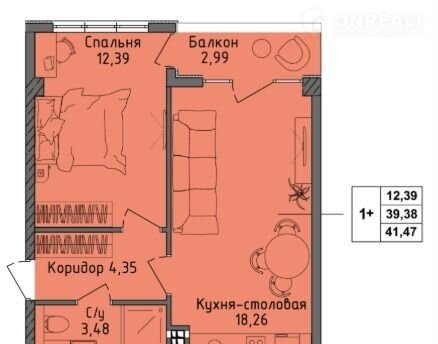 Общая площадь 39.4 м2