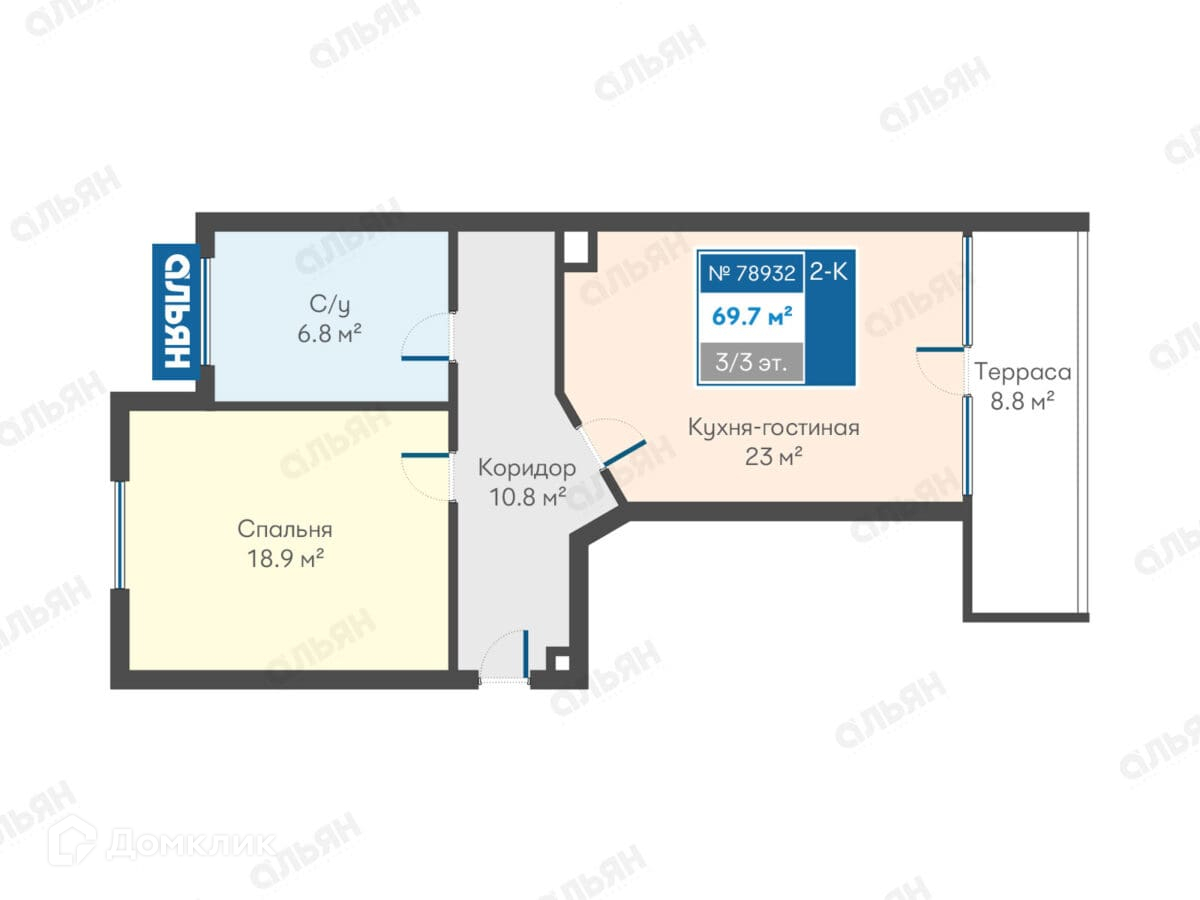 Кухня-гостинная 23 м2, санузел 6,8 м2, терраса 8,8 м2, спальня 18,9 м2, коридор 10,8 м2.