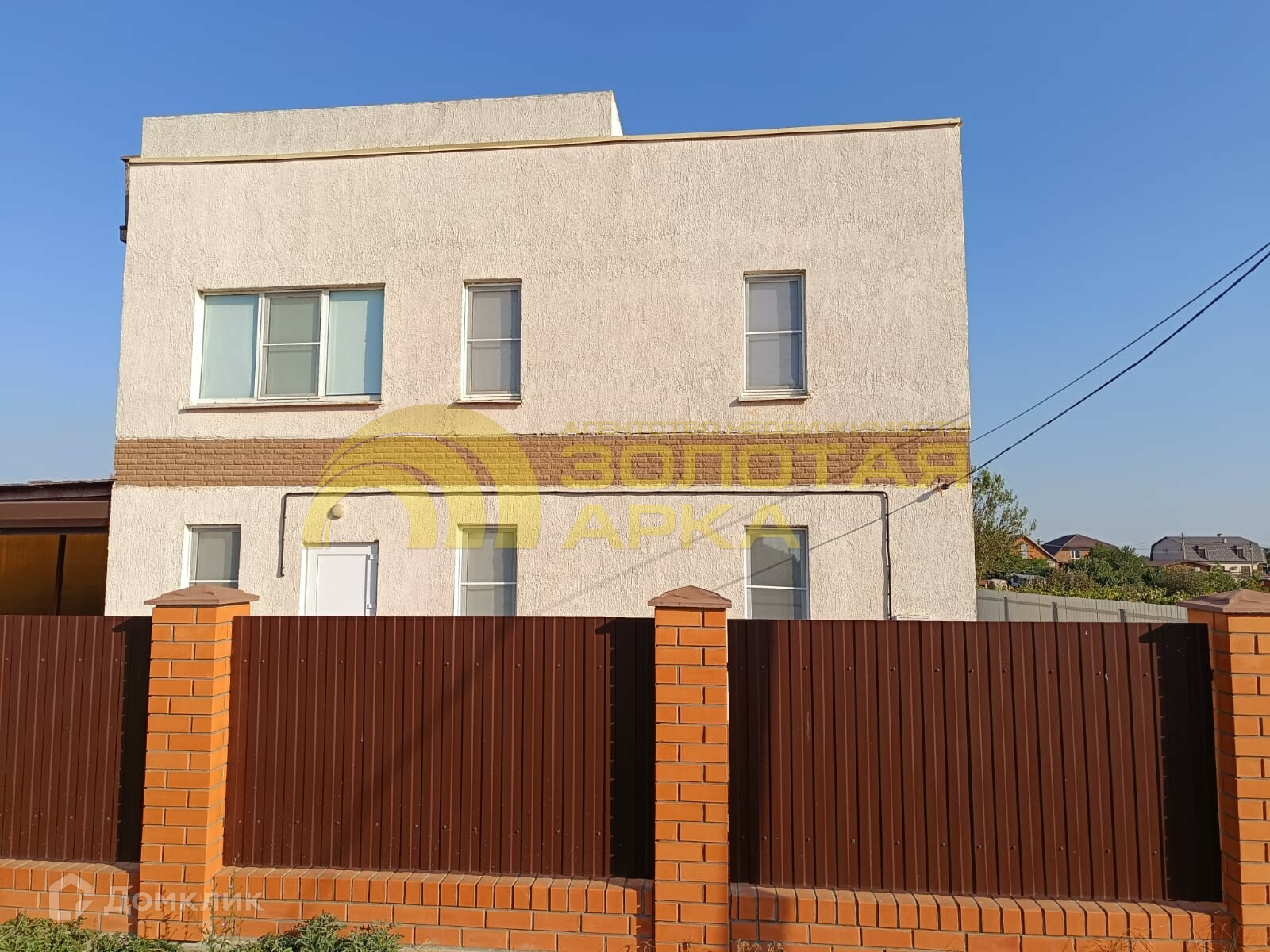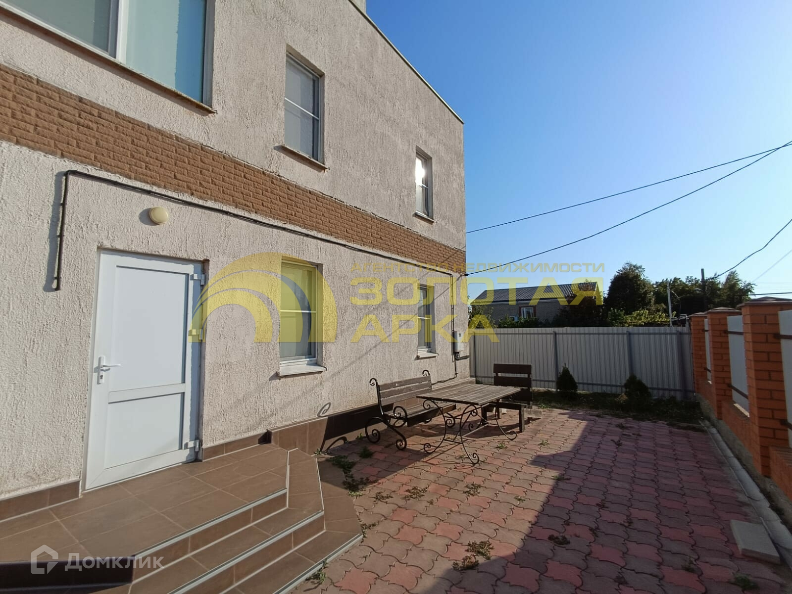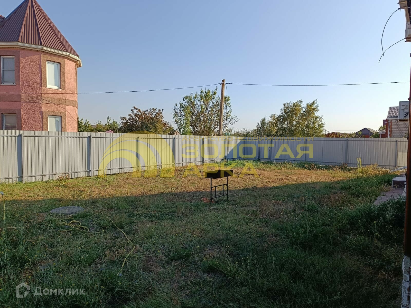 Дом огорожен забором из металлопрофиля с воротами и калиткой.