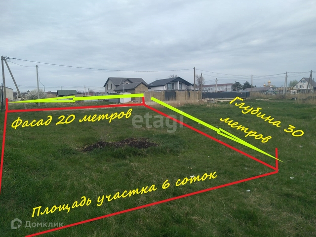 Земельный участок ровный, правильной прямоугольной формы 6 соток, фасад 20 метров, глубина 30 метров.