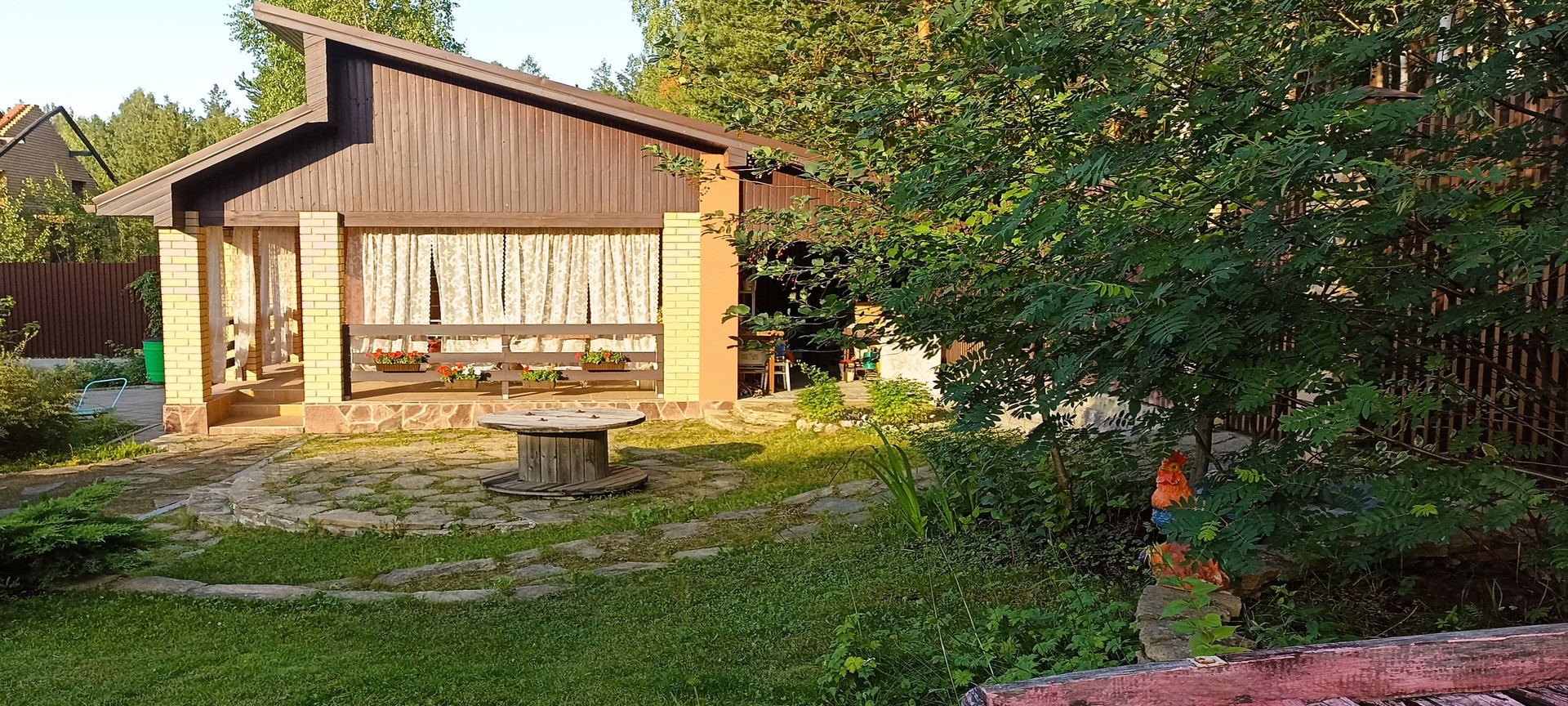 Дом огорожен капитальным забором. Двор выложен плиткой. Есть уютное место для отдыха – терраса с подведенными теплым полом, водоснабжением и возможностью автономного проживания.