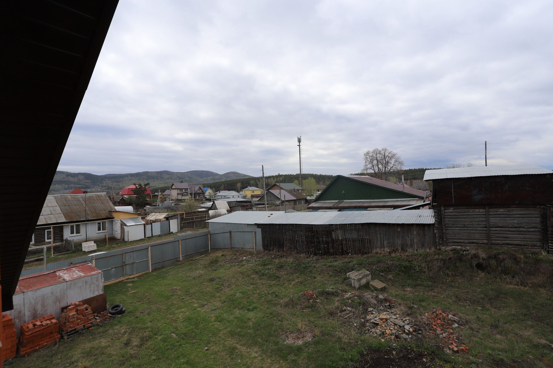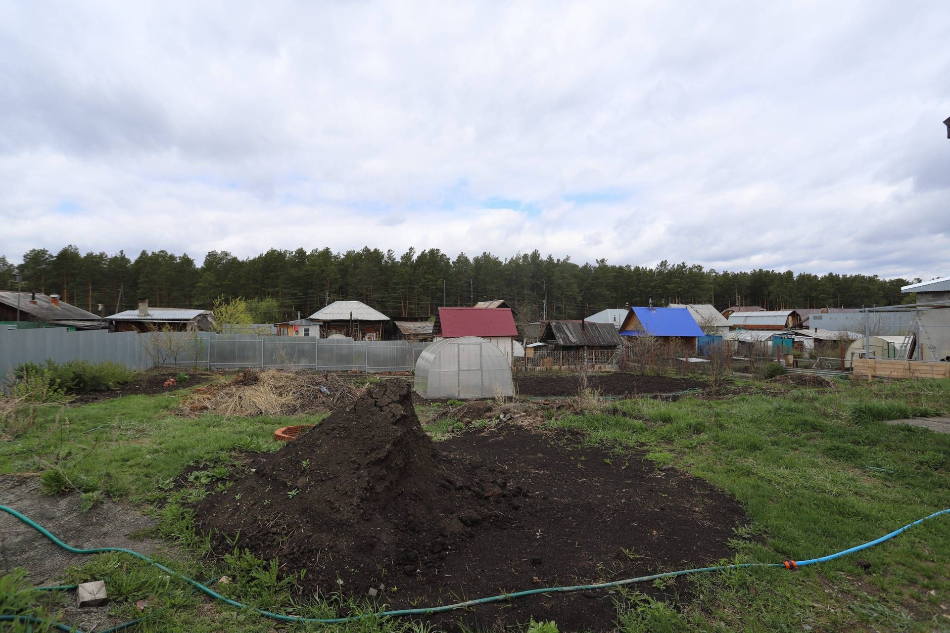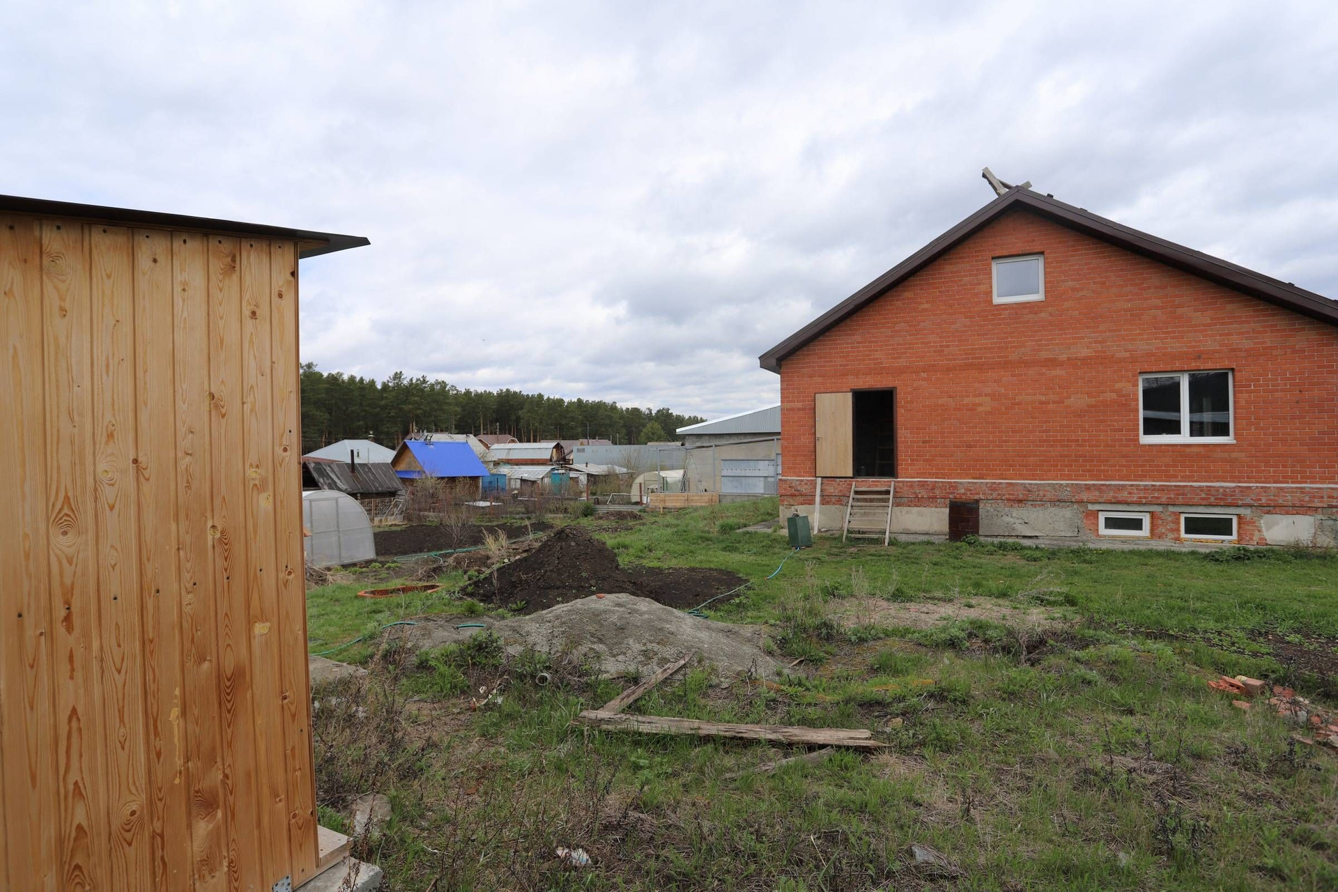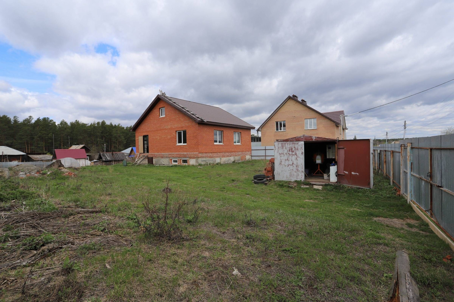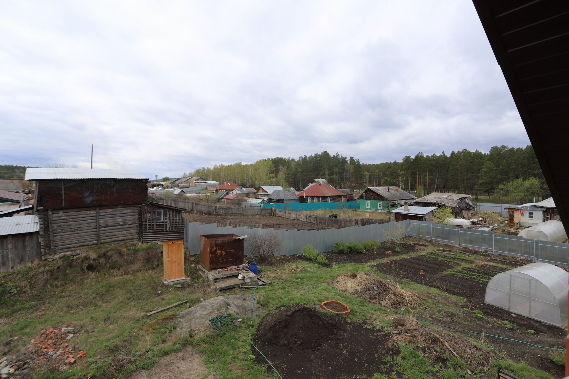 На участке есть железный гараж "ракушка", деревянный туалет.
