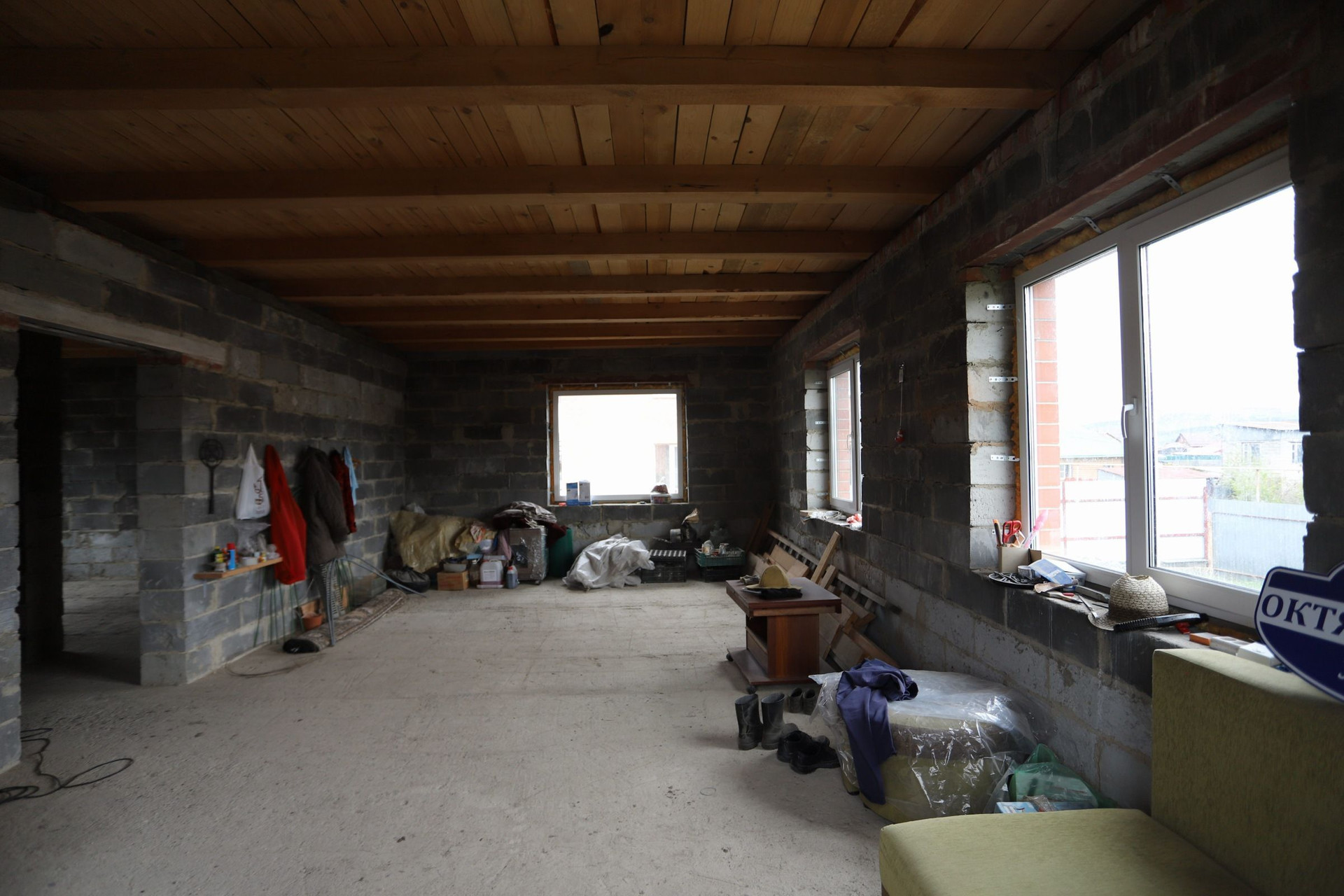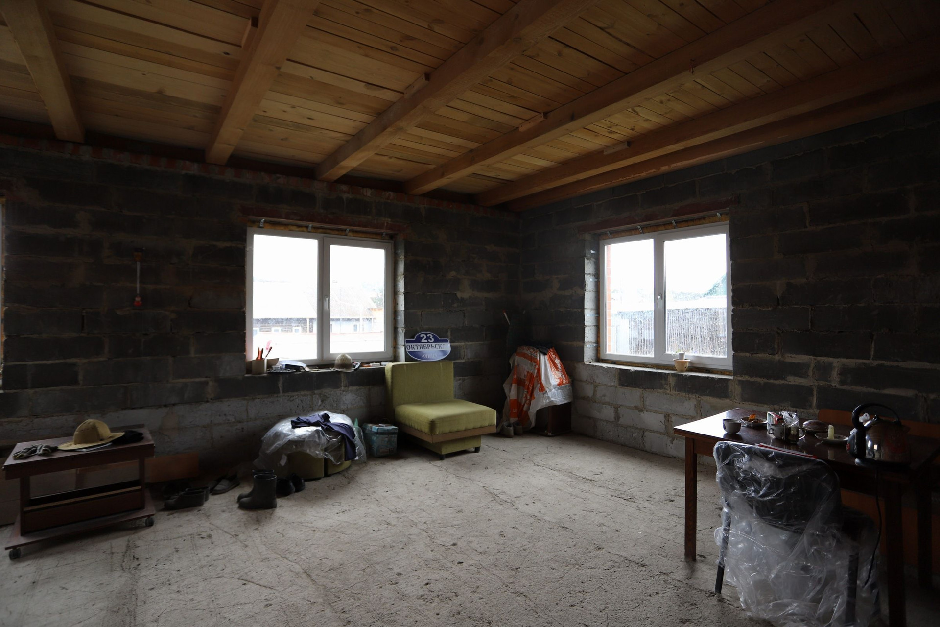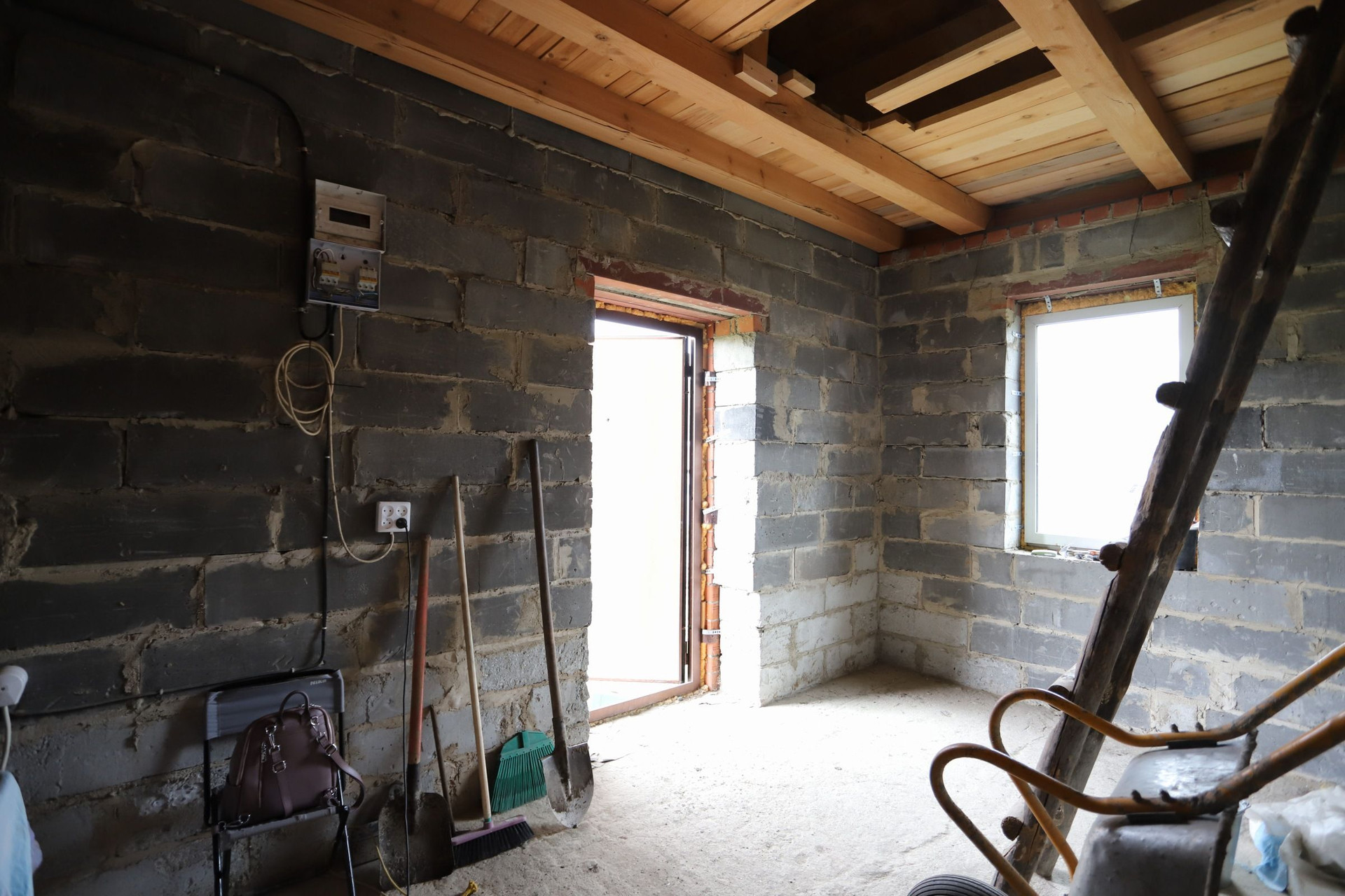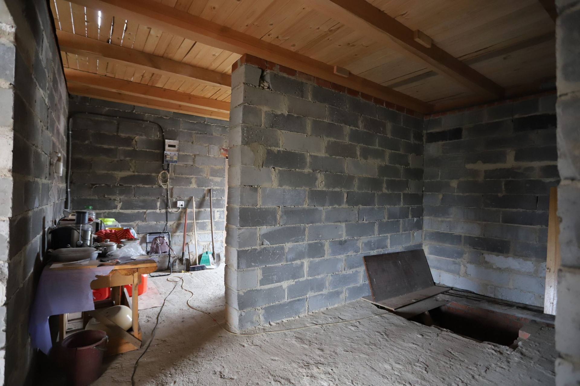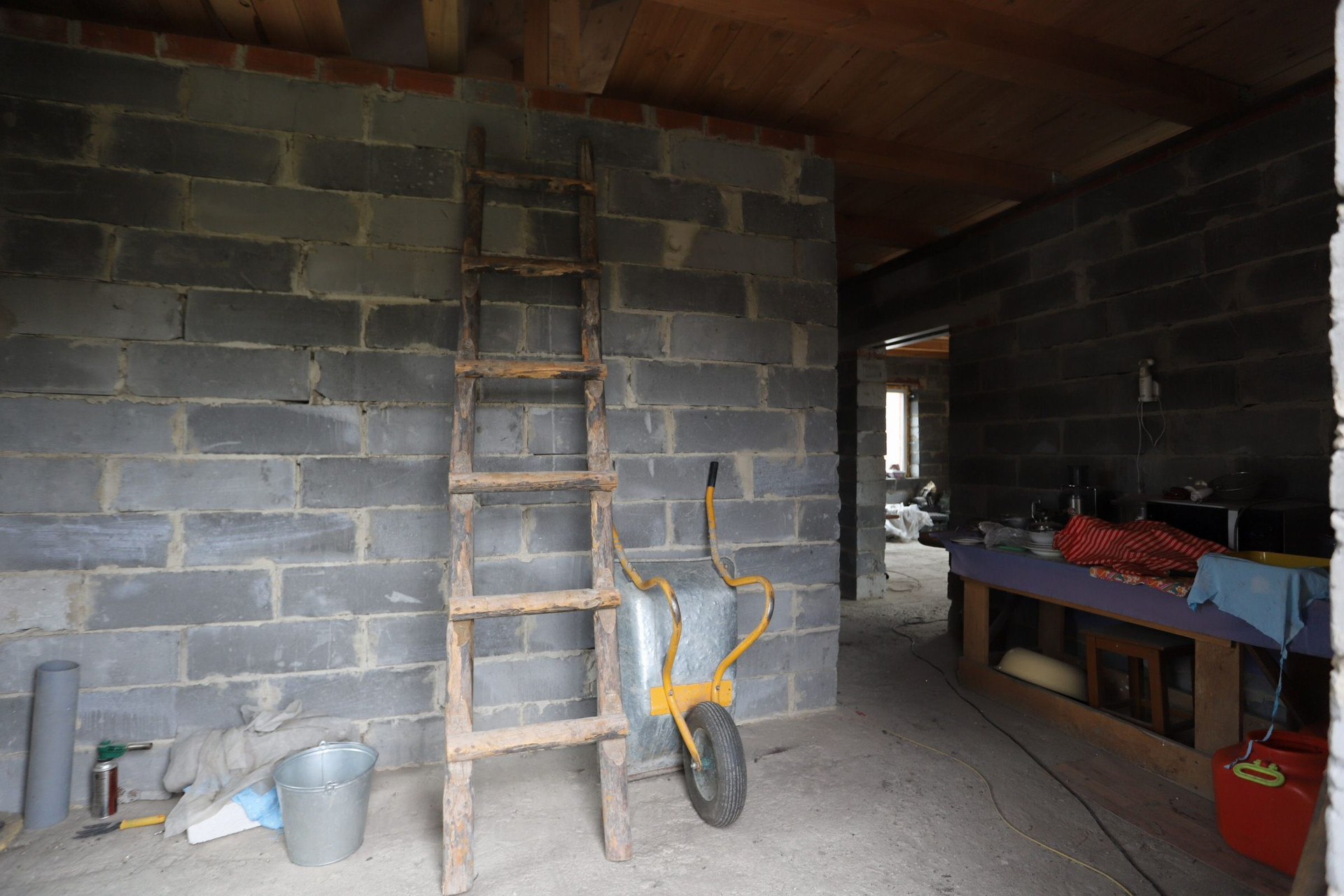 Оставляем бетономешалку, разный инвентарь и остатки кирпича.