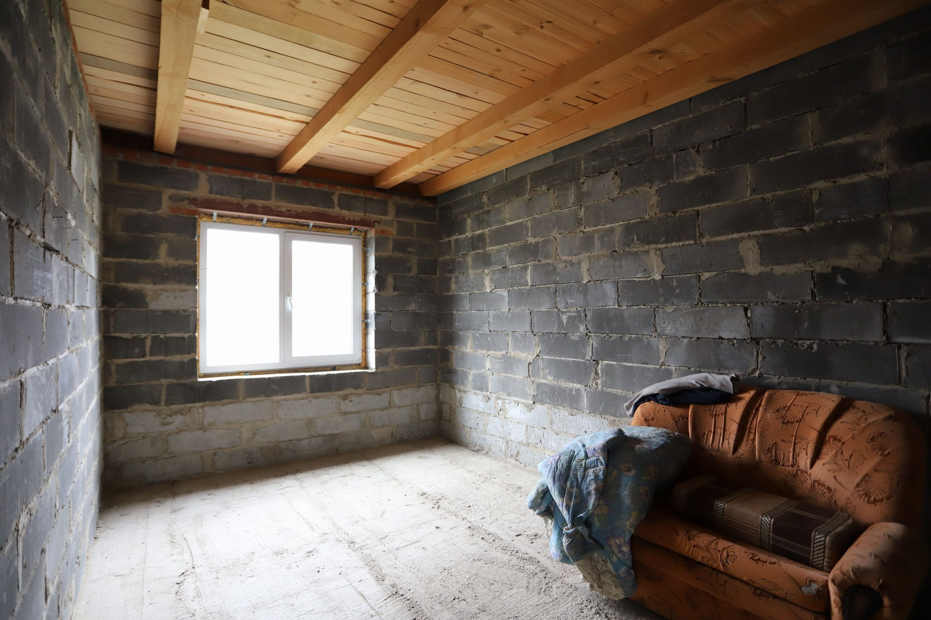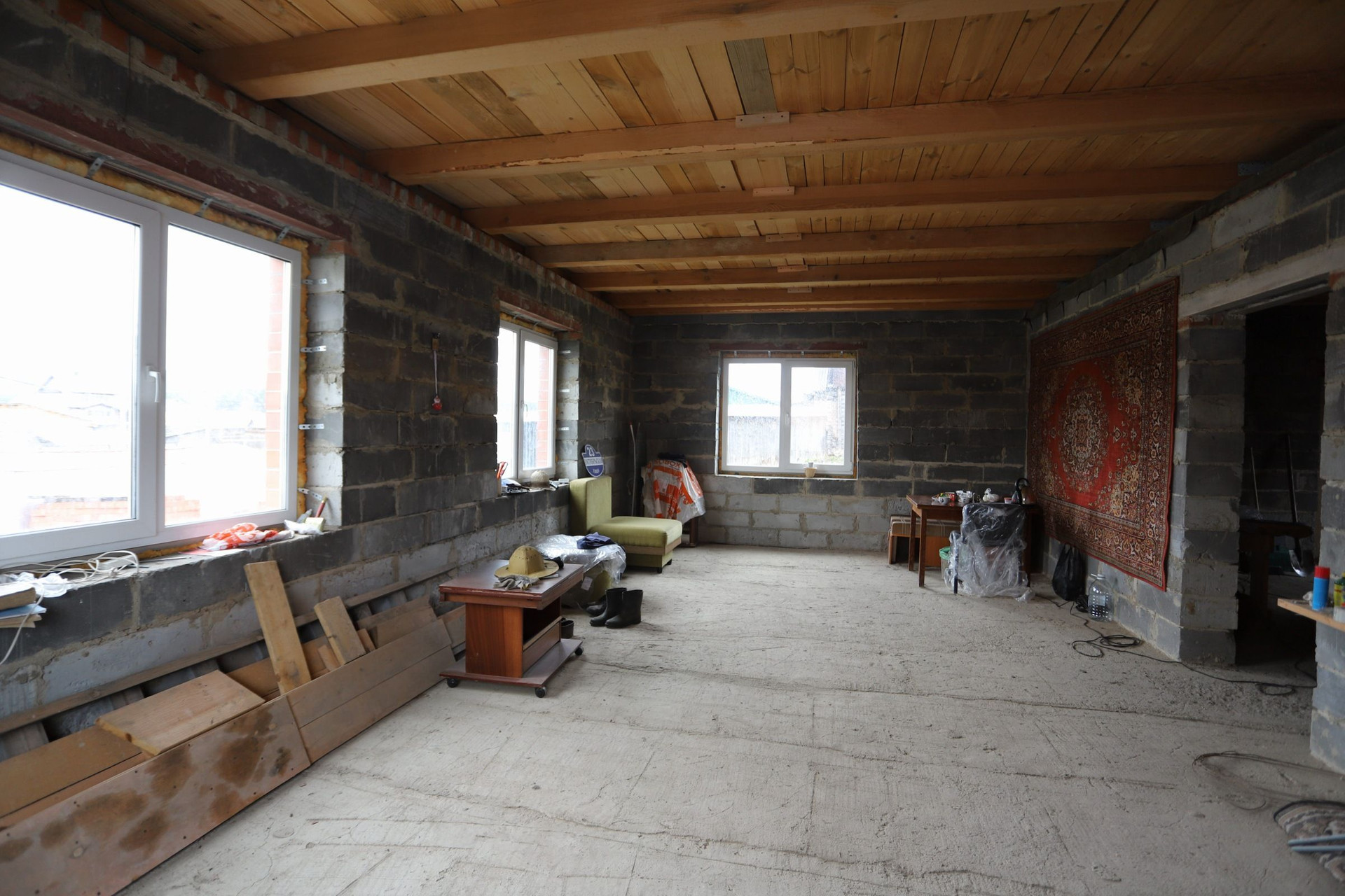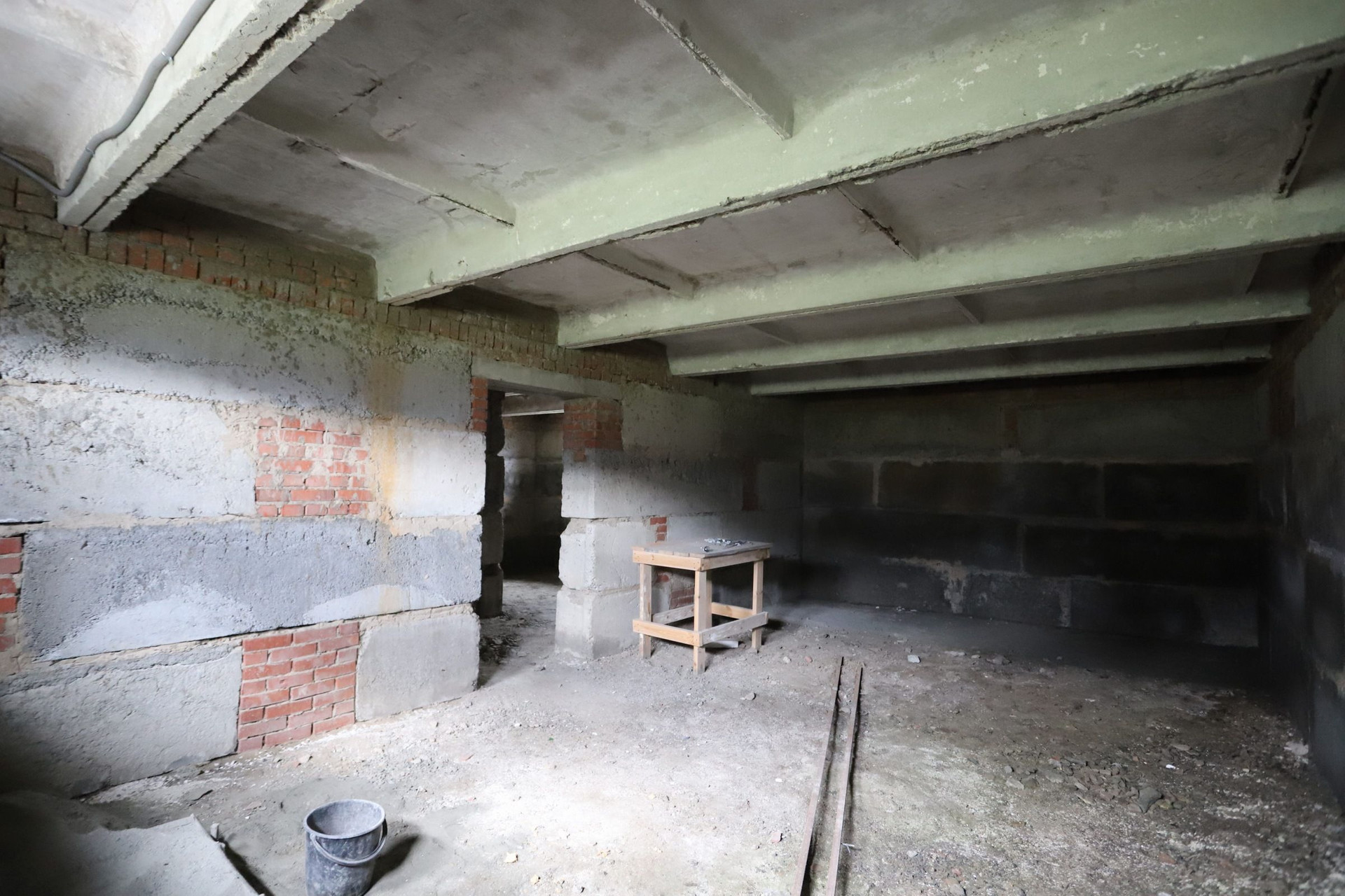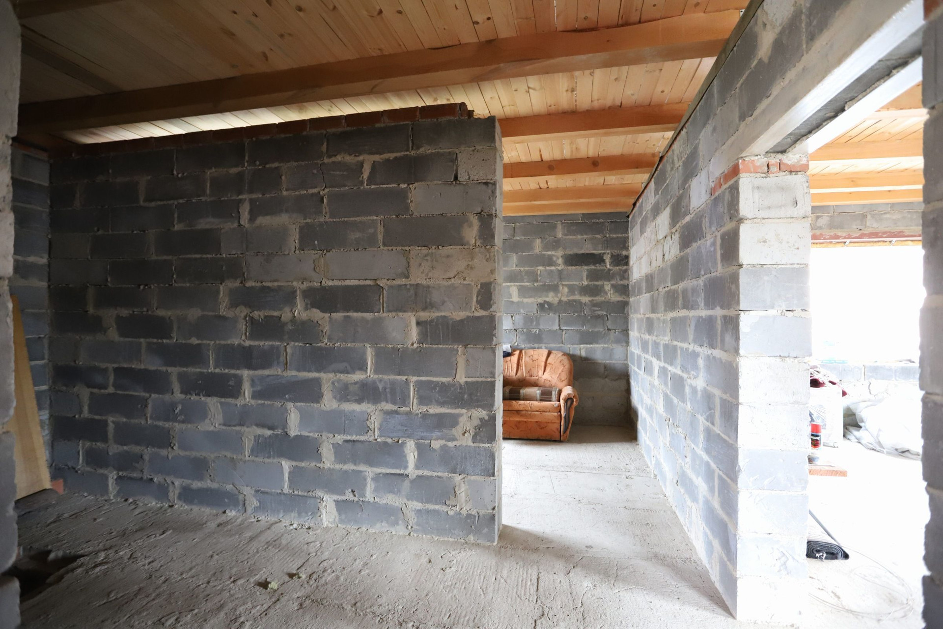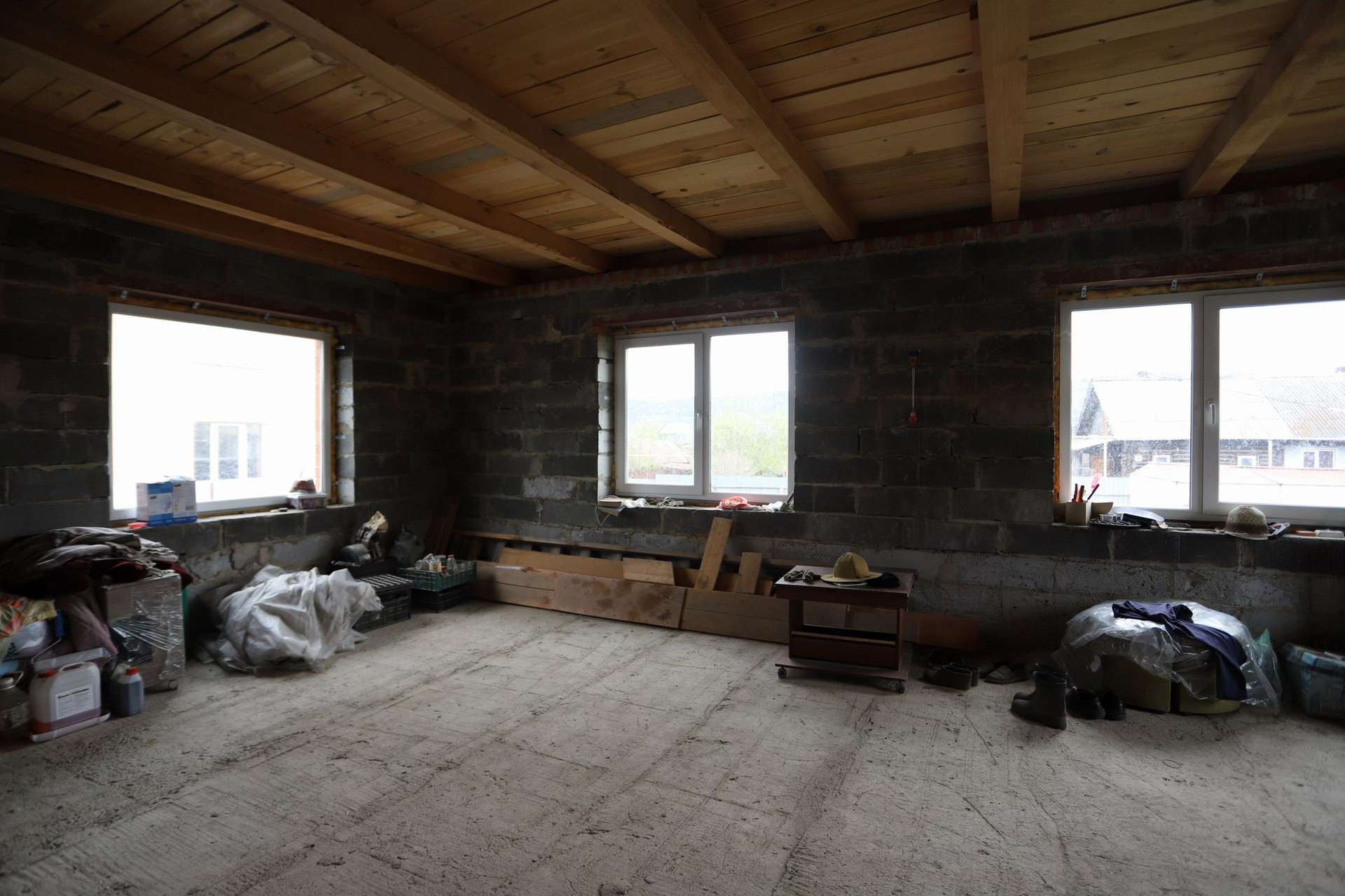 Оставляем бетономешалку, разный инвентарь и остатки кирпича.