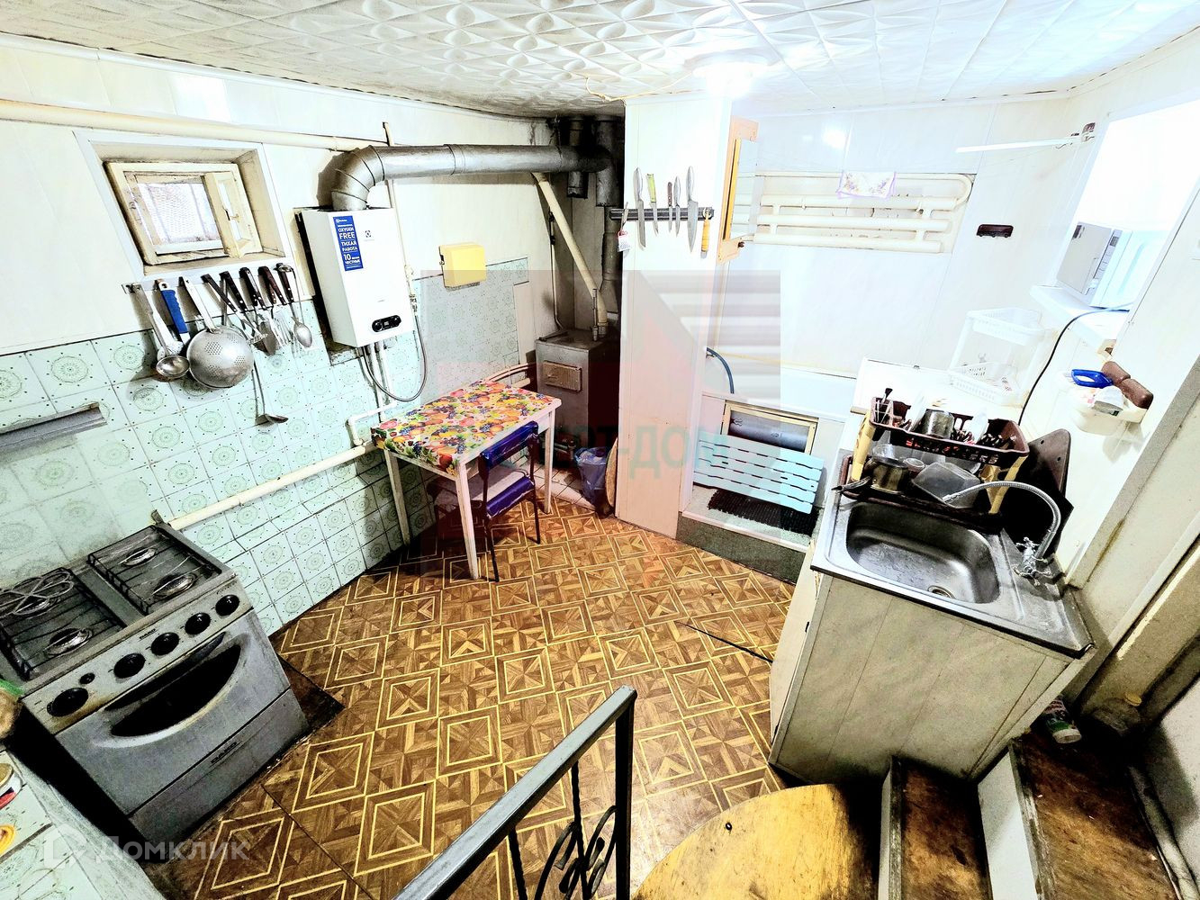 Кухня 10,7м в ней установлен котел, газовый водонагреватель, ванна, рукомойник и газовая печка. Из кухни есть выход во двор. Есть место и возможность для установки туалета