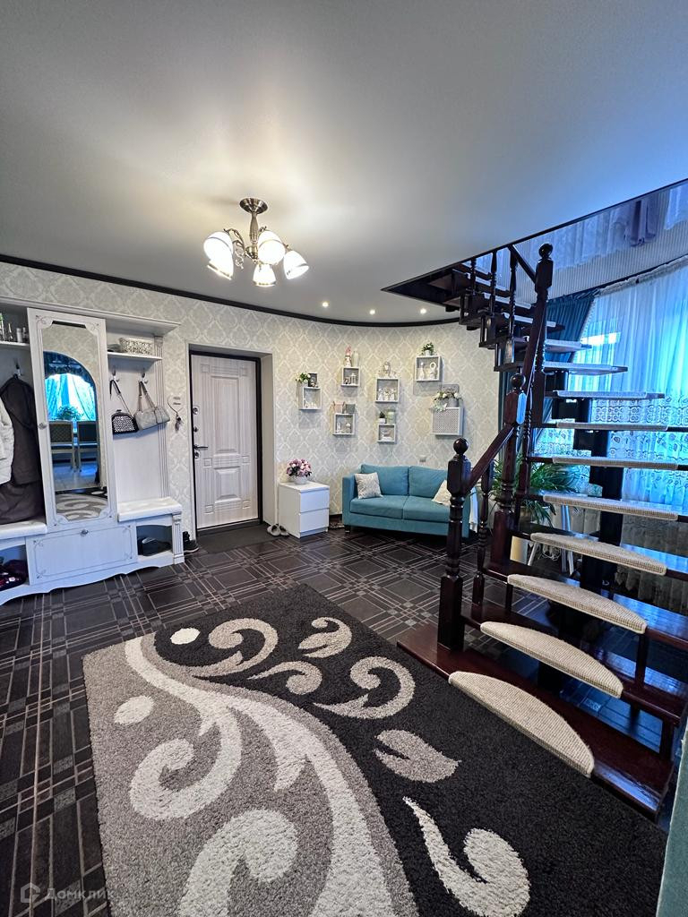 на полу керамогранит , в прихожей, сан узле и в гардеробной теплый пол, во всех комнатах натяжной потолок , просторный сан узел совмещен в кафеле, красивая лестница из сосны