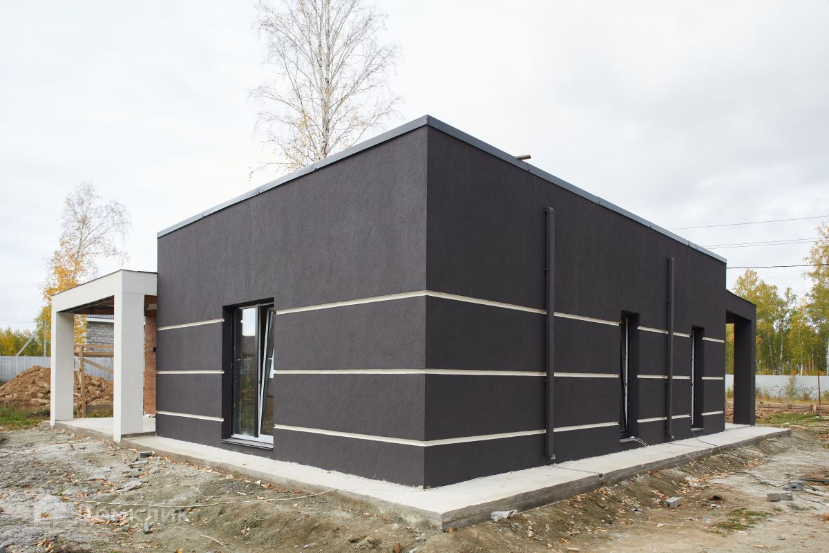 Внешняя отделка – дом выполнен в современном стиле Hi-Tech. Однотонный фасад выполнен декоративной штукатуркой Ceresit CT 137. Декоративные элементы с фактурой дерева выполнены полимерной штукатуркой Ceresit CT 720 Visage.