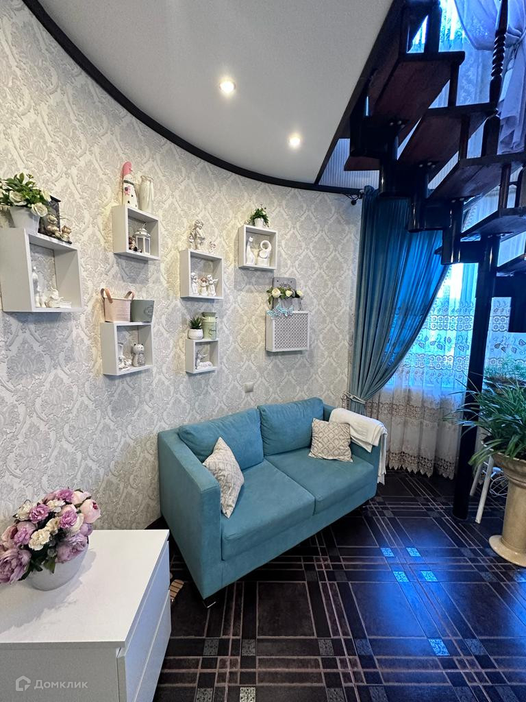 на полу керамогранит , в прихожей, сан узле и в гардеробной теплый пол, во всех комнатах натяжной потолок , просторный сан узел совмещен в кафеле, красивая лестница из сосны