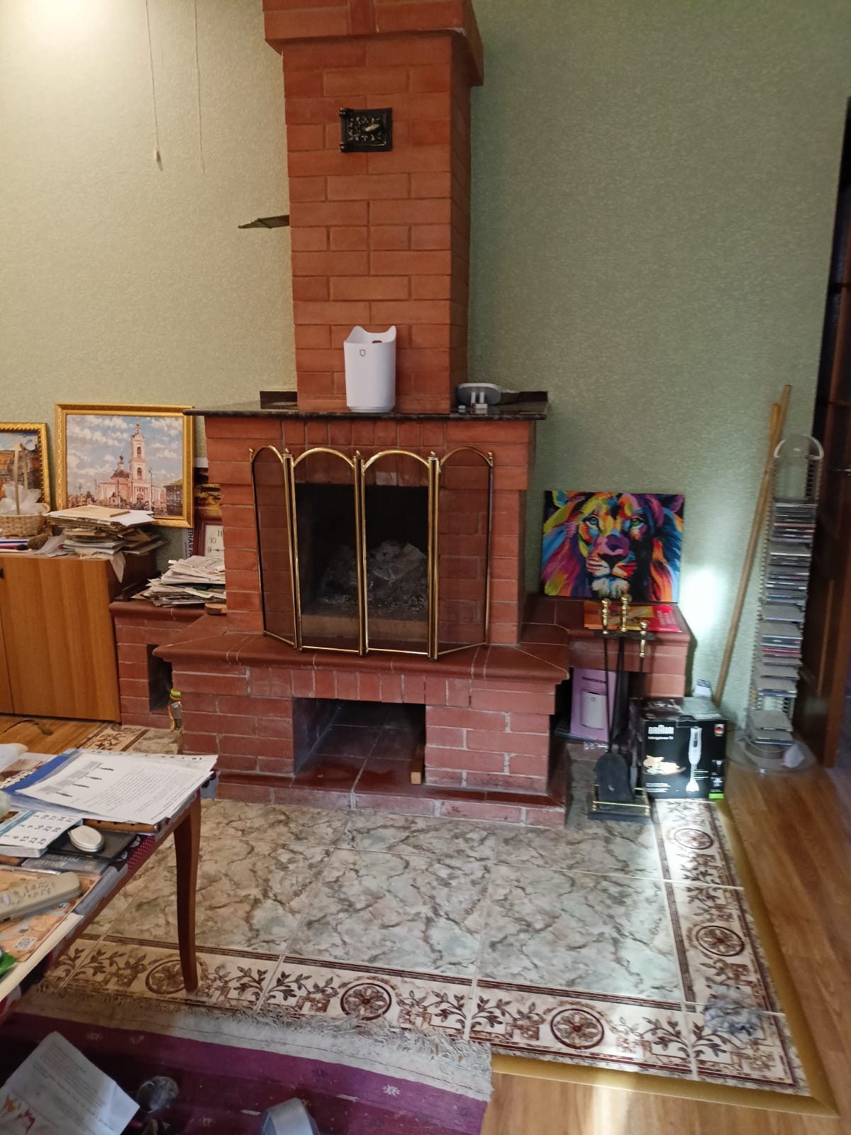 совмещенное пространство кухни и столовой, гостиная с камином и кондиционером, сан