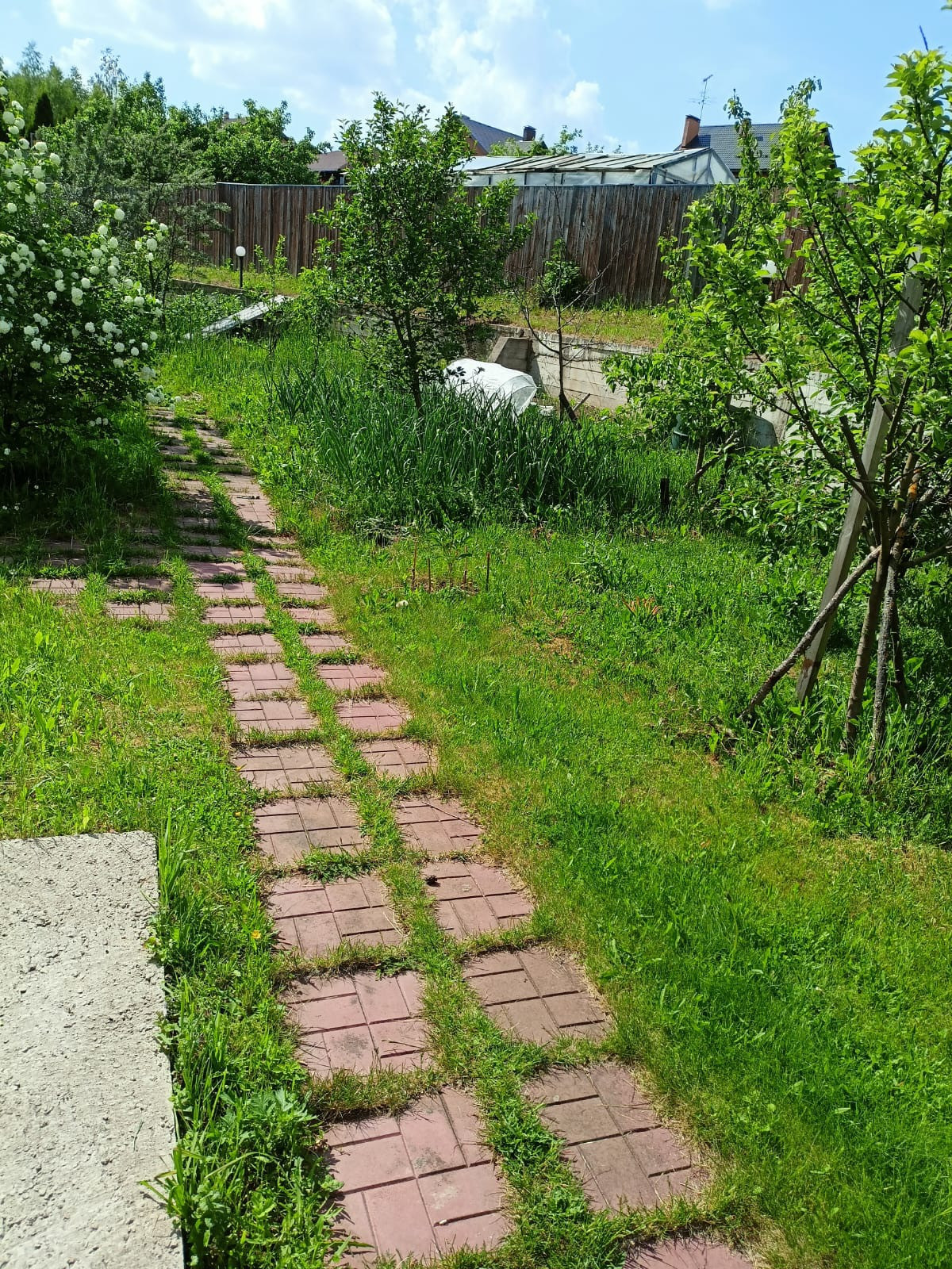 Участок закрыт газоном, кустикам и деревами. Выполнен дренаж и водоотведение