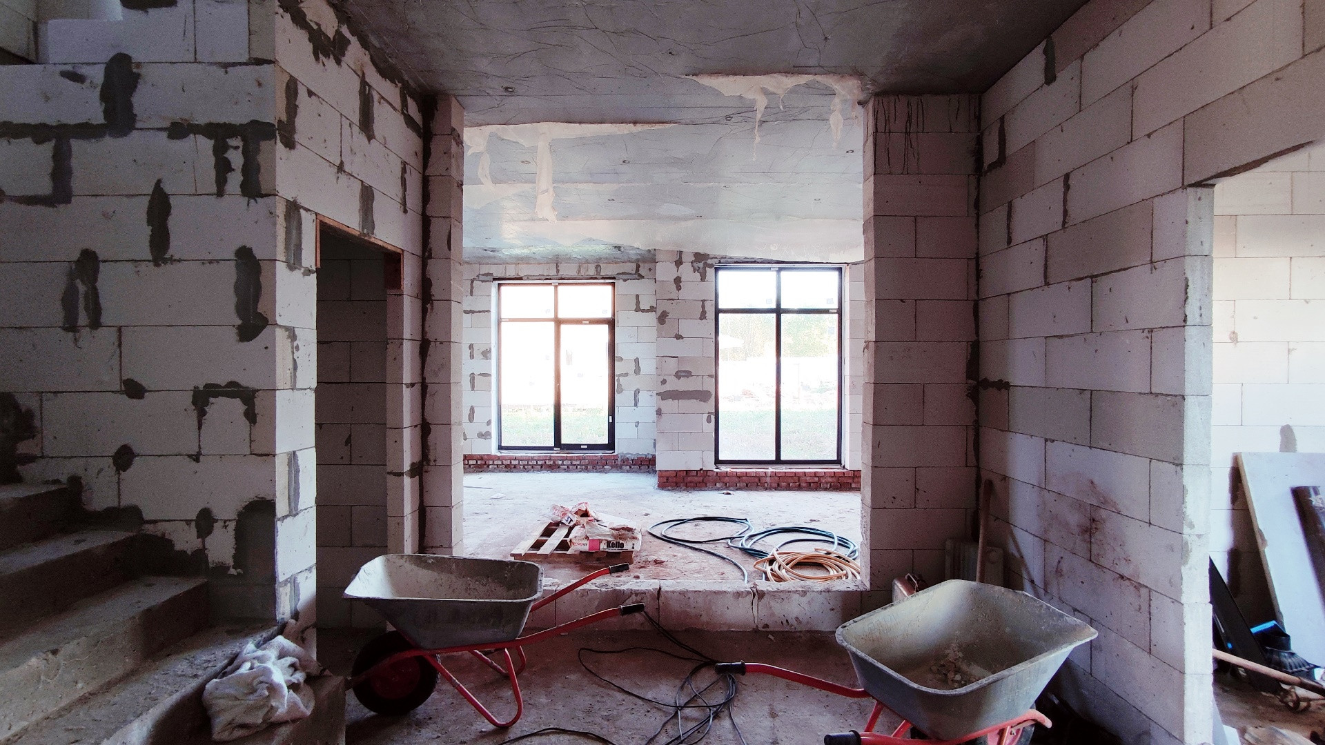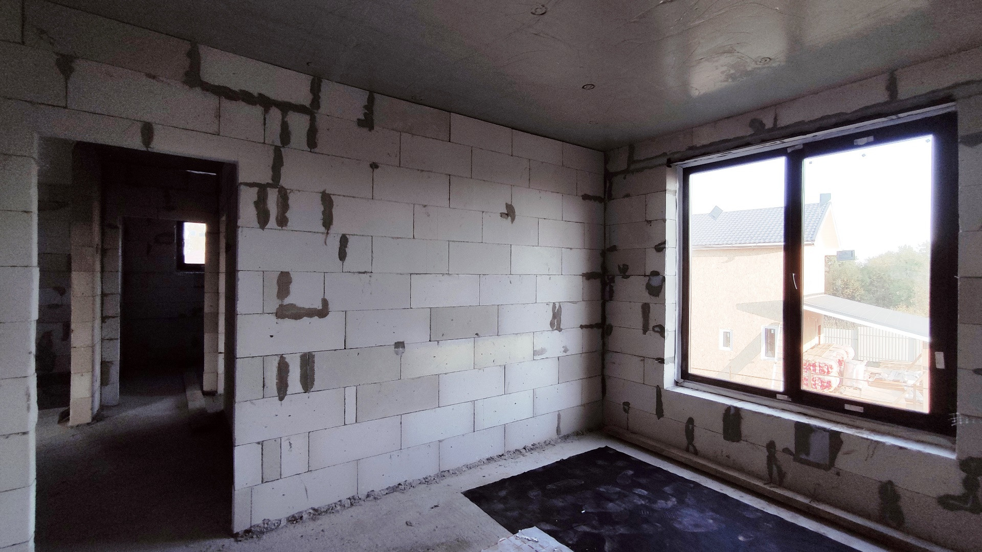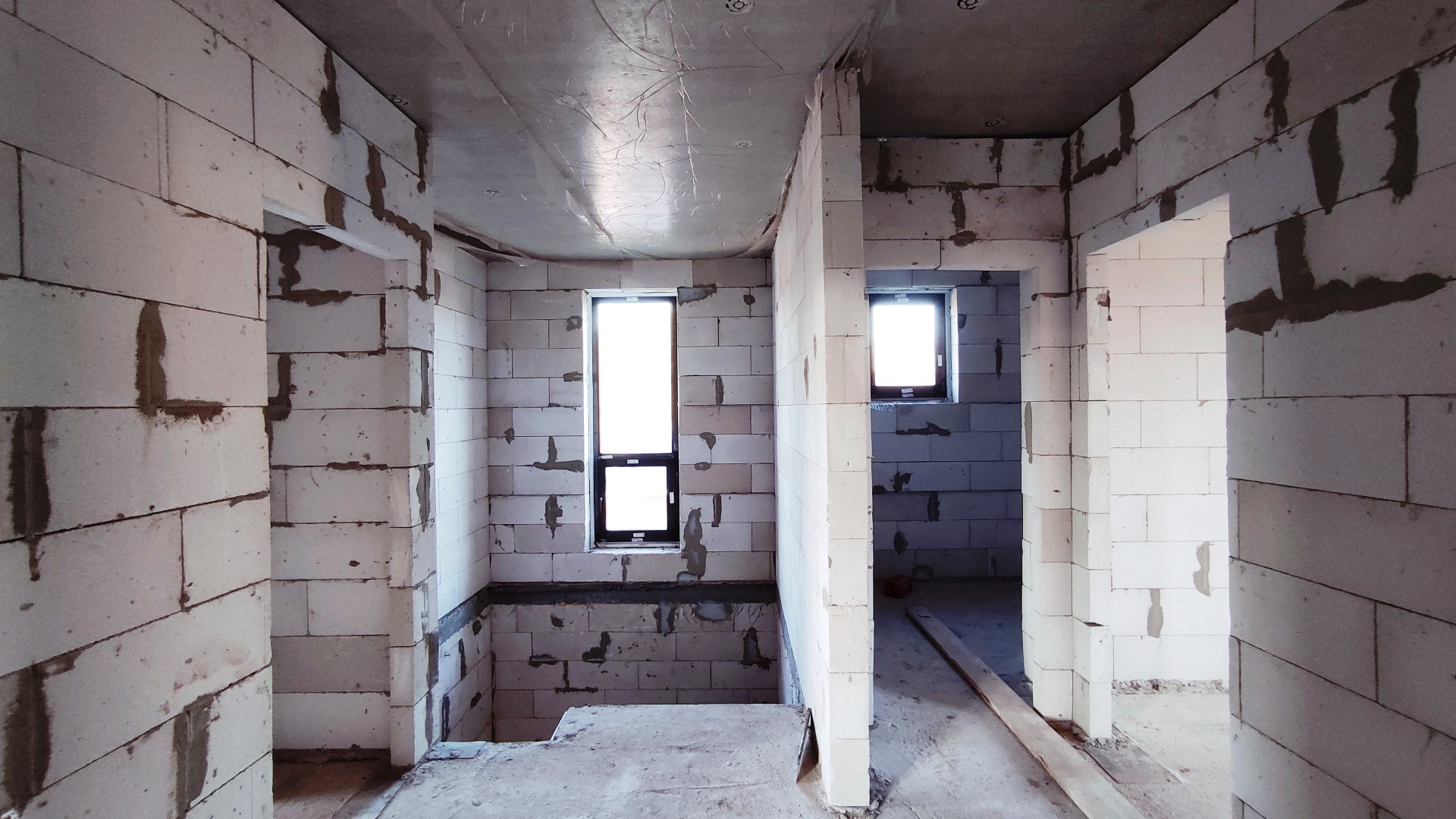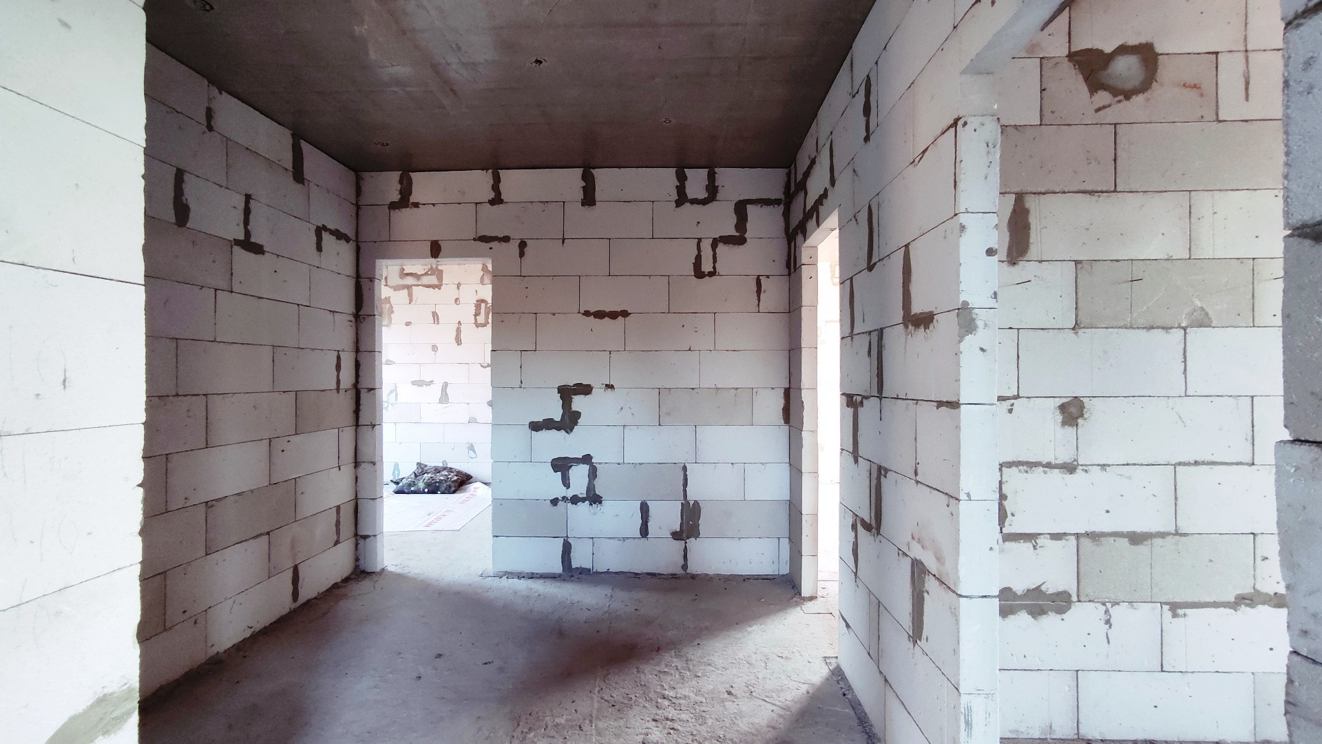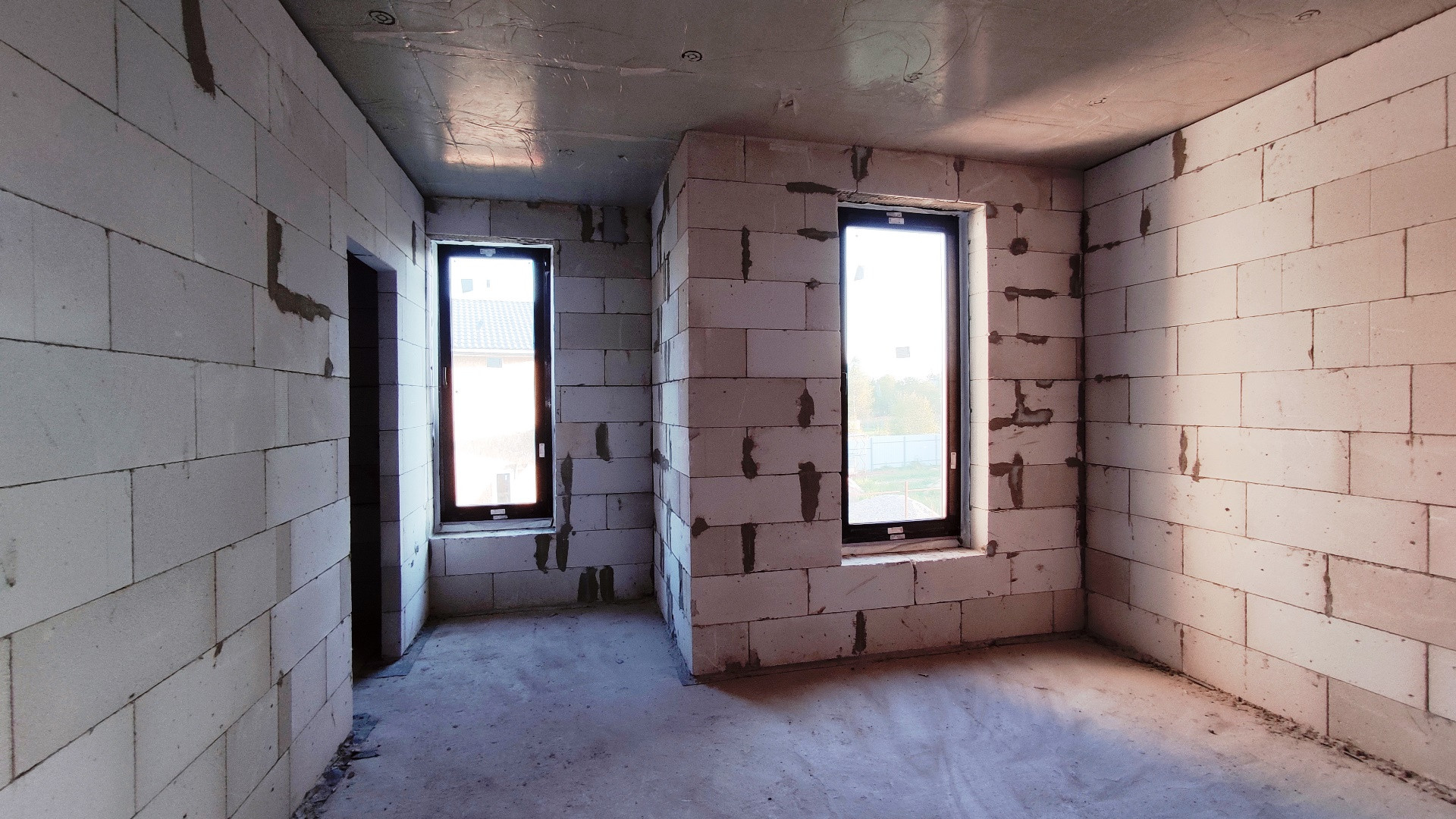 Внешний контур здания возведен. Смонтирована крыша из металлочерепицы. Внутренняя часть дома разделена на помещения в соответчики с проектом. Установлены качественные окна REHAU, дорогая входная дверь с терморазрывом. Высота потолков 3,25 м (черновая).