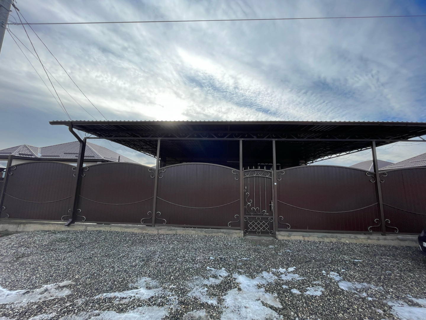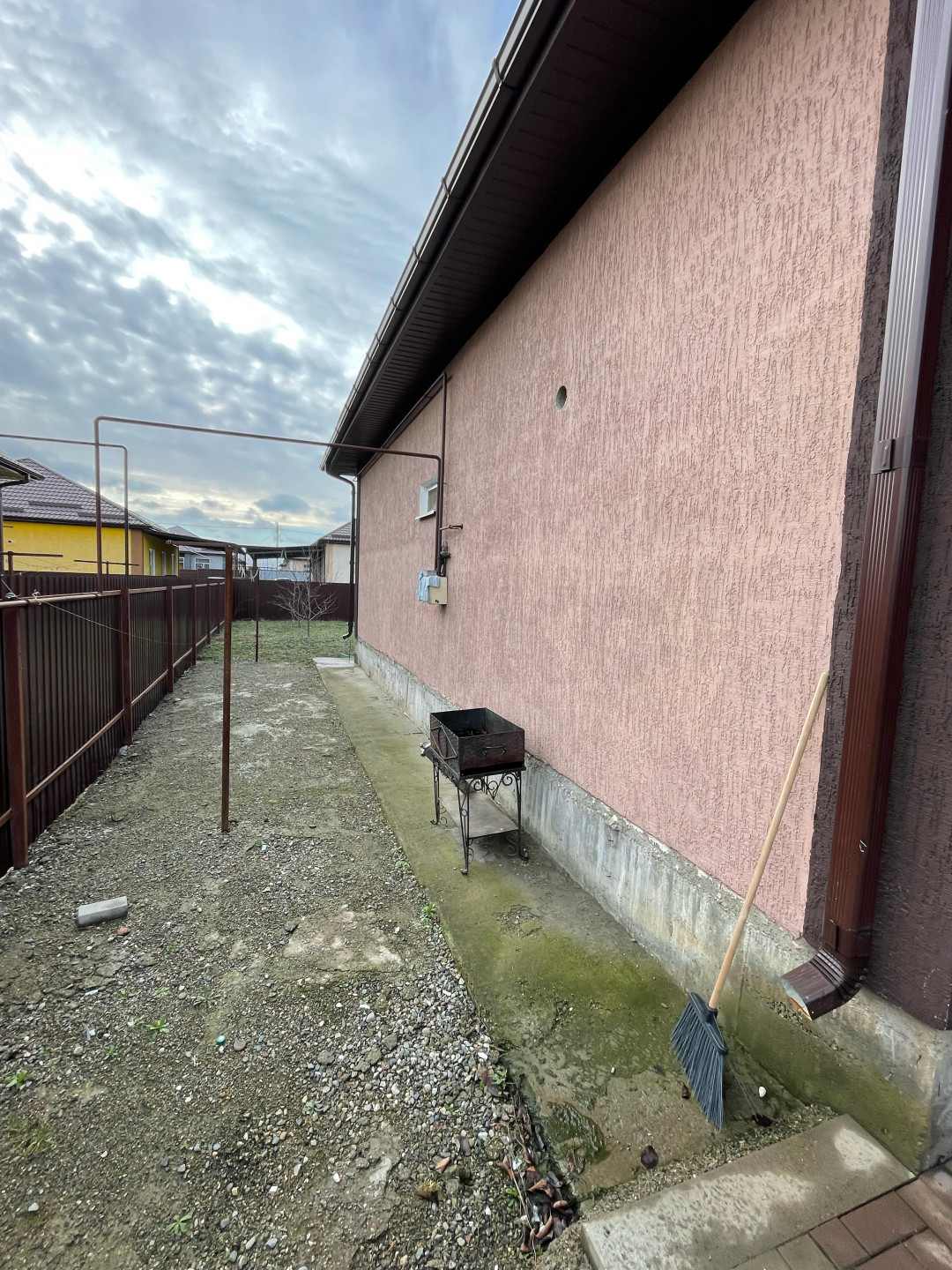 Дом расположен на участке площадью 6 соток с фасадом длиной 20 метров. Во дворе есть навес и откатные ворота. Территория двора выложена тротуарной плиткой, что придает ей аккуратный и красивый вид. А еще за домом находится фруктовый сад, что добавляет приятный бонус для будущих владельцев.