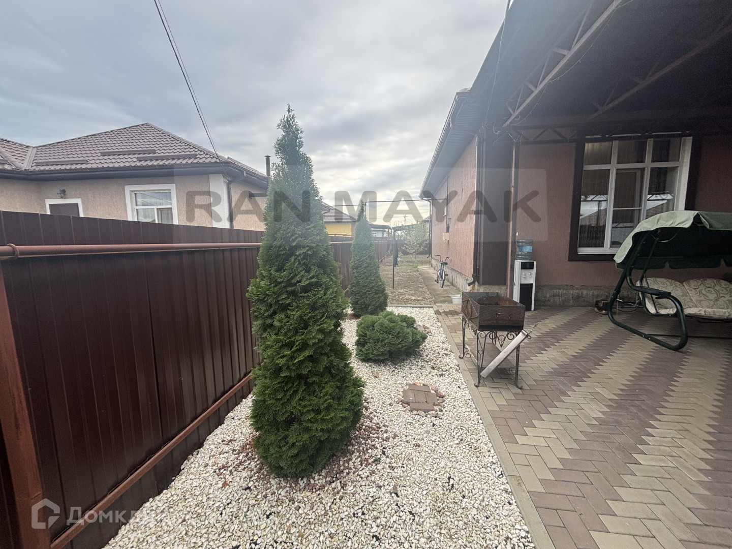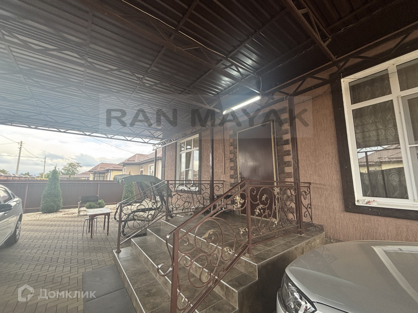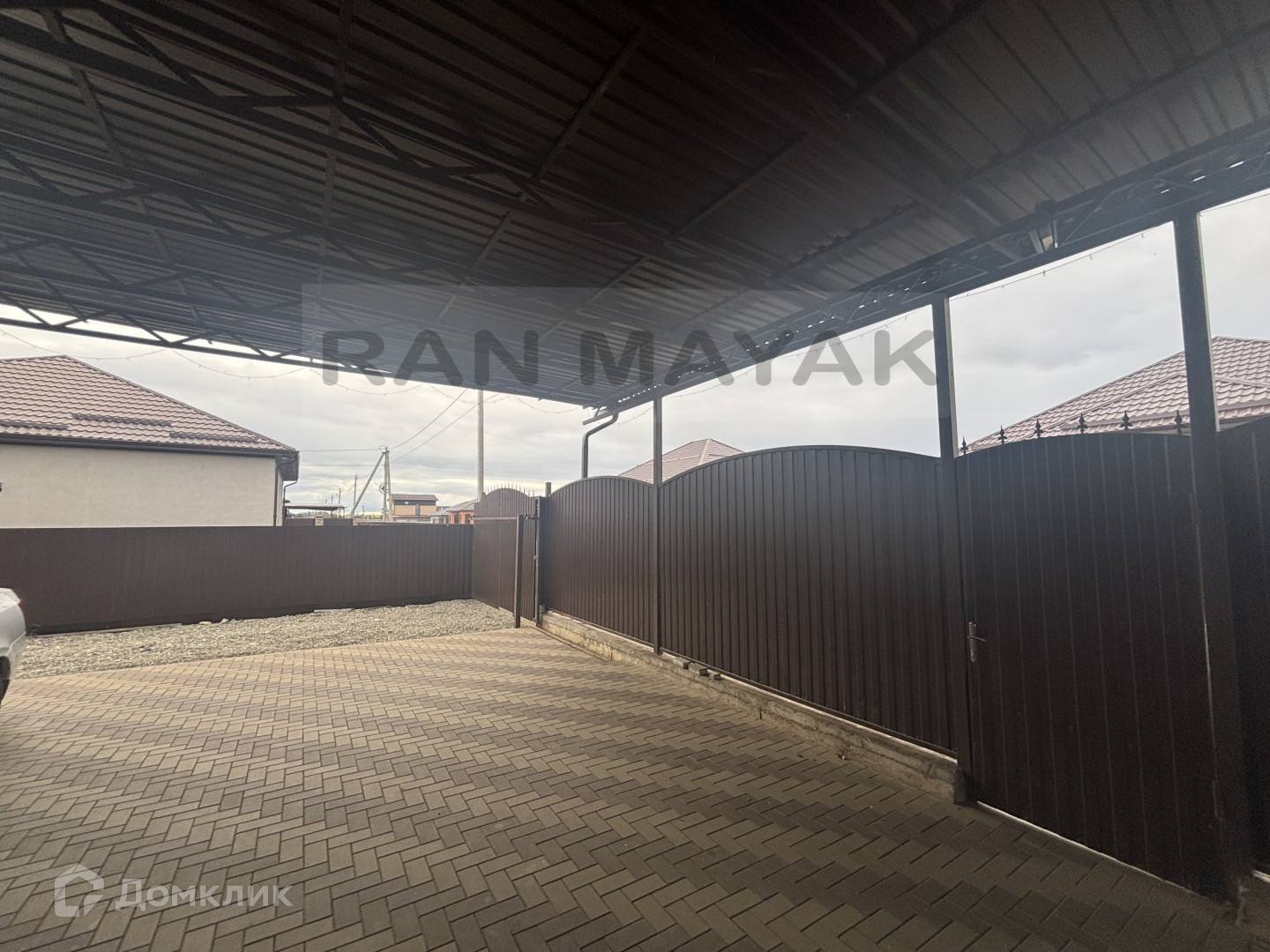 Навес и плитка во дворе, участок с плодовыми деревьями.