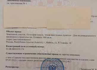 Земельный участок для индивидуального строительства 660кв.м. г. Майкоп ул. тюкова 14. Свет + газ по улице. Кадастровый номер 01:08:0801019:174, имеютсяеще участки к реализации в этом районе. |