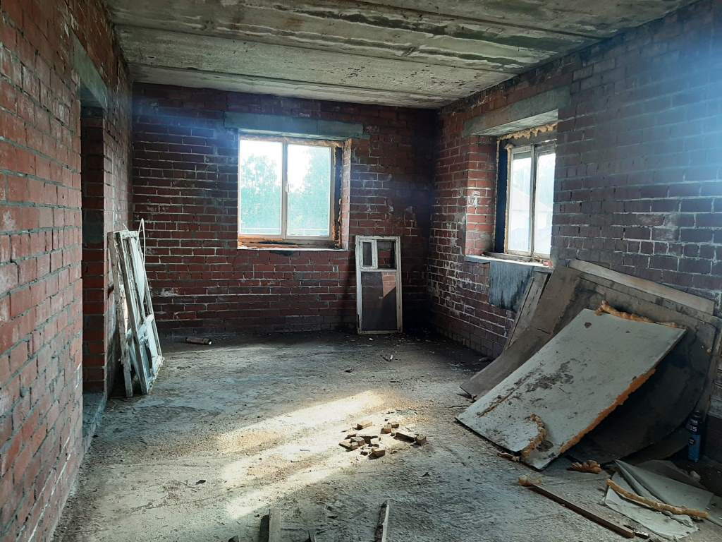 Продам недостроенный коттедж в центре поселка. Коробка - кирпич, фундамент-монолит, перекрытия ж/б плиты. Газ проходит по участку. Торг при осмотре.