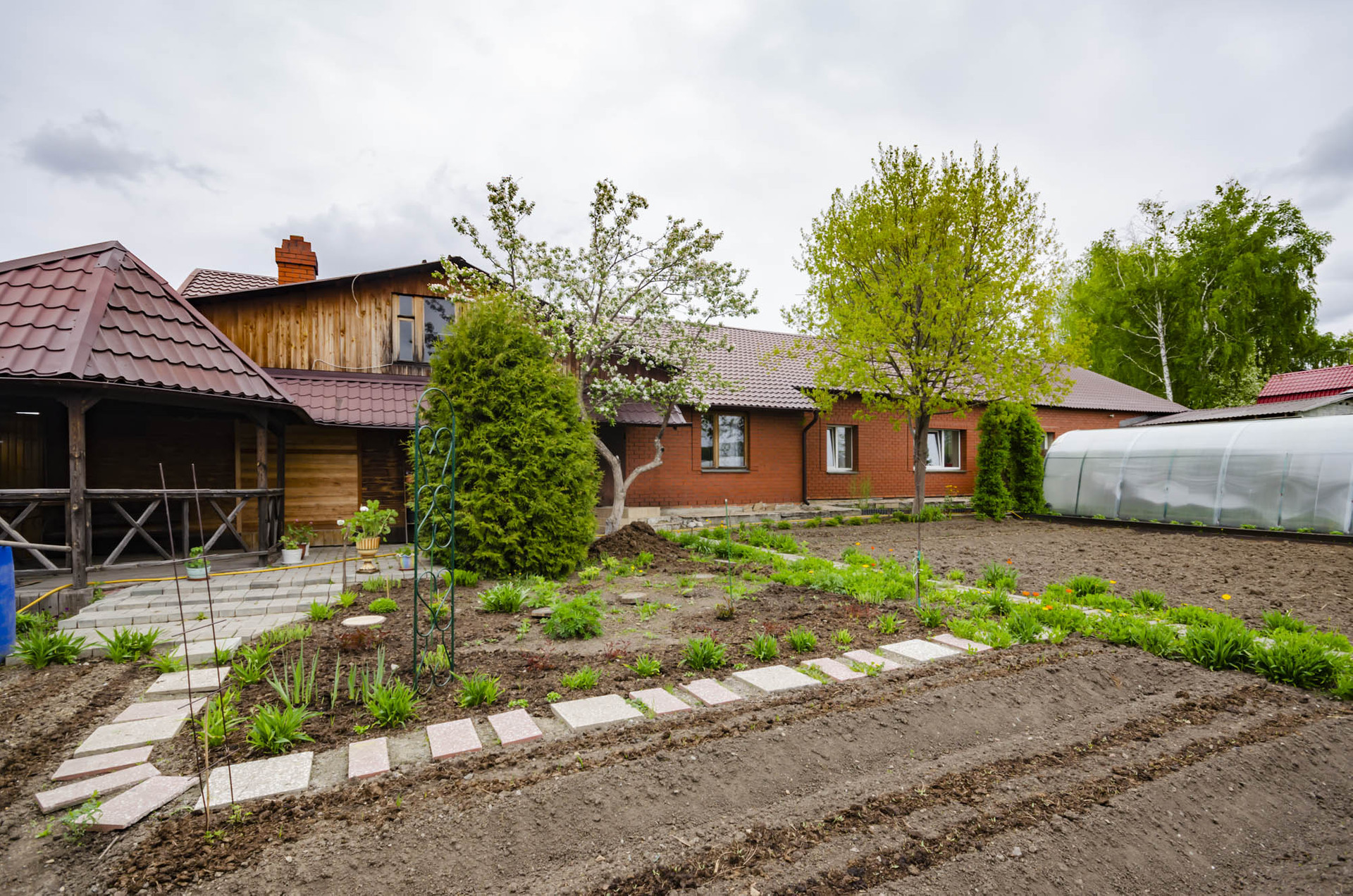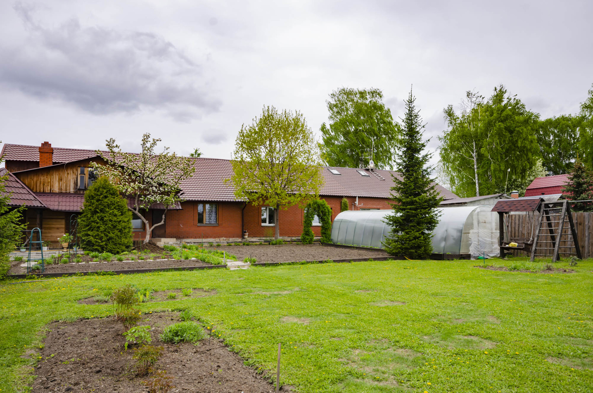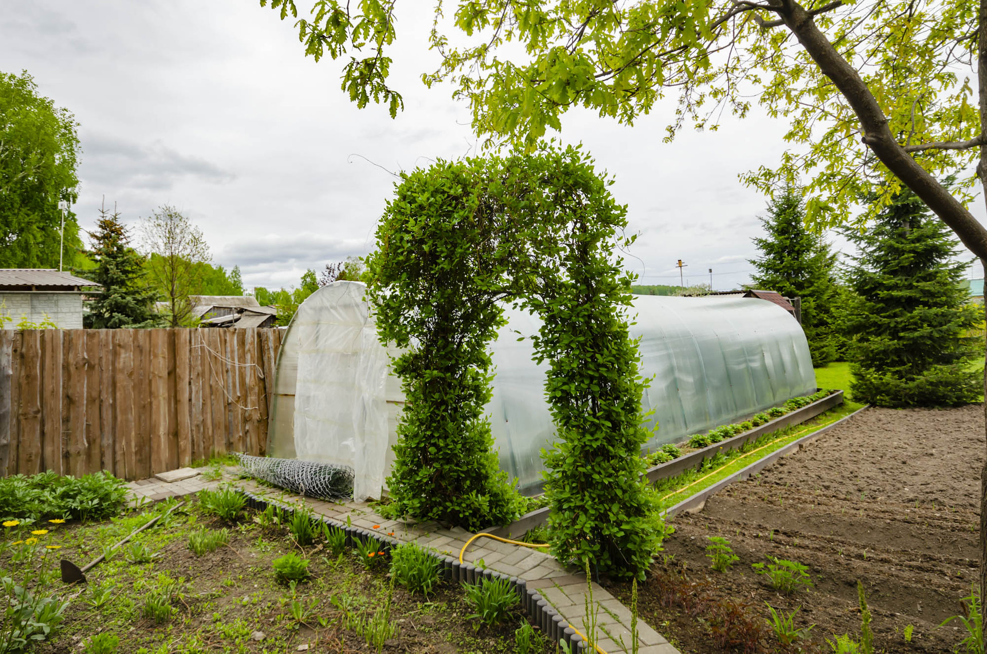 Участок правильной формы, очень ухоженный, большие ели, во дворе уютная беседка, песочница для детей, большая теплица, все полностью огорожено добротным забором, хорошие , надежные ворота, мощеный двор.