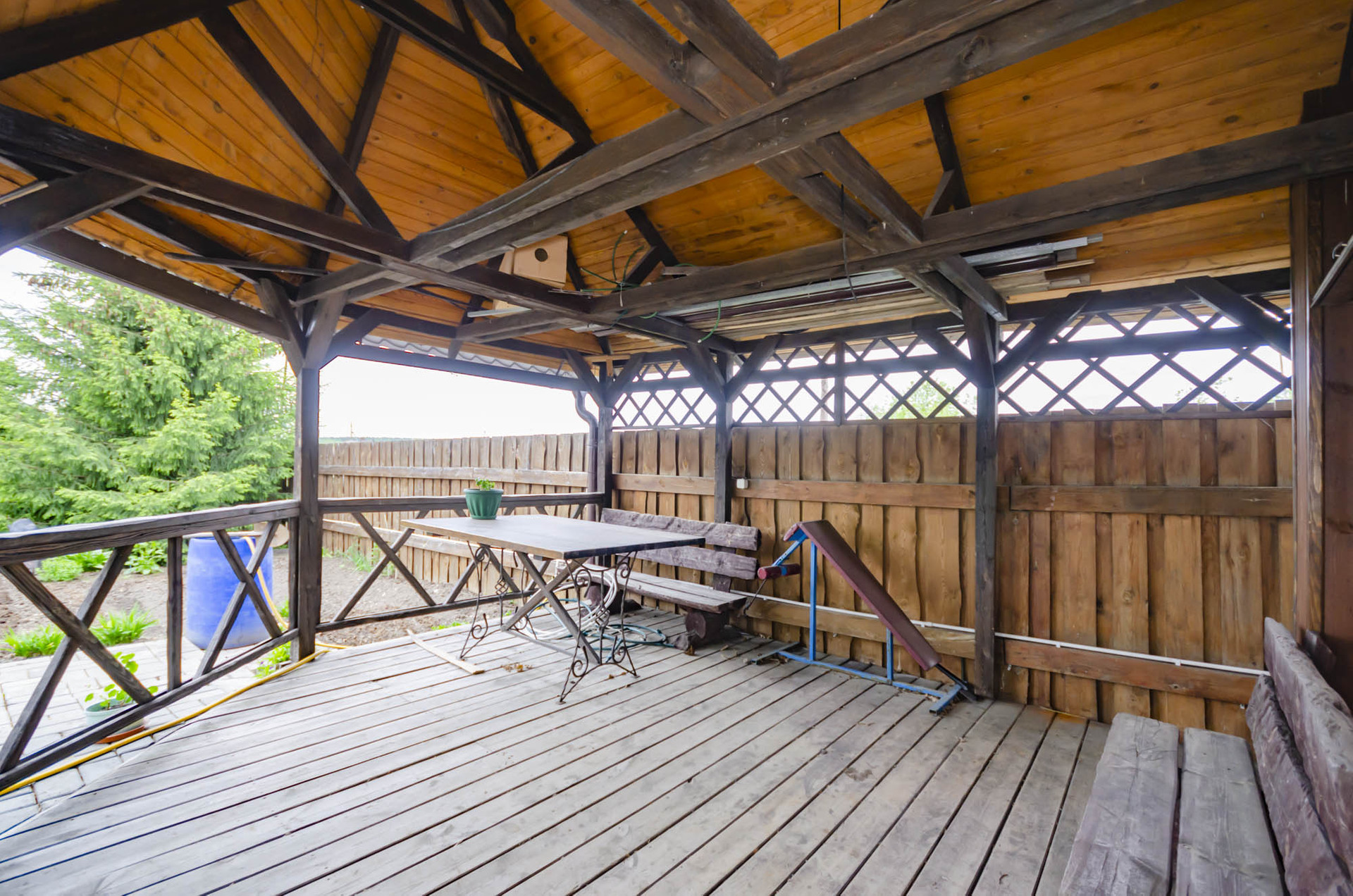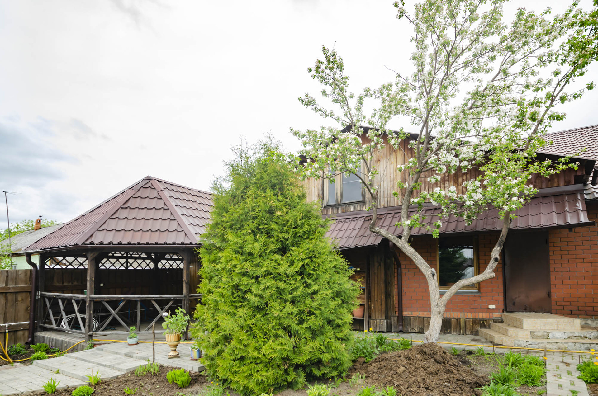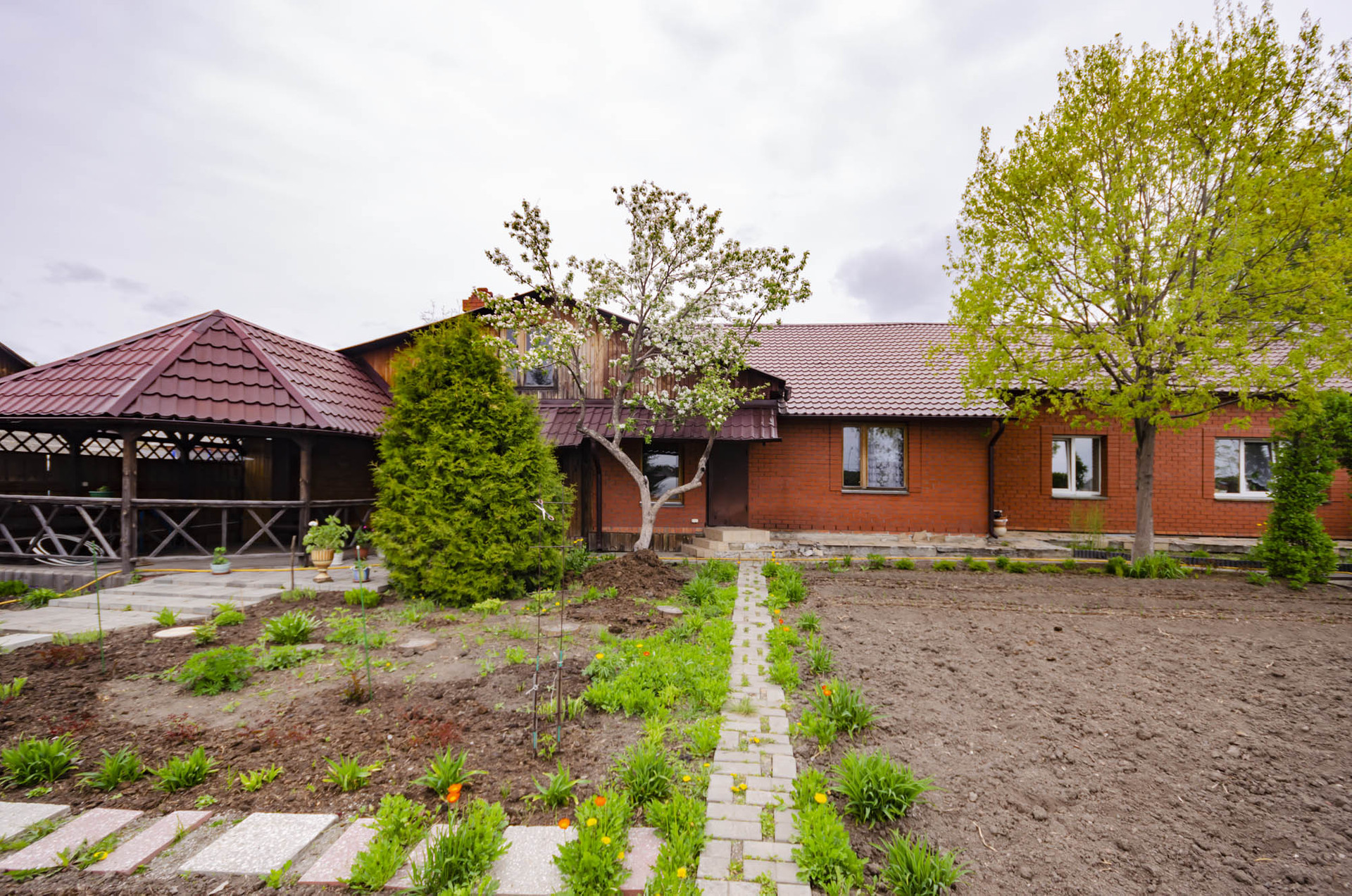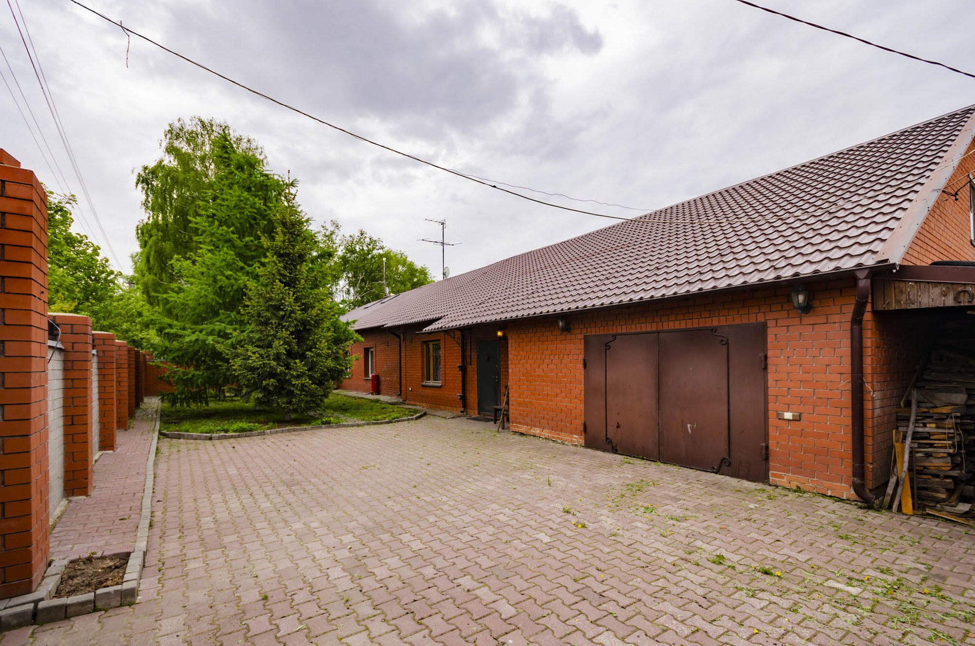 Участок правильной формы, очень ухоженный, большие ели, во дворе уютная беседка, песочница для детей, большая теплица, все полностью огорожено добротным забором, хорошие , надежные ворота, мощеный двор.