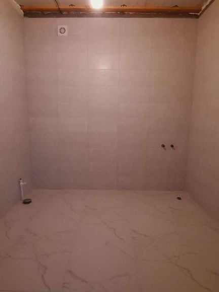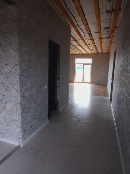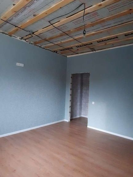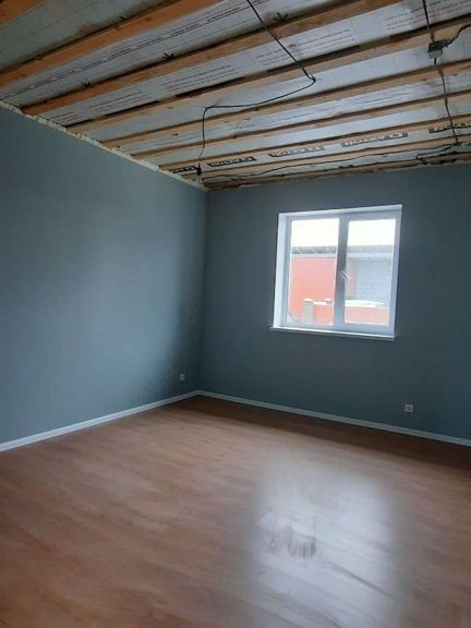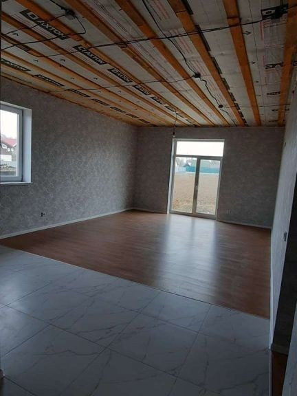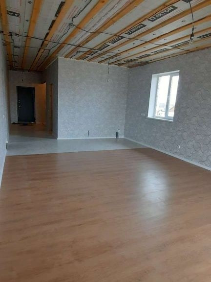 На полу в зонах повышенной влажности (кухня, тамбур, котельная) керамогранит,  в жилых зонах ламинат приятного оттенка 32 класса. Стены штукатурены, обои виниловые, потолки натяжные (на фото ещё не смонтированы). Санузел в кафельной плитке. В доме 2 спальни, кухня-гостиная, техпомещение, санузел. гараж и подвал- как отдельные помещения со своим входом.