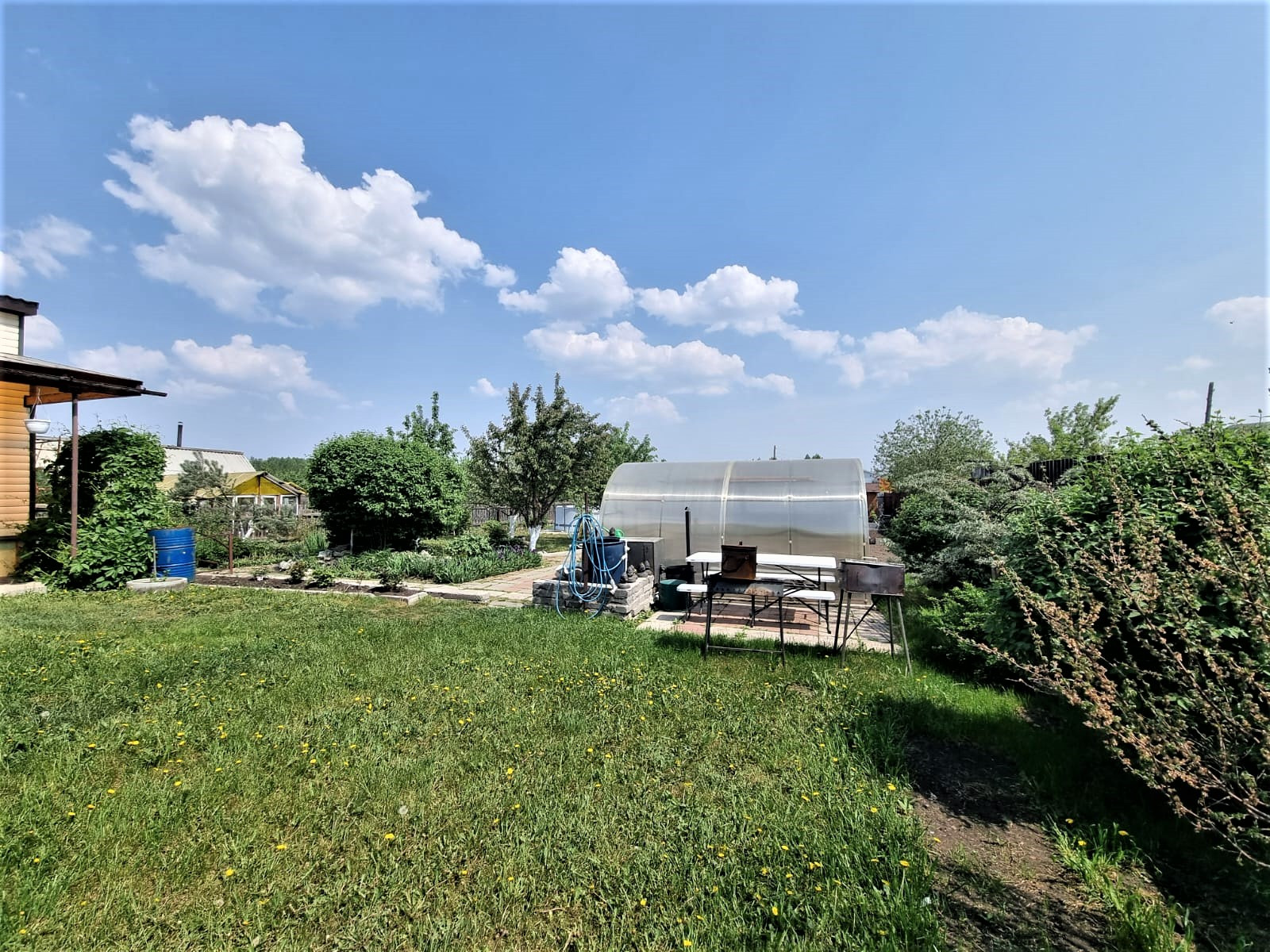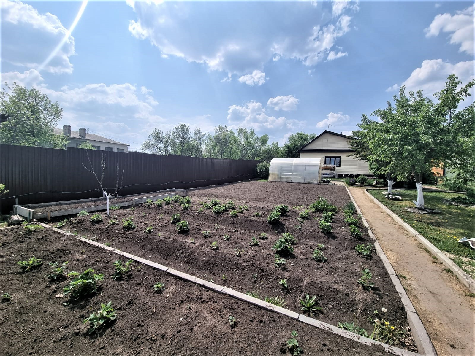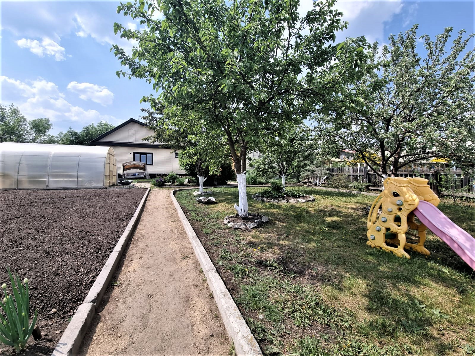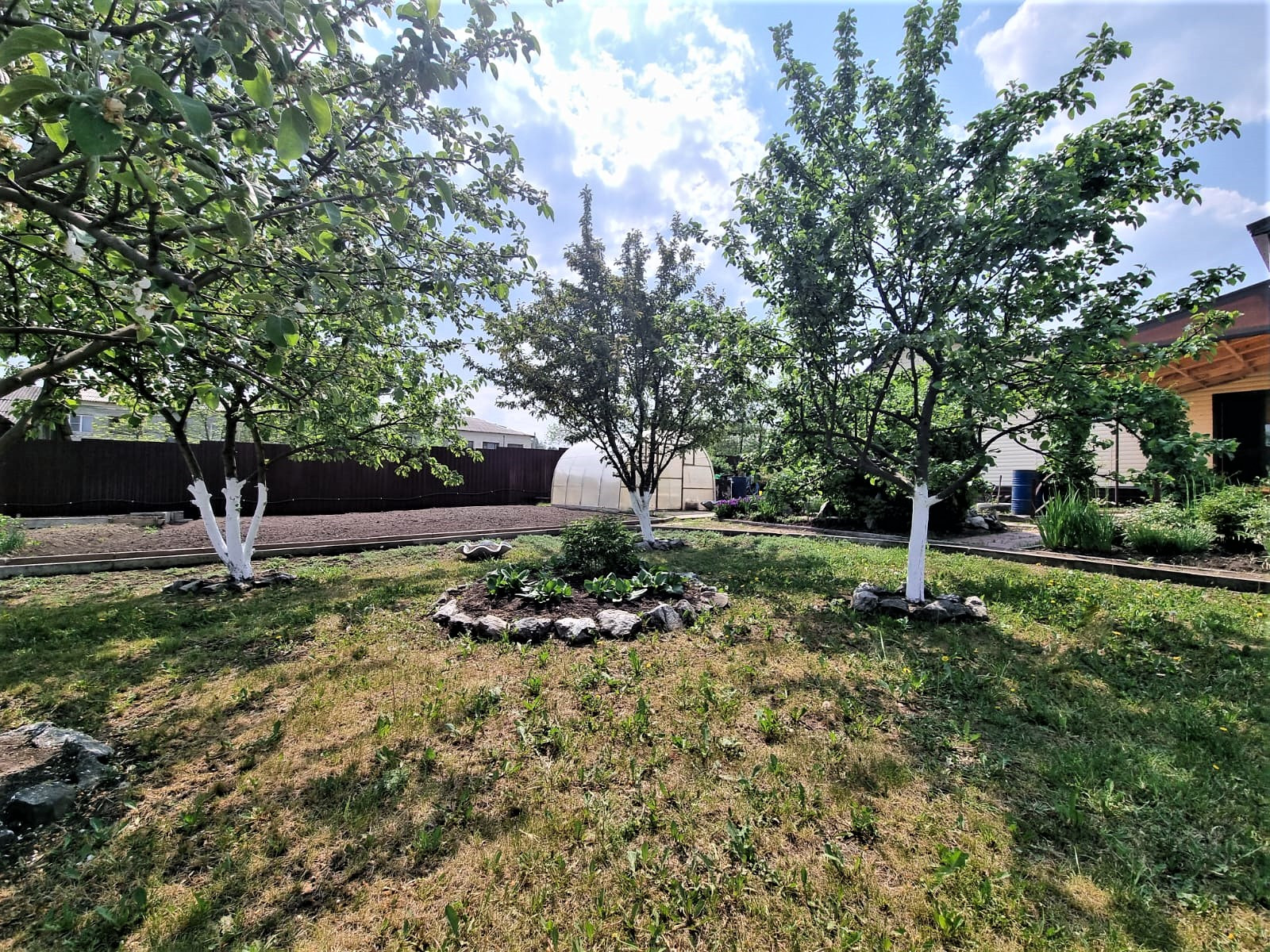 Отдельного внимания достоин сад. В котором высажено много плодородных деревьев, кустарников, цветов. В саду установлены дорожки. Две теплицы.