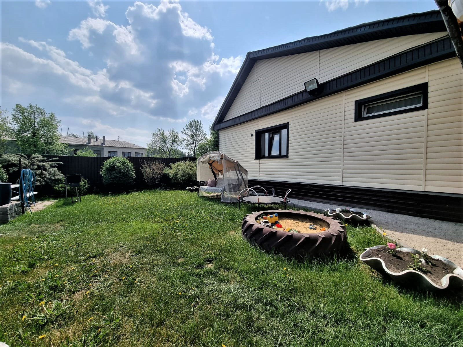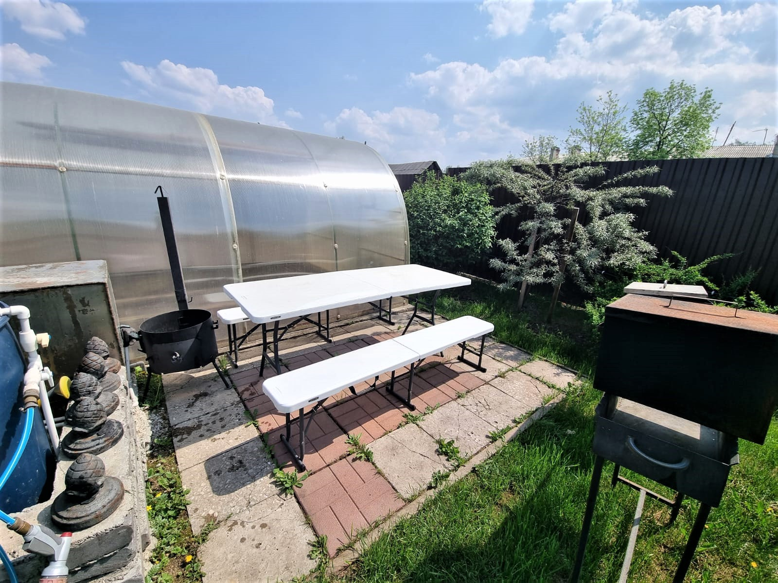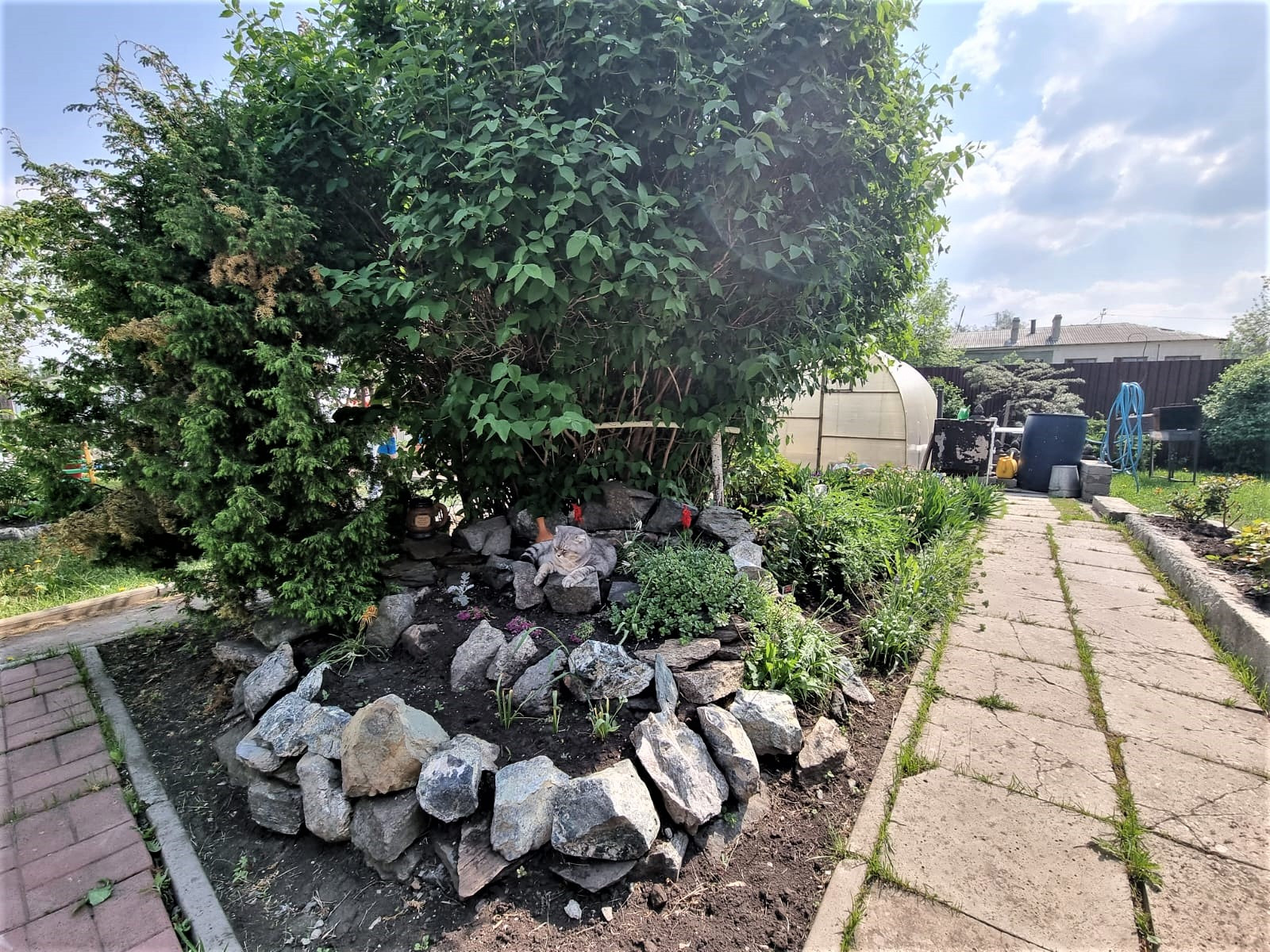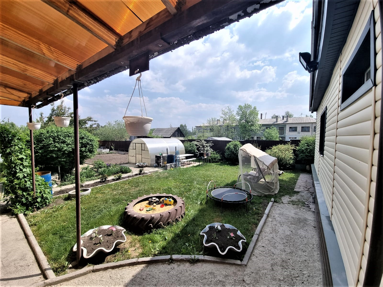 Отдельного внимания достоин сад. В котором высажено много плодородных деревьев, кустарников, цветов. В саду установлены дорожки. Две теплицы.