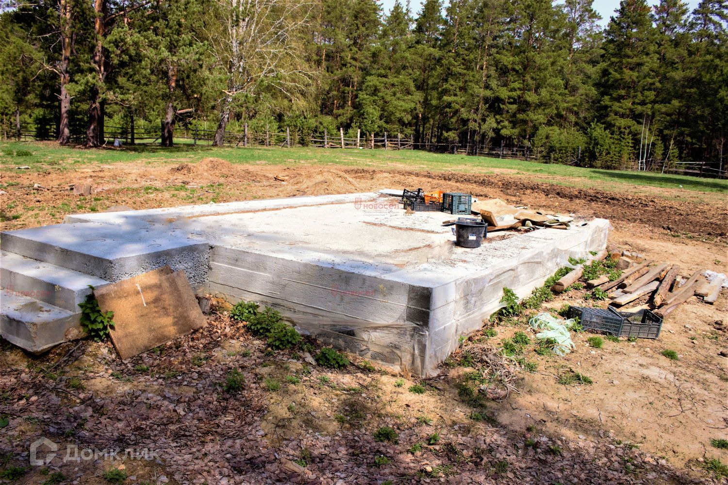 На участке есть хоз.постройки и залитый фундамент. Ранее земельный участок использовался для коневодства. Посажены молодые саженцы яблони, сливы и много других. Территория огорожена забором.