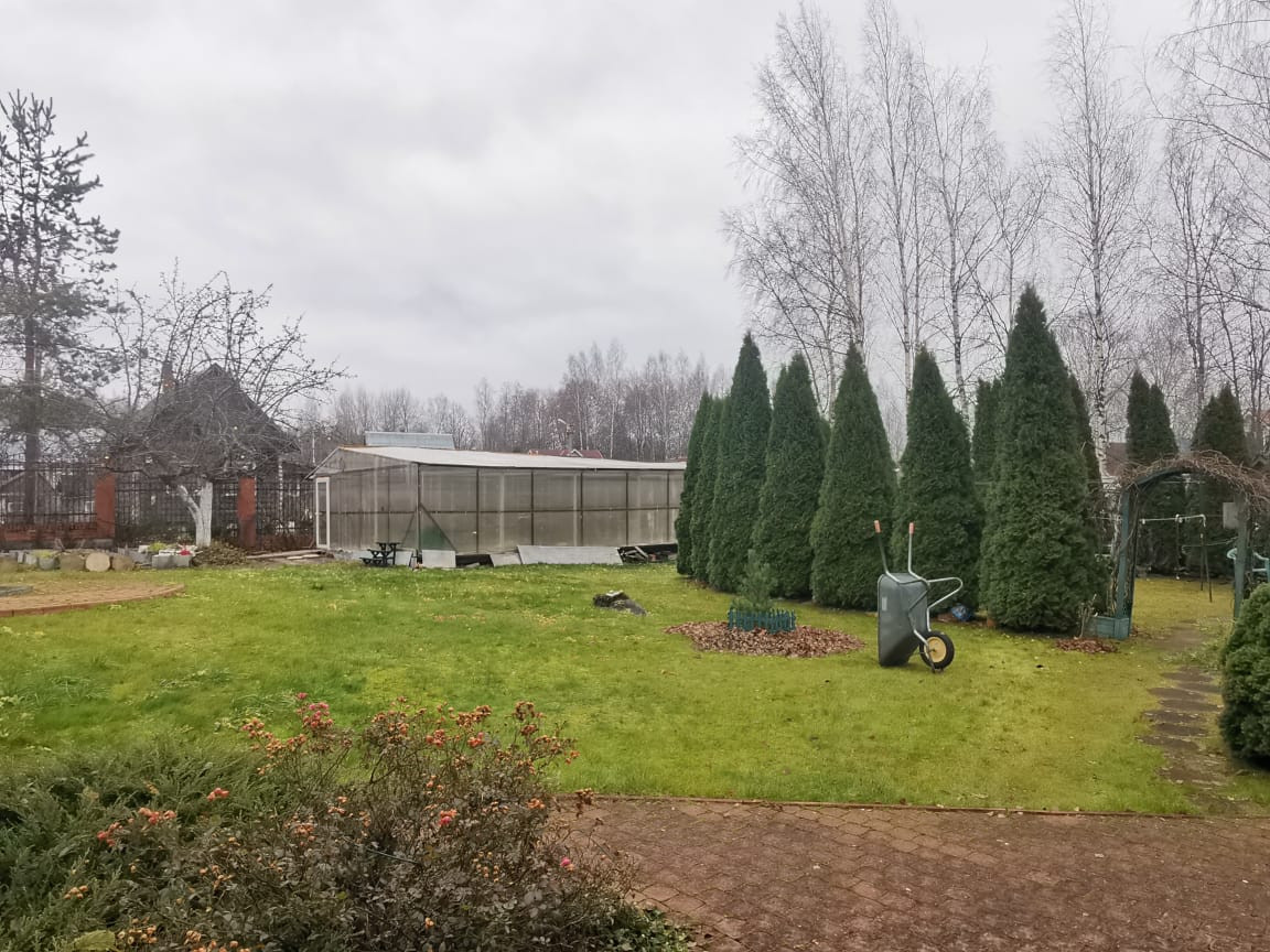 В дальней части участка располагаются постройки хозяйственного назначения: мастерская, хозблок. Построена большая утепленная теплица. Территория огорожена комбинированным забором с кованными калитками.