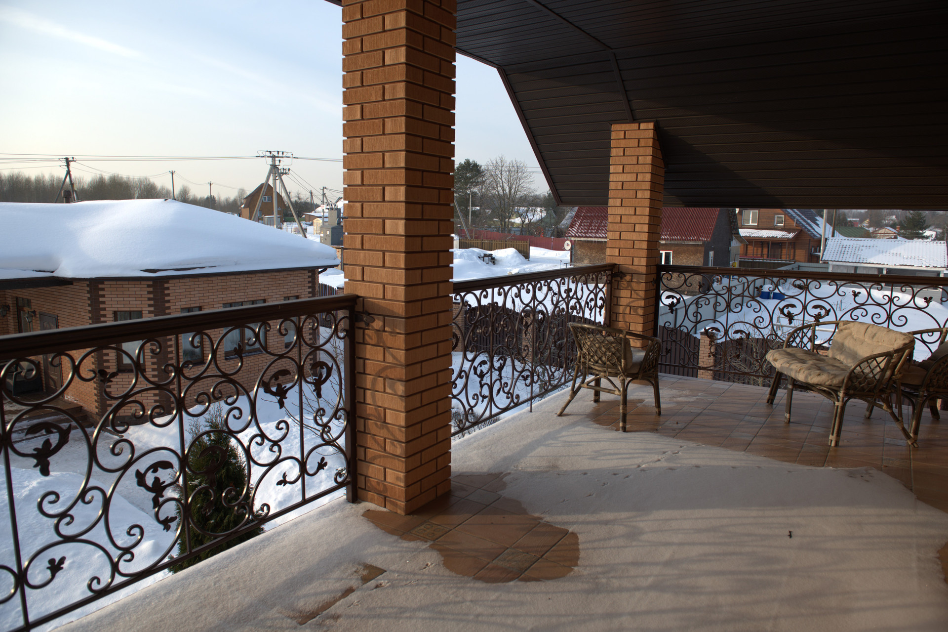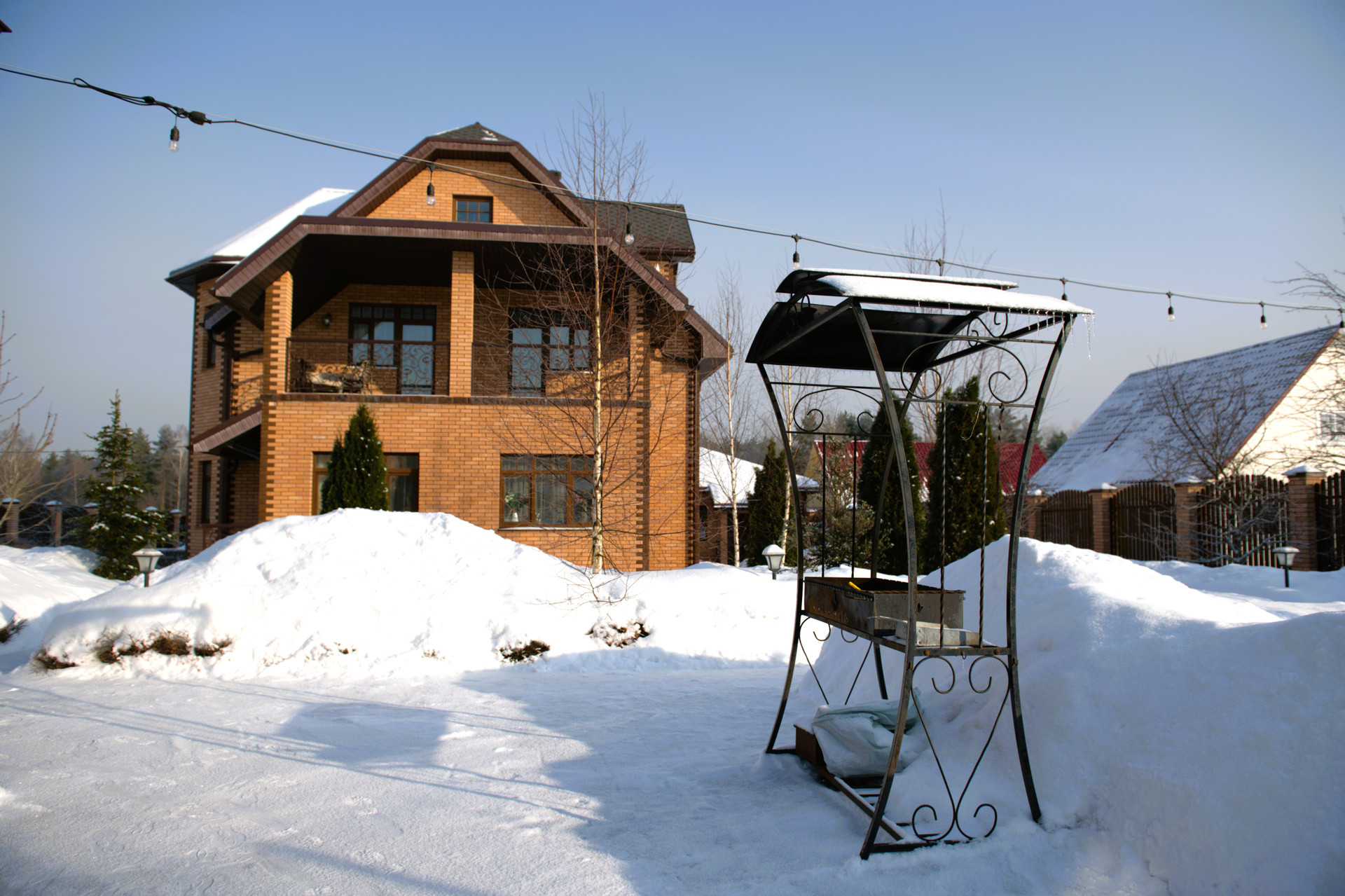 Вокруг участка забор лента глубиной около 1 м. Со столбами из кладочного кирпича. Высота забора 2.5 м.