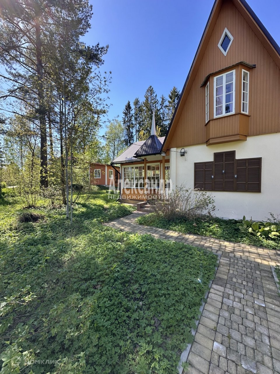 Территория перед домом выложена тротуарной плиткой.