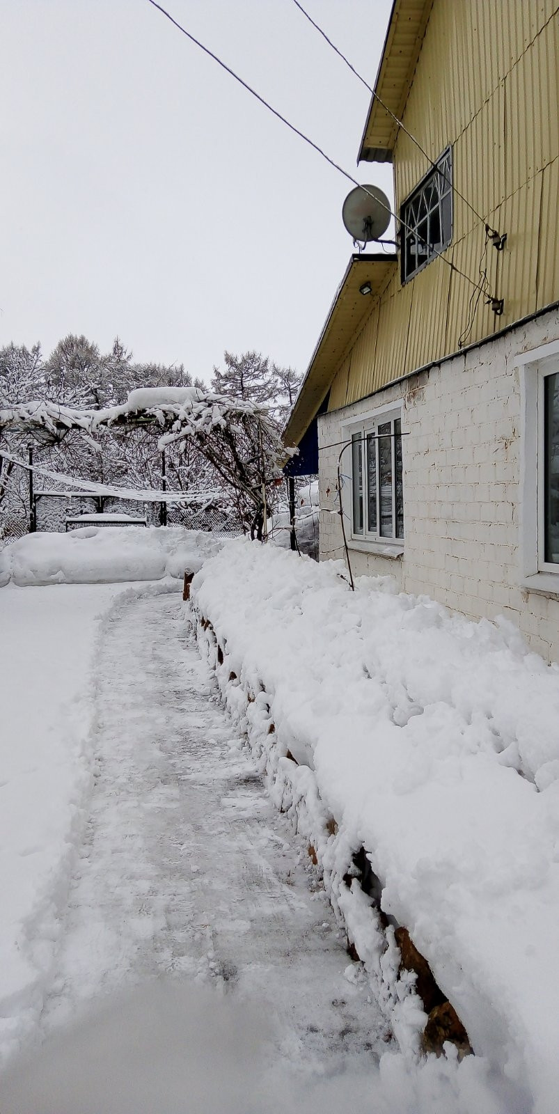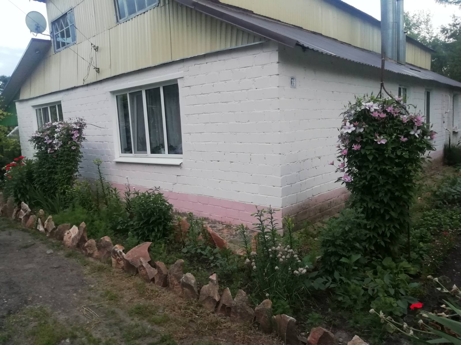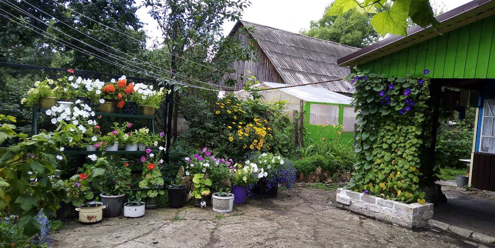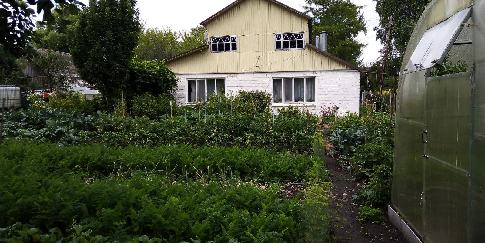 Каркасно щитовой, обложен кирпичем... Квартира в двухквартирном доме, с отдельным входом и раздельными участками, есть подвал и хоз постройки-курчтник, хлев, сеновал.... Плодовые деревья, цветы, кустарники, виноград... Частично с мебелью.... Окна пластиковые, санузел раздельный, кровля крашеный металлопрофиль.есть теплица