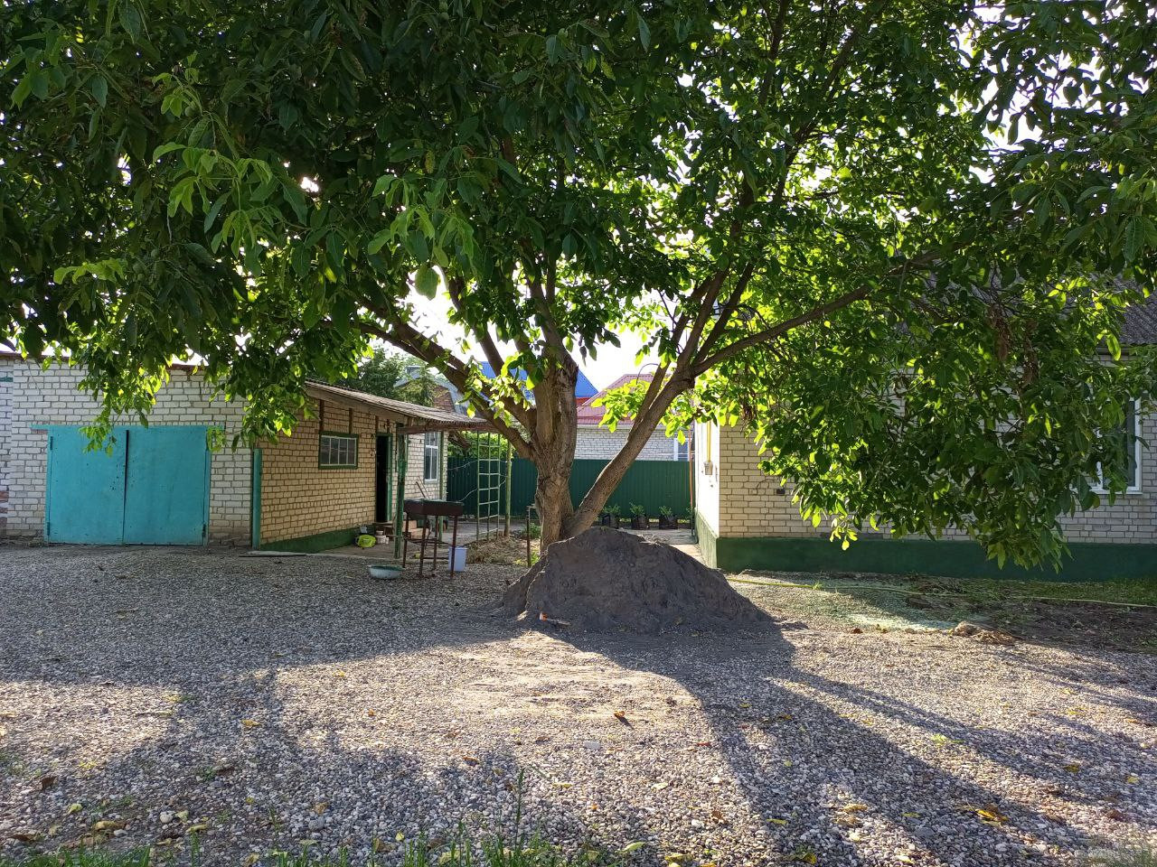 Во дворе декоративный фонтан и большой орешник дающий тень.
