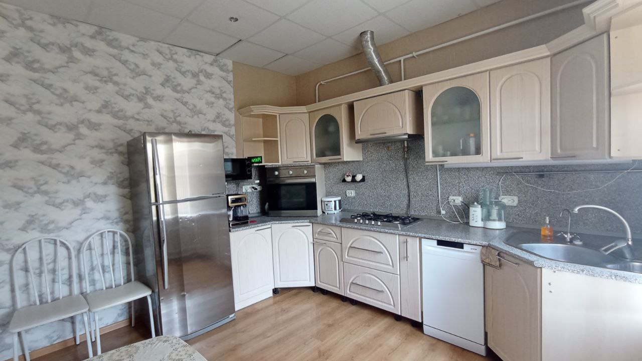 На кухне установлен питьевой фильтр, духовой шкаф, газовая панель и посудомоечная машина. Кухонная мебель и встроенная техника остаются новым хозяевам.