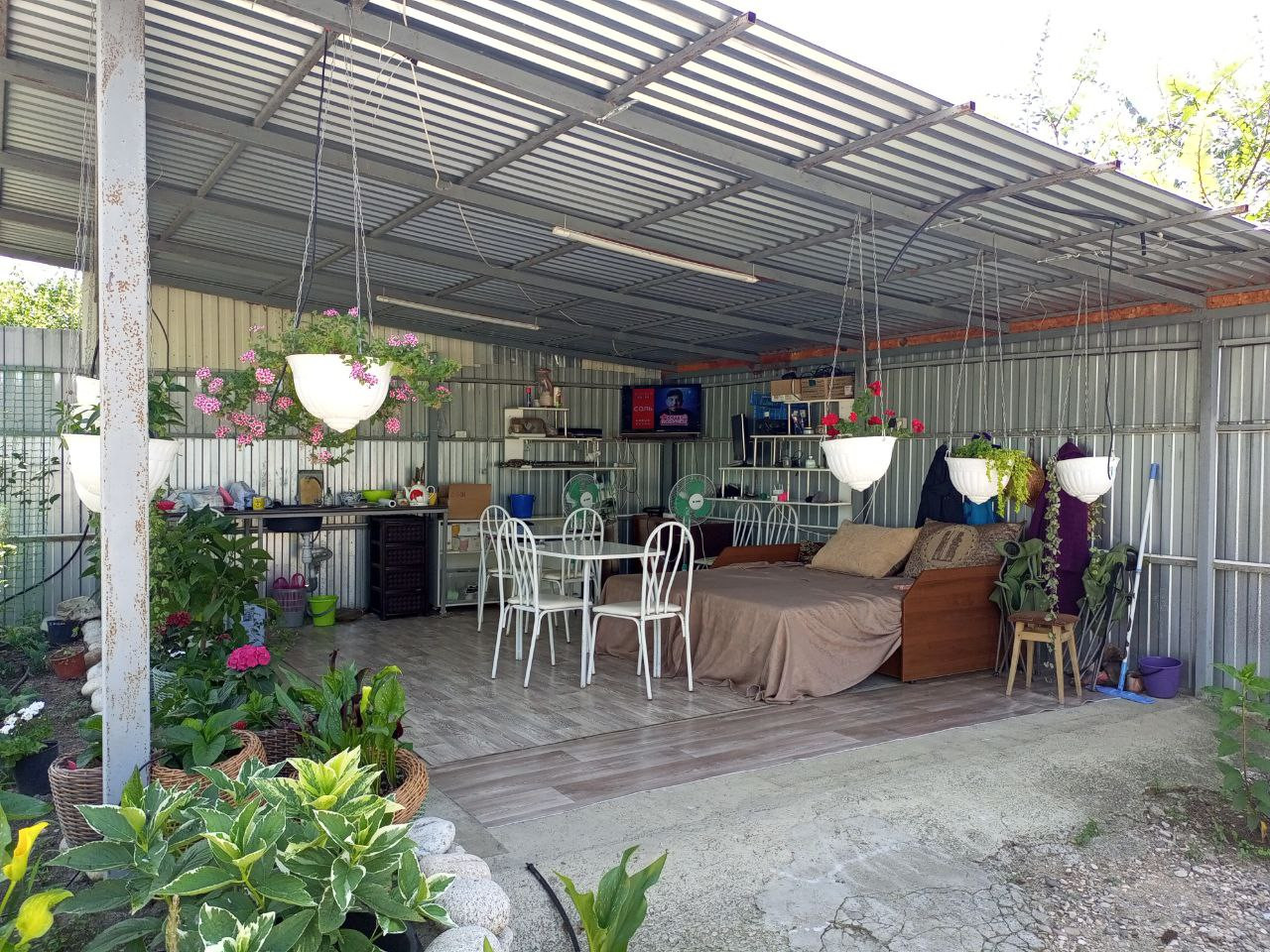 Уличная благоустроенная терраса 10/10, в которой есть вода, свет, интернет и телевидение. Терраса сделана так, что при ливнях вода не попадает на мебель и телевизор.