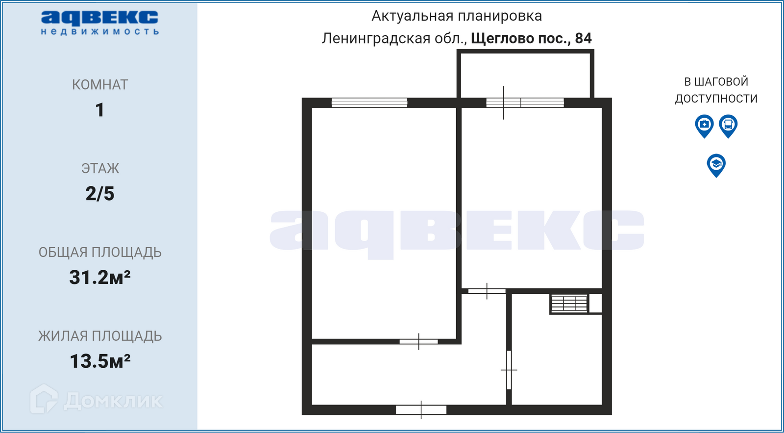 1-комнатная квартира, 31.2 м2, этаж 2 / 5, на продажу в посёлке Щеглово, посёлок Щеглово, 84