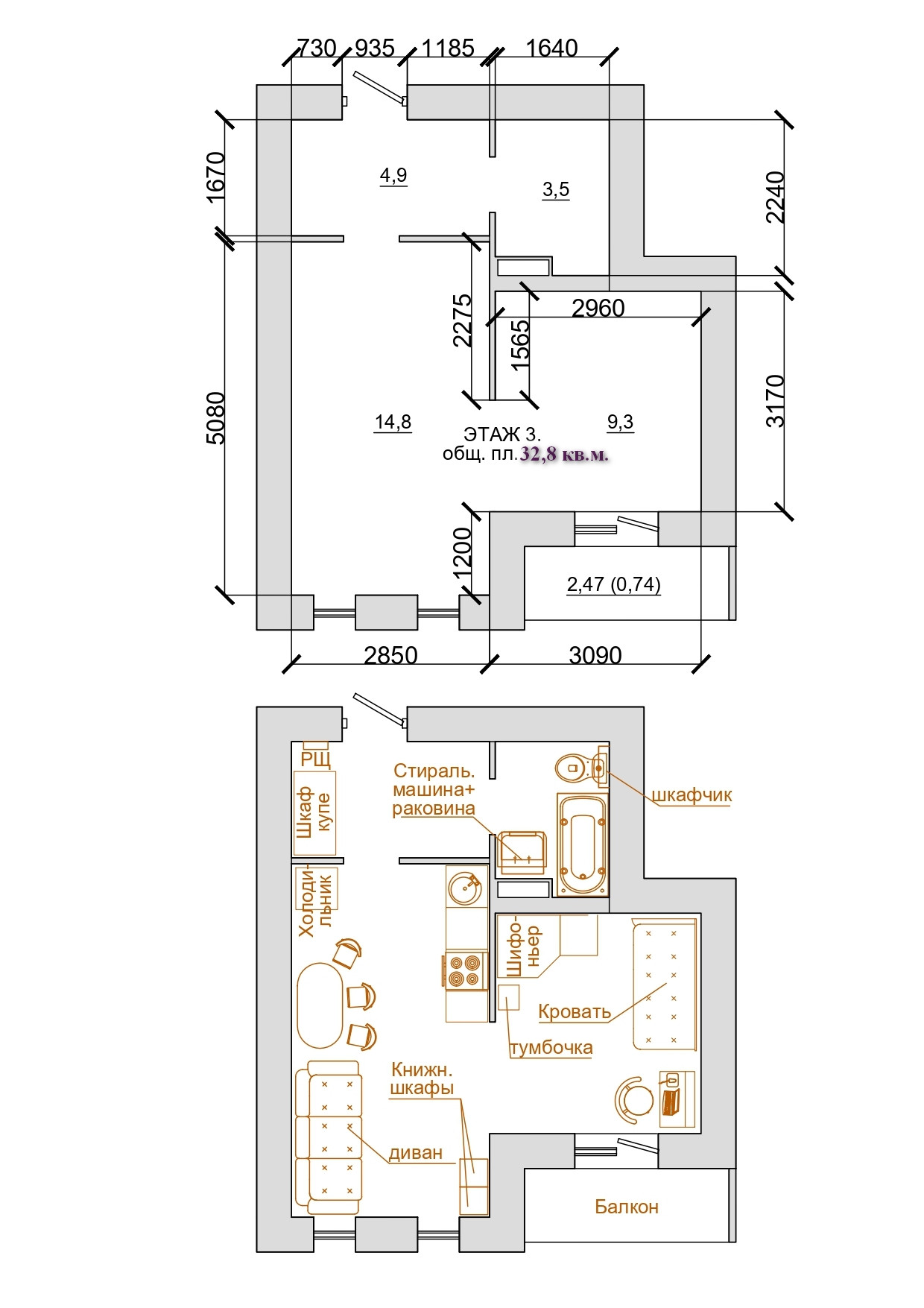 Общая площадь 32.8 м2