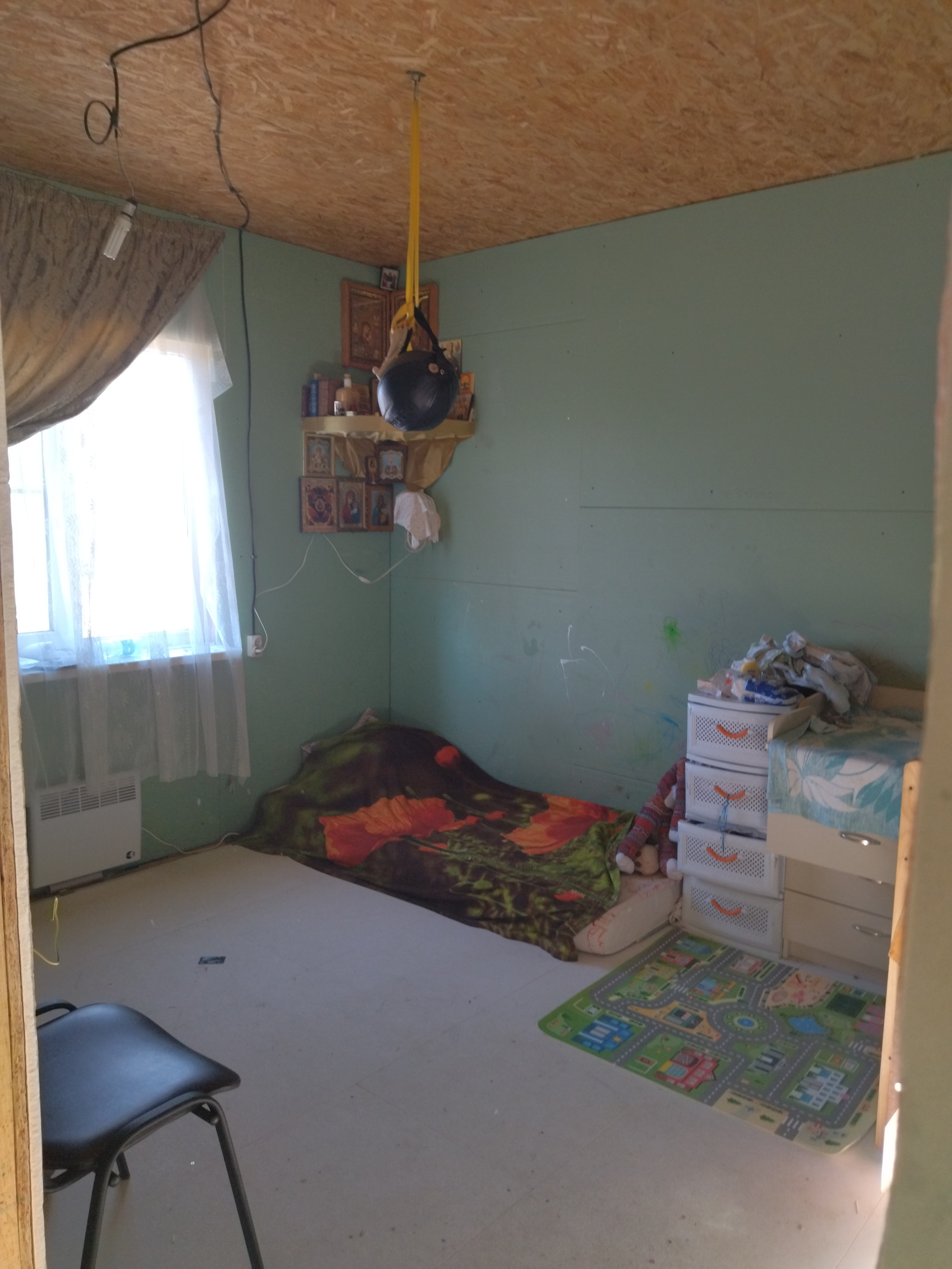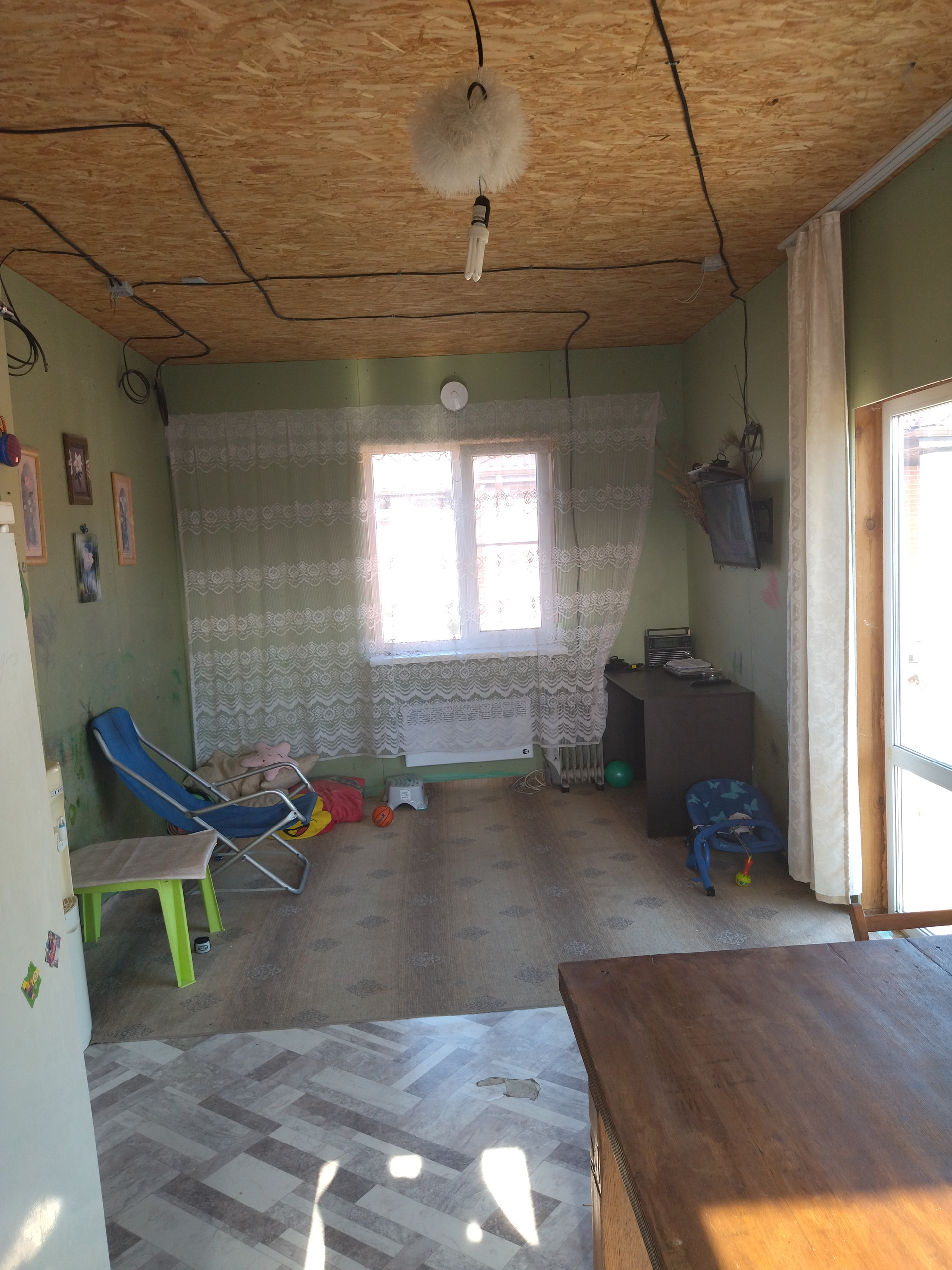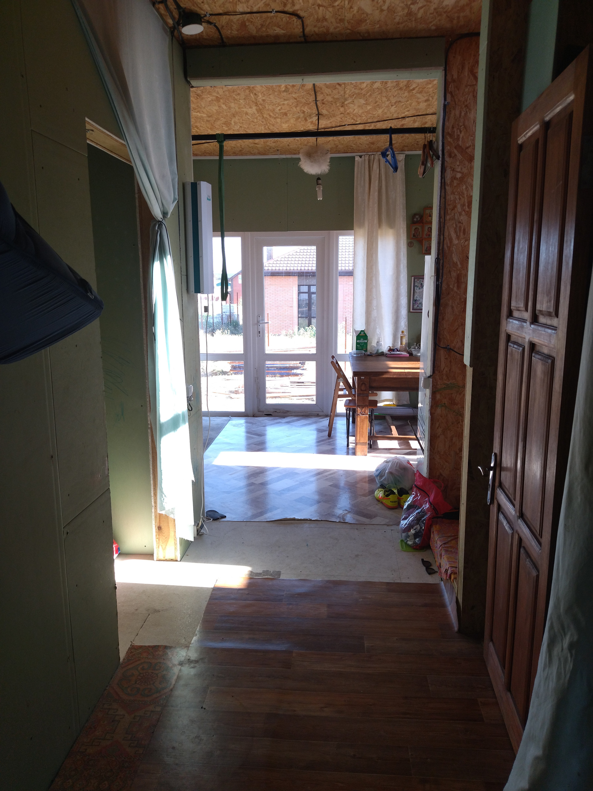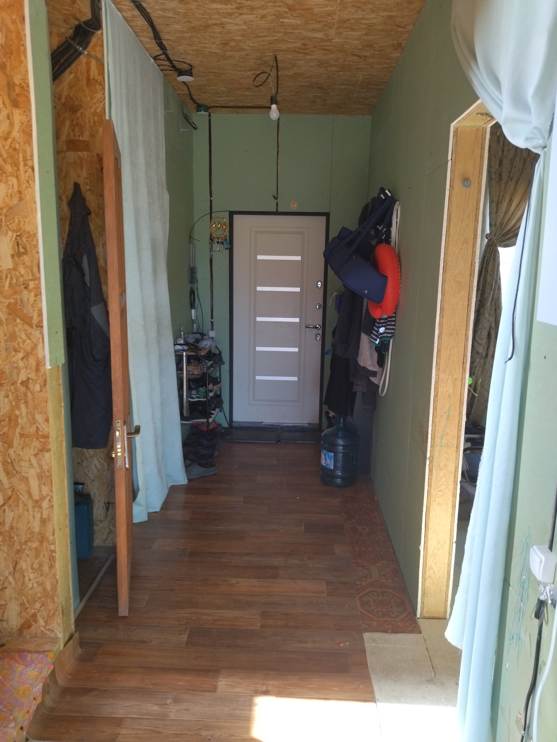 В доме предчистовая отделка - на стенах ГКЛ, на полу гвл супер-пол, проведена и функционирует электрика и сантехника (дом жилой). Отопление от электрических радиаторов. Горячая вода от бойлера. Эл.щиток на 3 фазы.