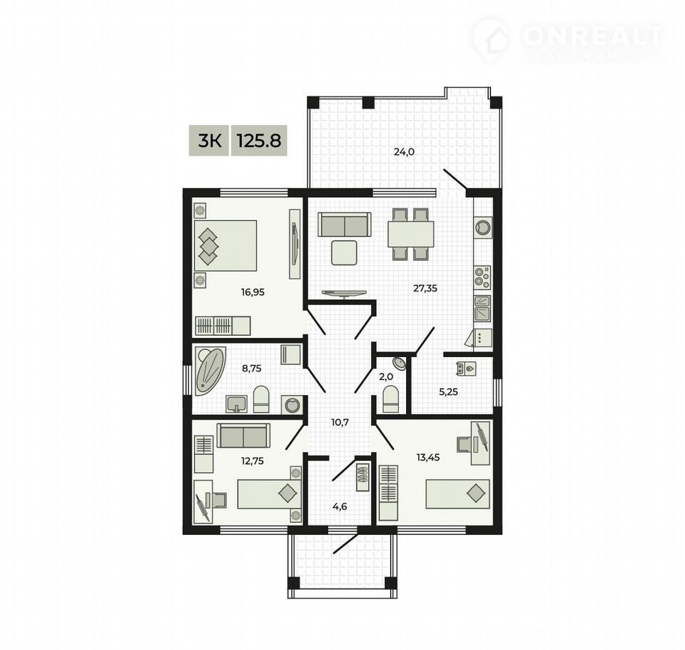 — 3 спальни, гостевой санузел, большая ванная комната с окном, котельная и прихожая