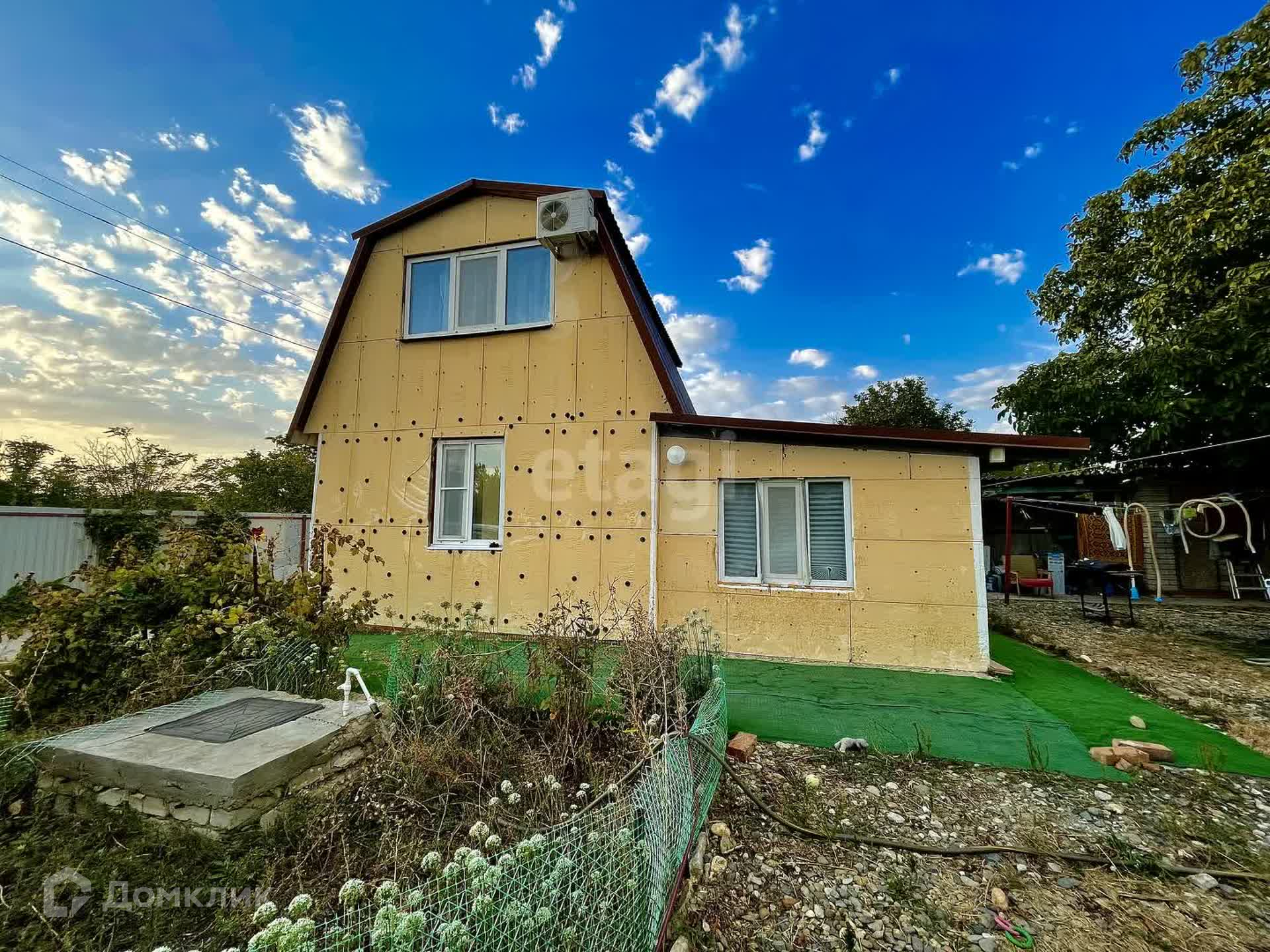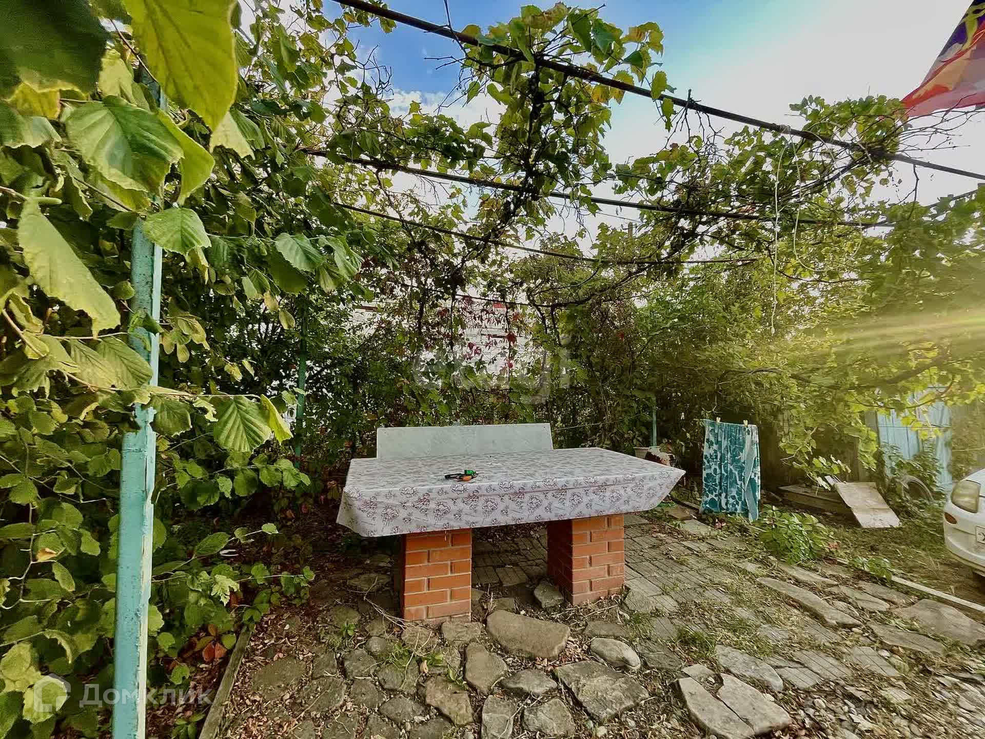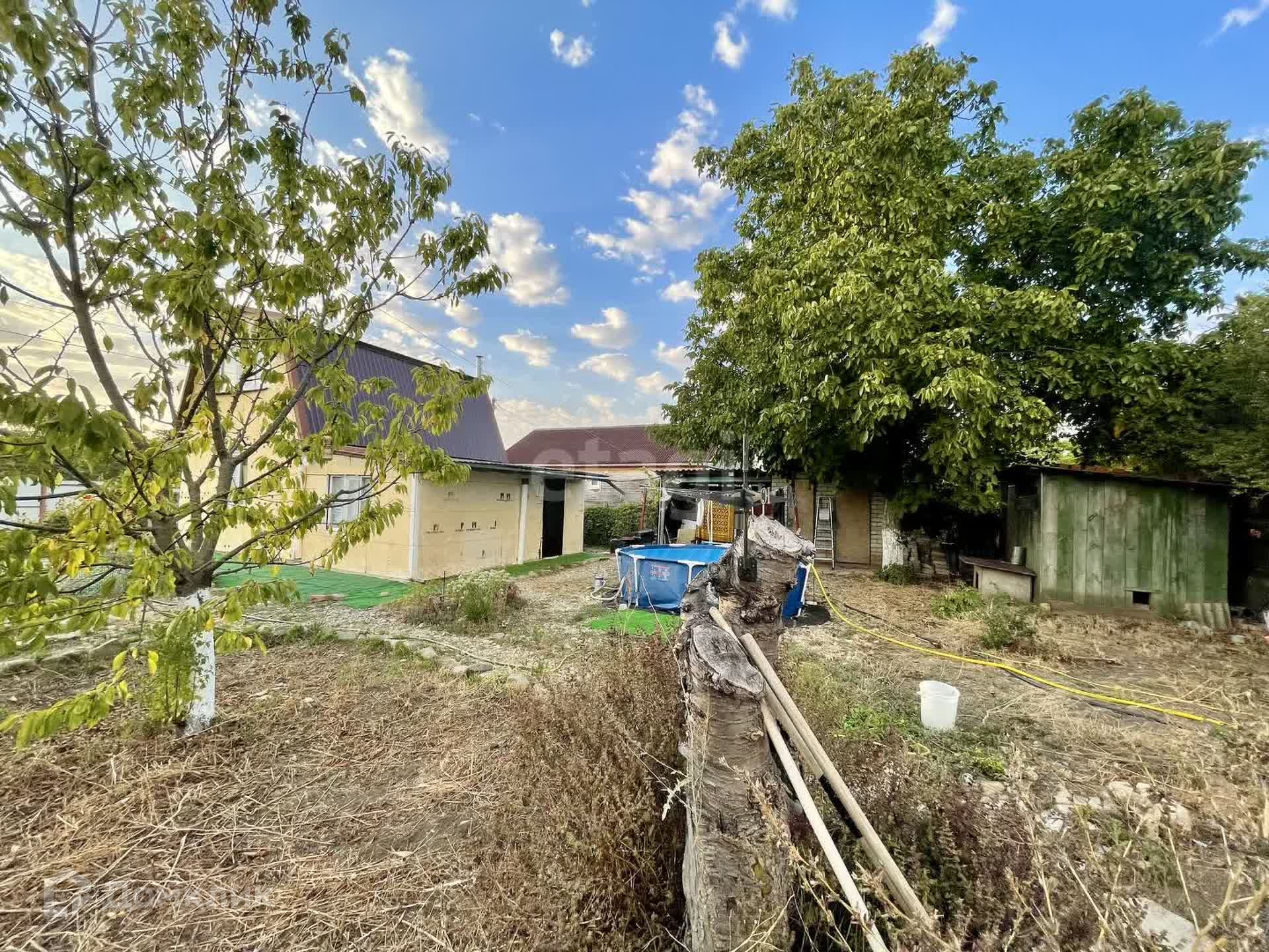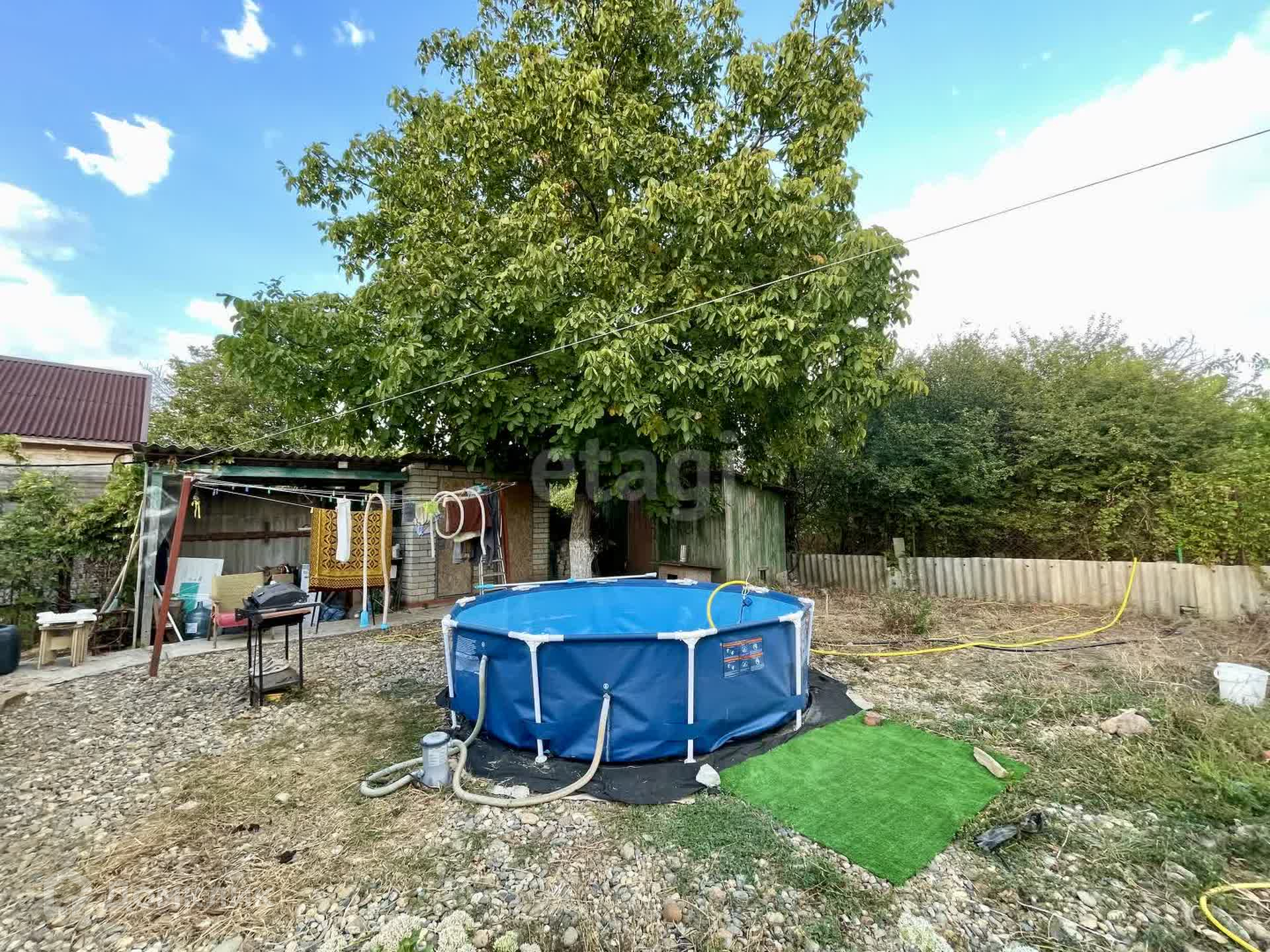 Территория ограждена металлическим забором с фасада, от соседей – сеткой-рабицей. Есть стоянка для 2-х автомобилей. Во дворе уличный туалет и душевая, 2 сарая и беседка с естественным озеленением. Замечательный сад с плодовыми деревьями: финики, фундук, грецкий орех, виноград, черешня.
