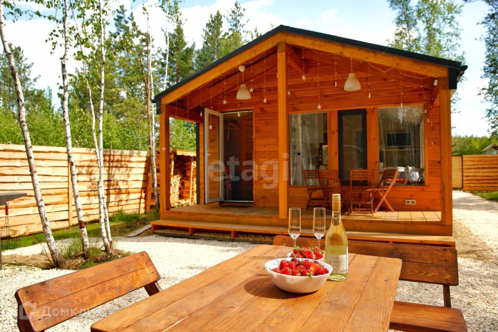 На территории дом 47 м2, баня и горячая купель под открытым небом. Оборудованная мангальная зона. Территория полностью огорожена.