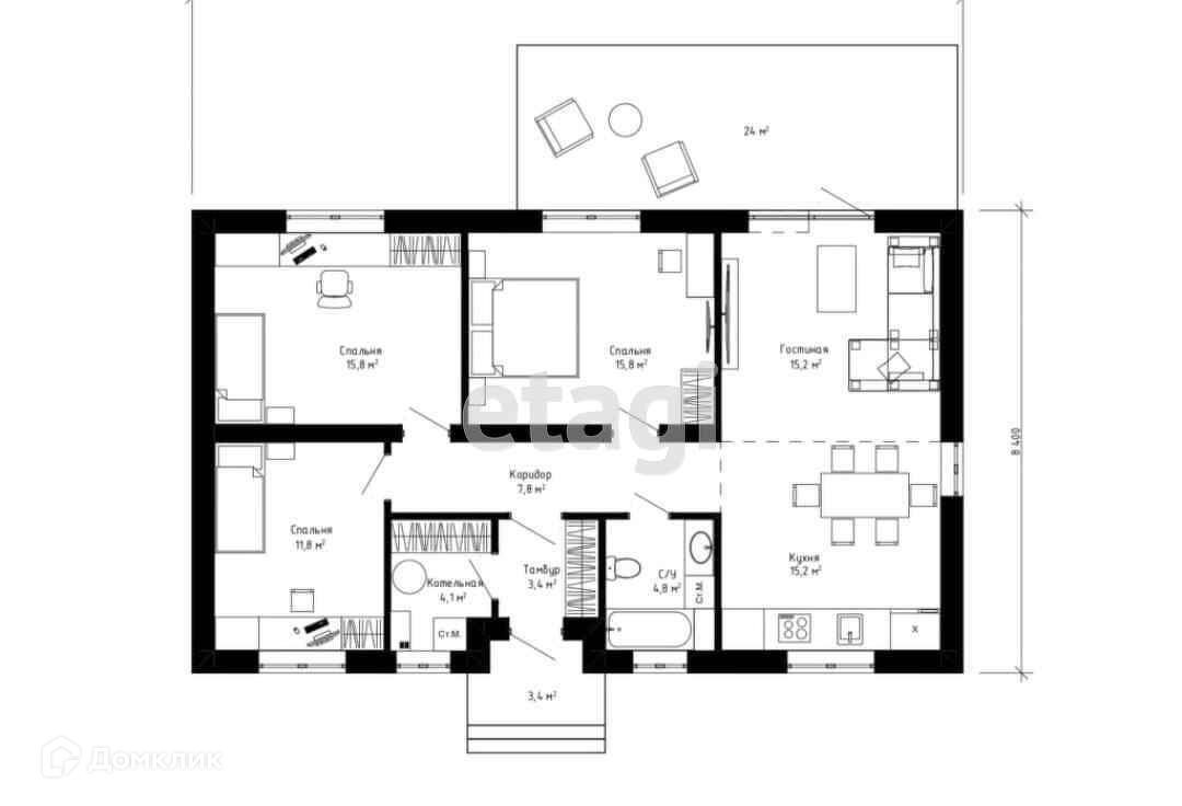 3 спальных комнаты, кухня-гостиная 30м2 с выходом на террасу, котельная, сан-узел.