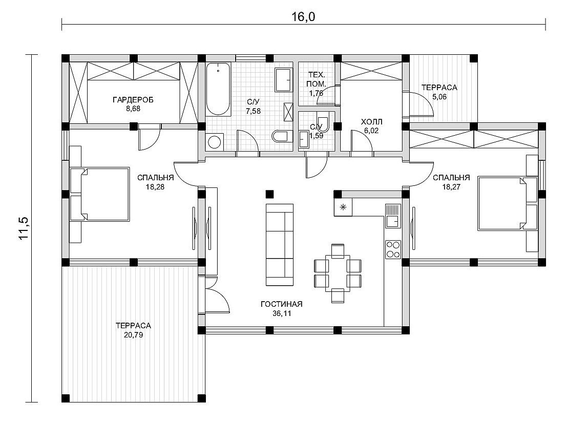 В доме 2 просторных спальни (18 кв. метров), и большая кухня-гостиная (36,1 кв. метров), где очень удобно встречать гостей.