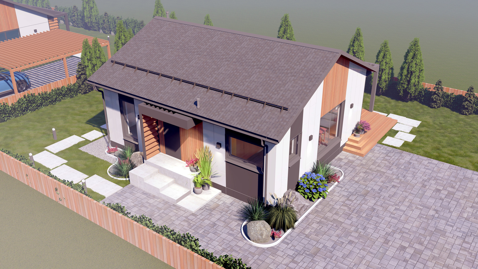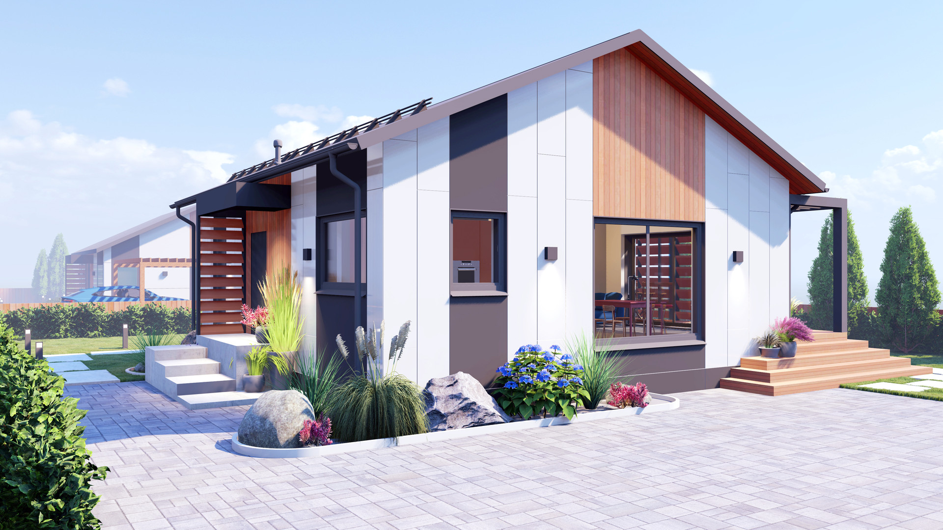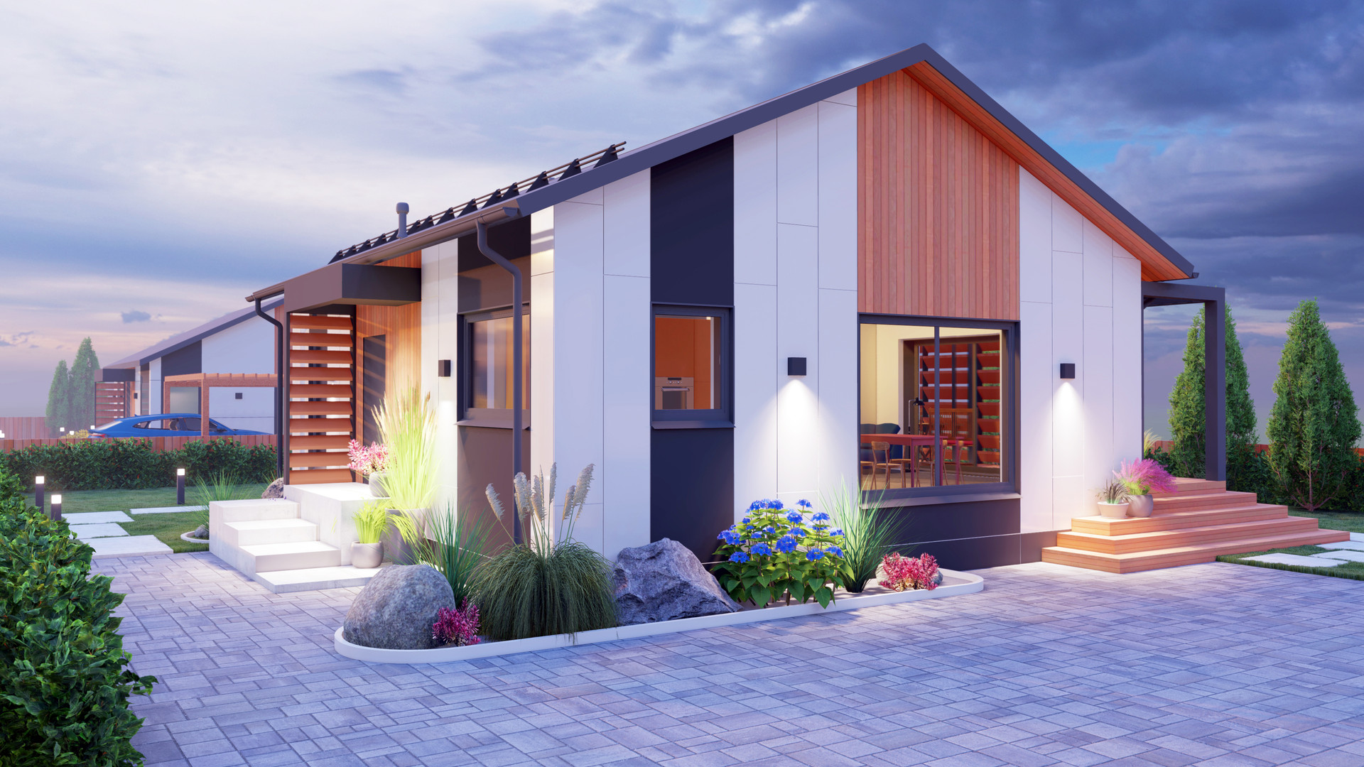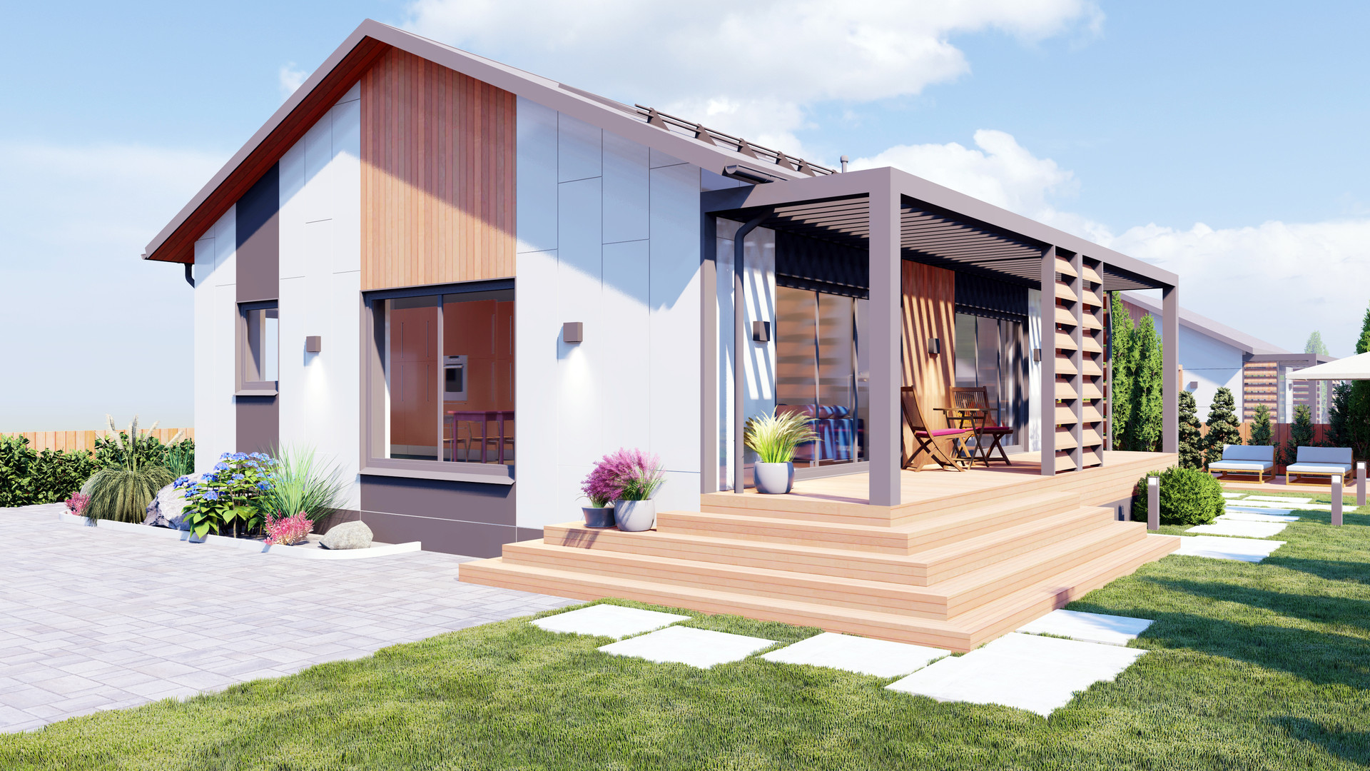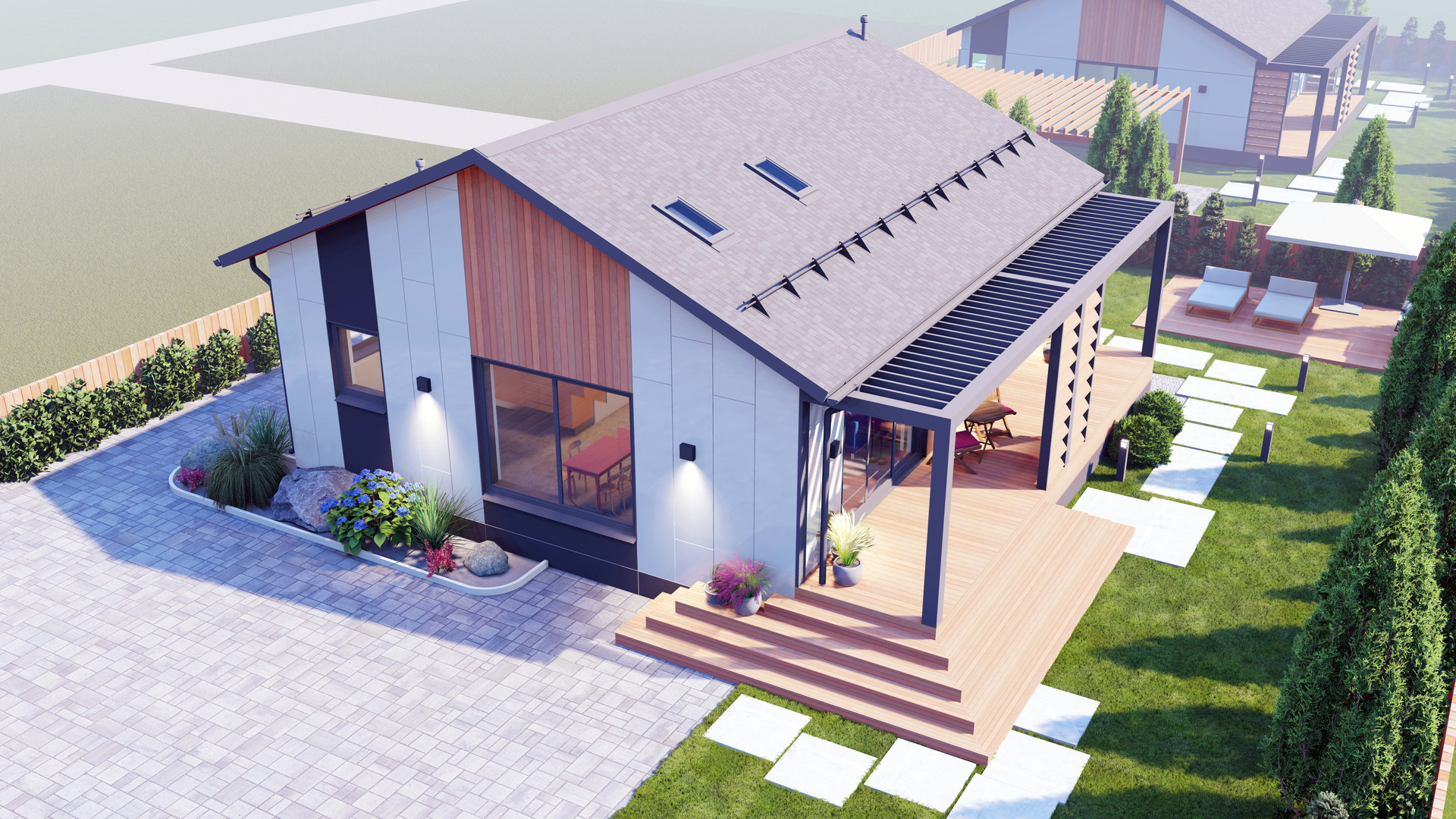 Проект СДК-95 реализует ваши потребности с удобным планировочным решением. В доме, с общей площадью 95 м2 реализованы две спальни, один санузел, гардеробная, котельная и невероятно светлая гостиная со вторым светом, совмещенная с кухней. Помимо этого, вы получаете террасу с выходом из спальни и гостиной. Фасад дома комбинированный, сочетание теплого планкена с белым металлом, что придает дому уникальность и оставляет приятное впечатление от все архитектуры здания.